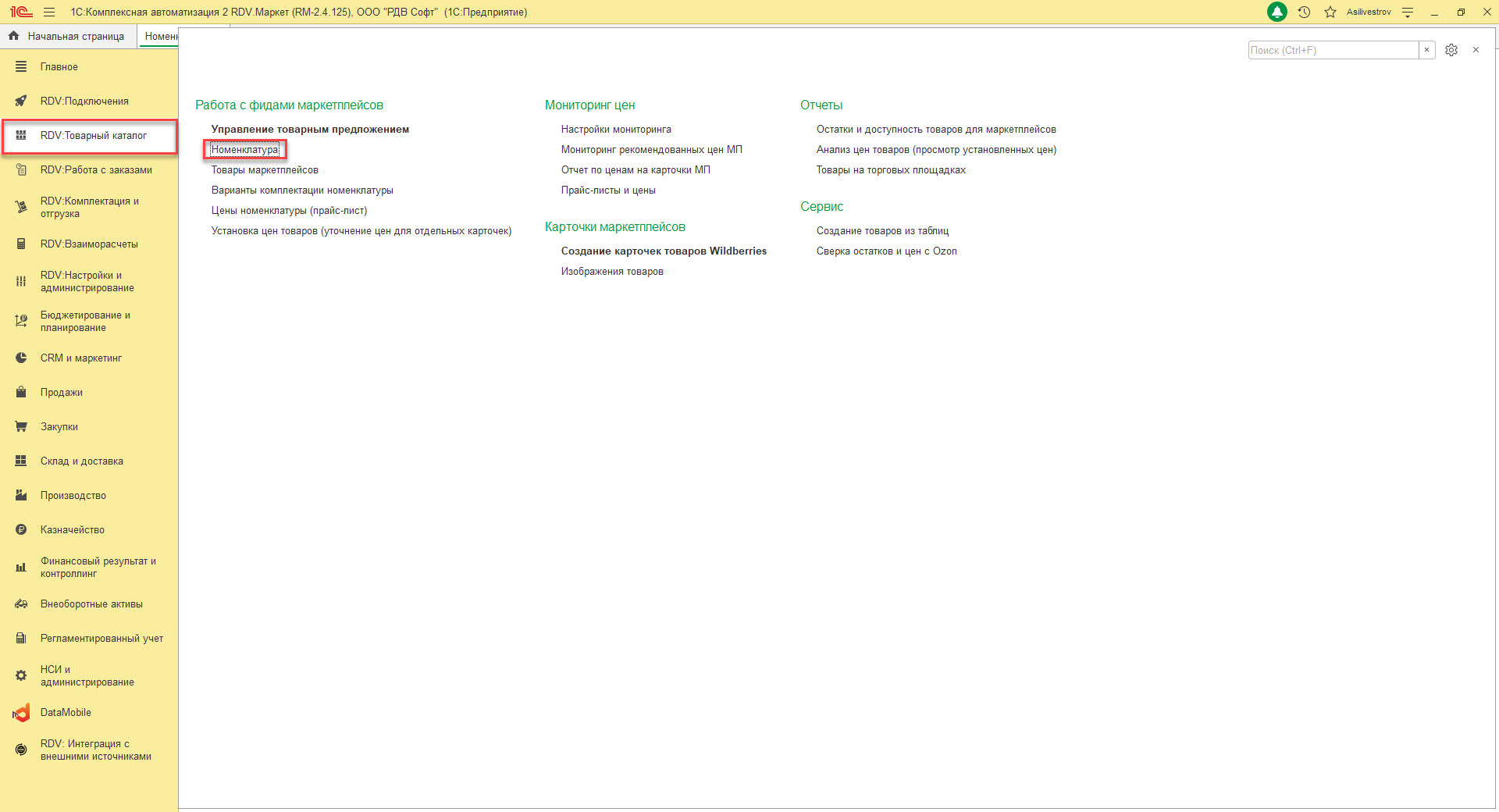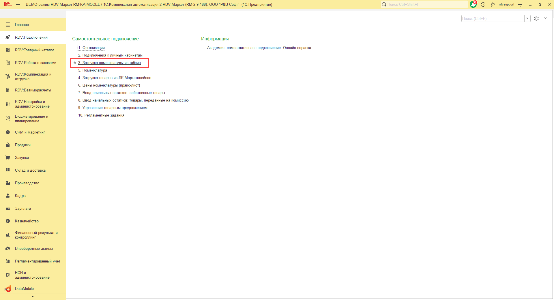Для этого перейдите в раздел "RDV: Подключения" - "Загрузка номенклатуры из таблиц":
