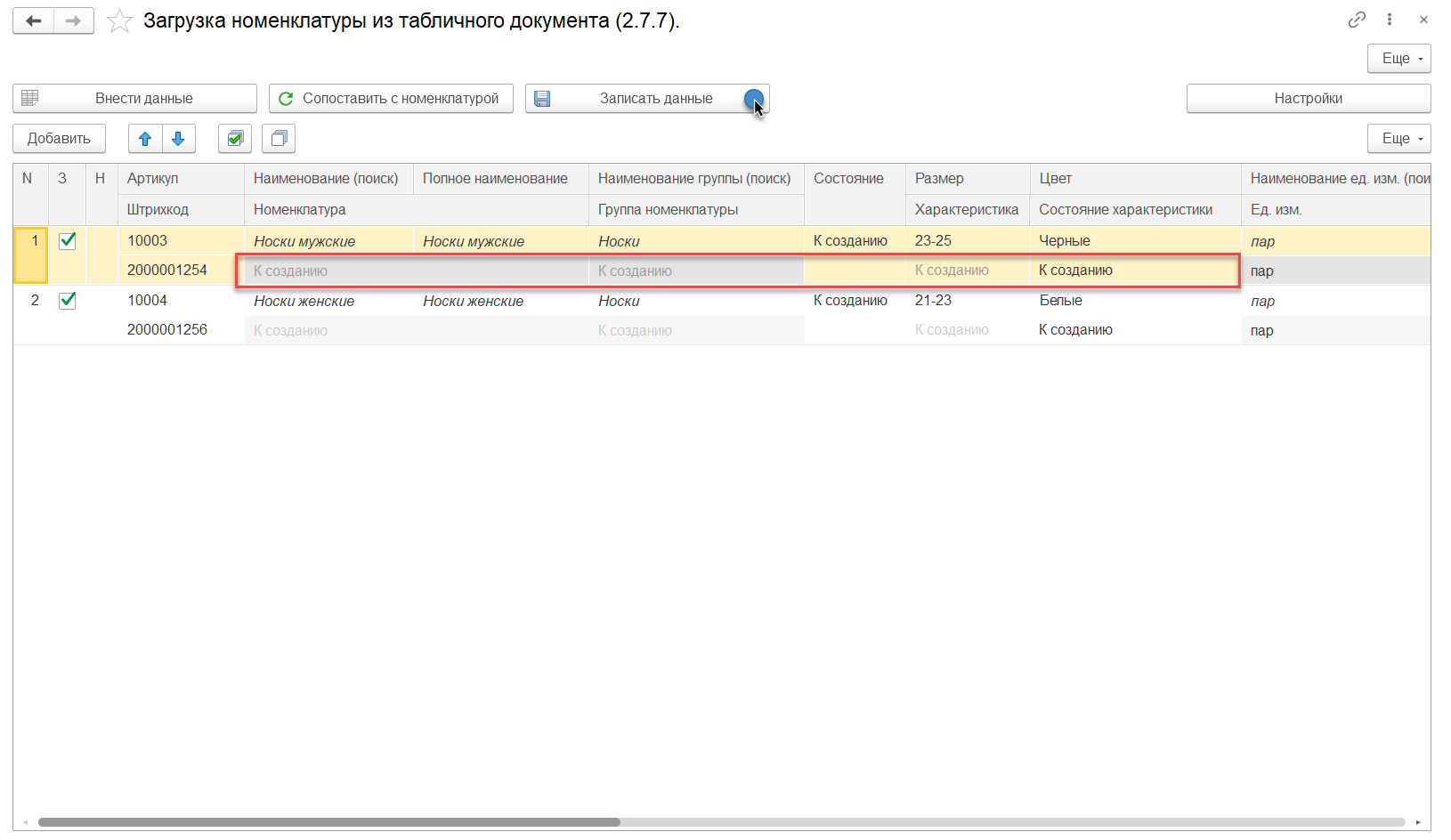 - В случае, если товар ранее не загружался, то в строке будет указано "Номенклатура будет создана"