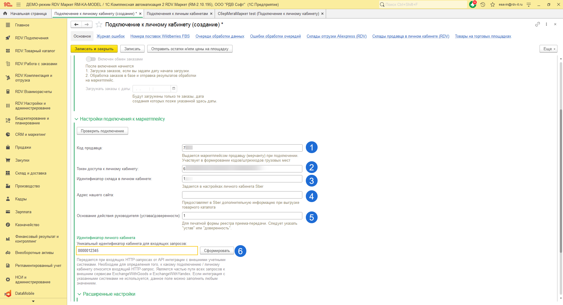 6. Уникальный идентификатор кабинета для входящих запросов - Локальный идентификатор личного кабинета, необходимо задать любое цифровое значение (оно должно отличаться от идентификаторов других подключенных личных кабинетов).