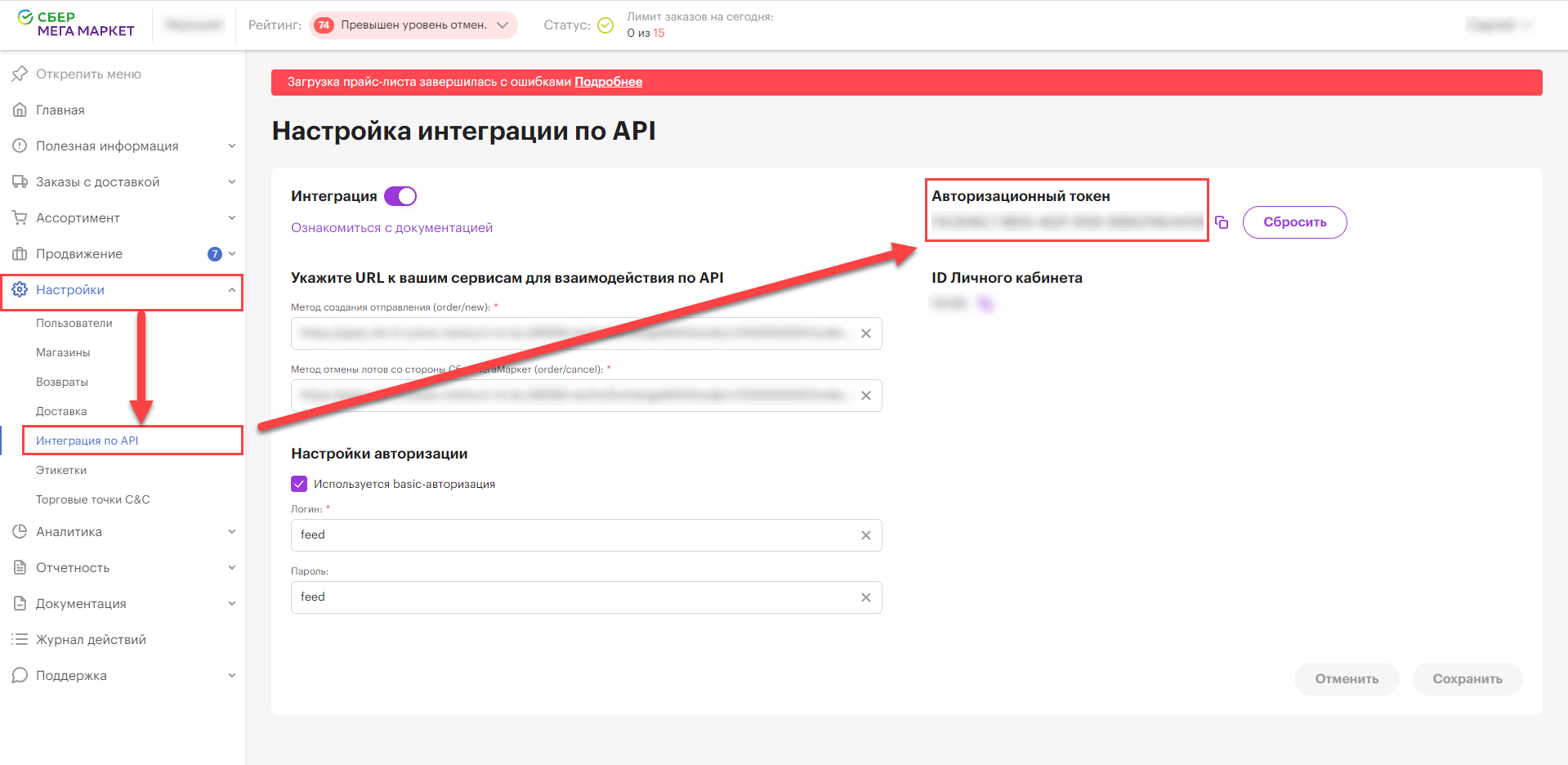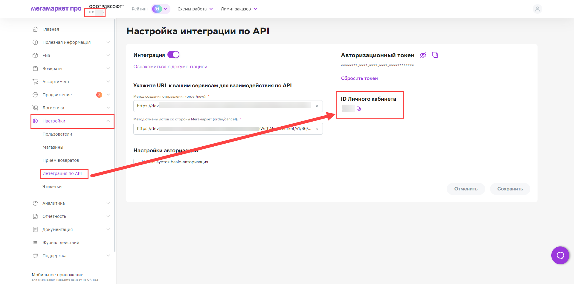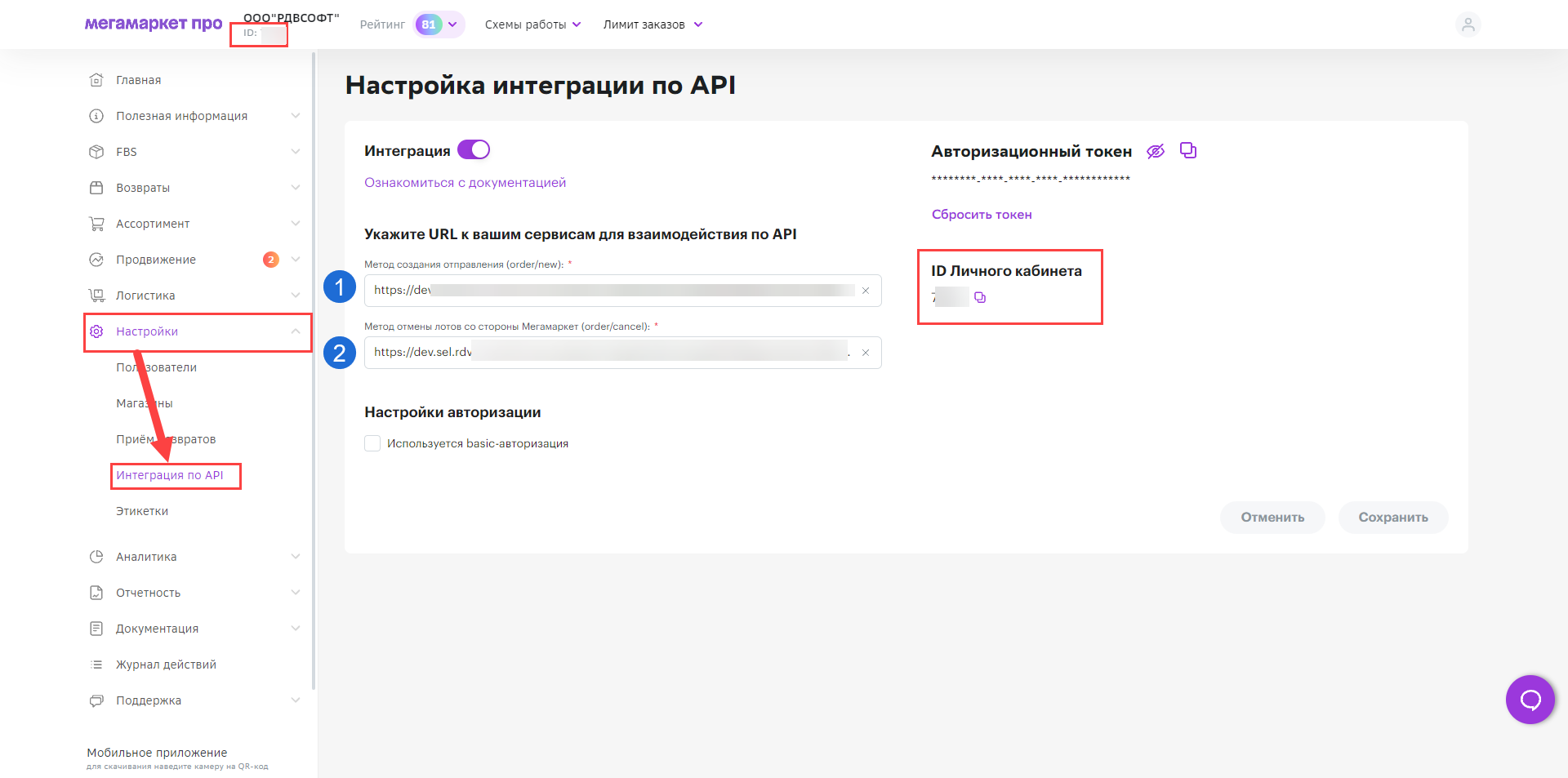 2. Токен доступа к личному кабинету - Указываем токен доступа к личному кабинету. Его можно найти в личном кабинете МегаМаркет, в разделе «Настройки» — «Интеграция по API»
