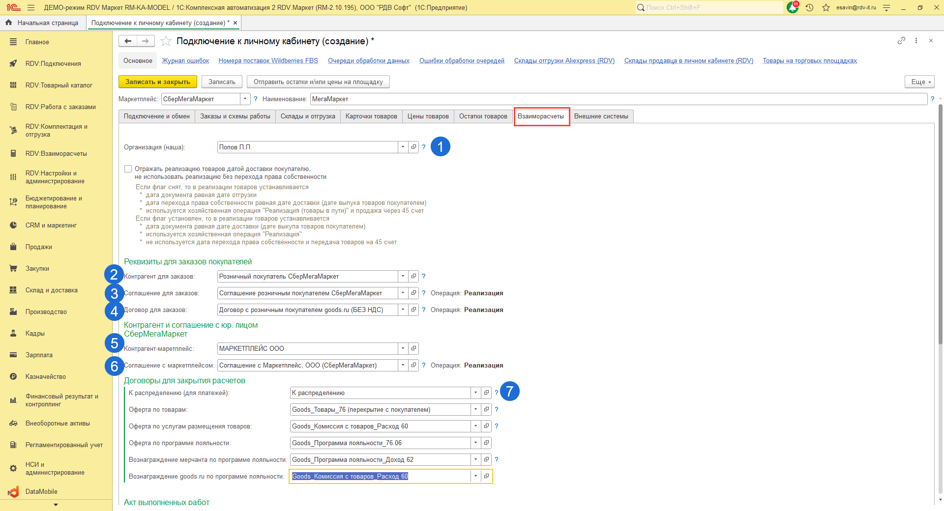 На данной вкладке указываются настройки для ведения взаиморасчетов с площадкой: контрагенты, договоры, соглашения и прочие настройки расчетов с площадкой.