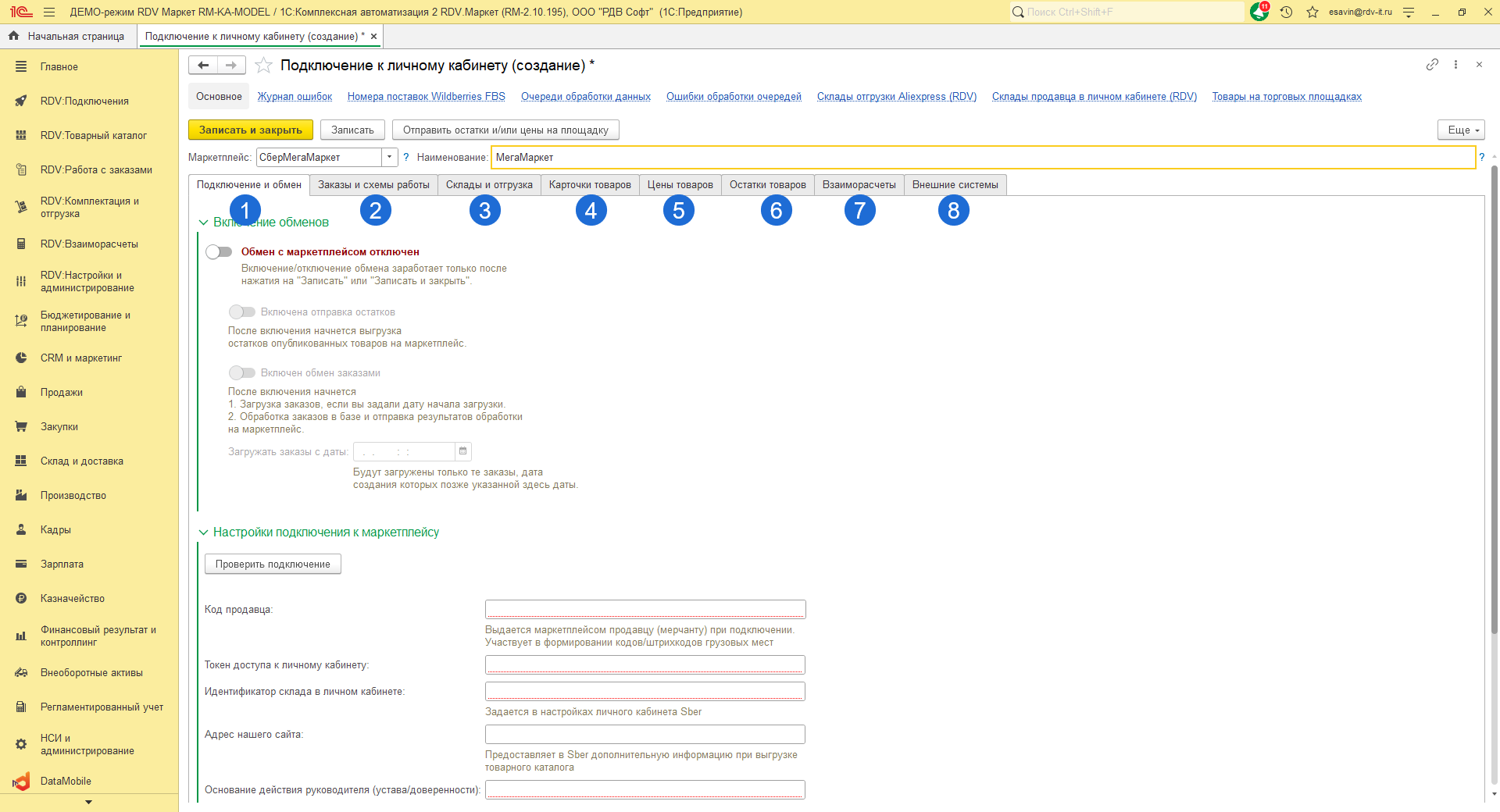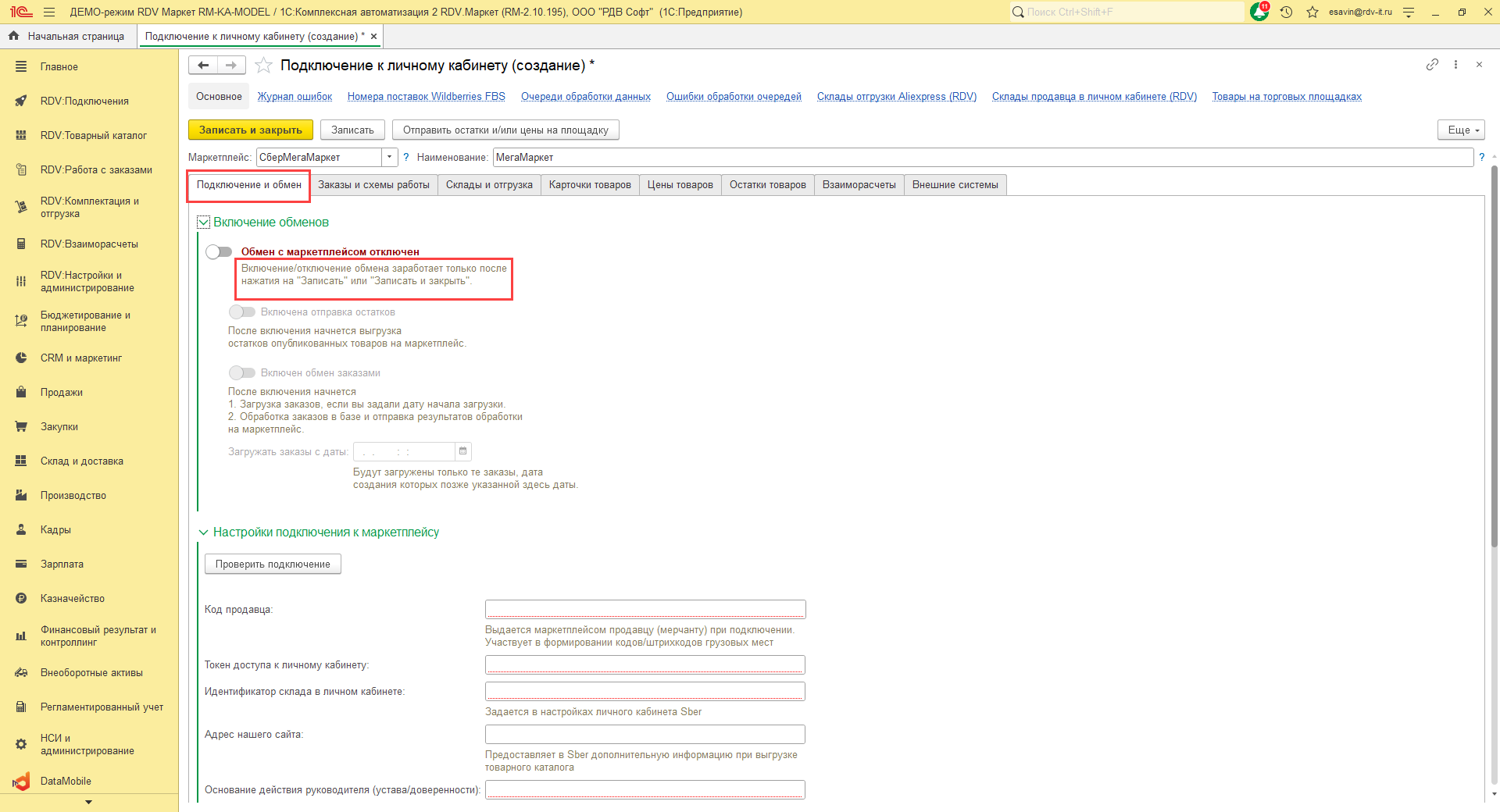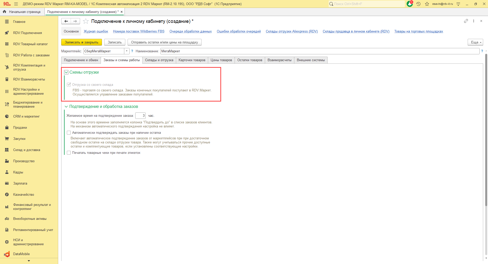 В данный момент модуль RDV.Маркет поддерживает работу с маркетплейсом МегаМаркет только по схеме отгрузки FBS - "Отгрузка со своего склада", данная настройка установлена по умолчанию.