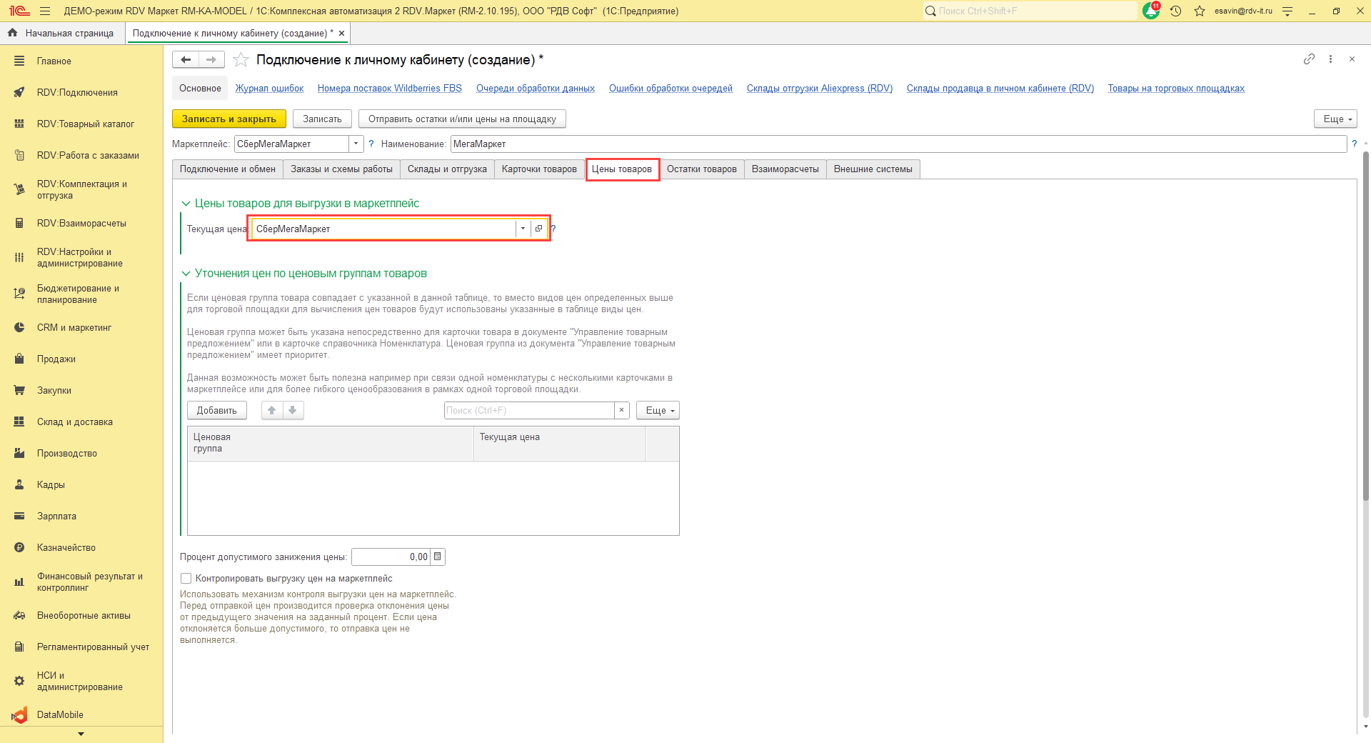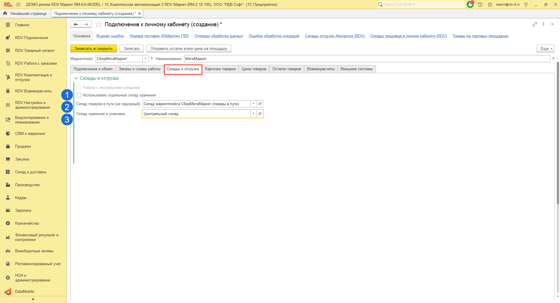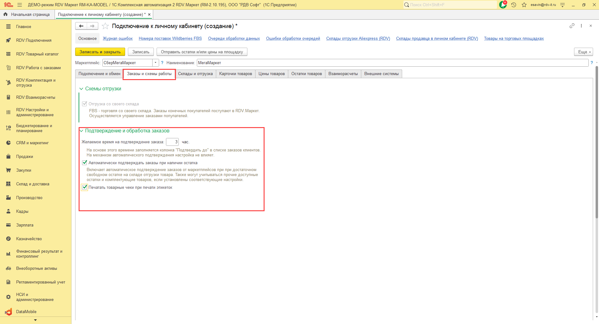 В данный момент модуль RDV.Маркет поддерживает работу с маркетплейсом МегаМаркет только по схеме отгрузки FBS - "Отгрузка со своего склада", данная настройка установлена по умолчанию.