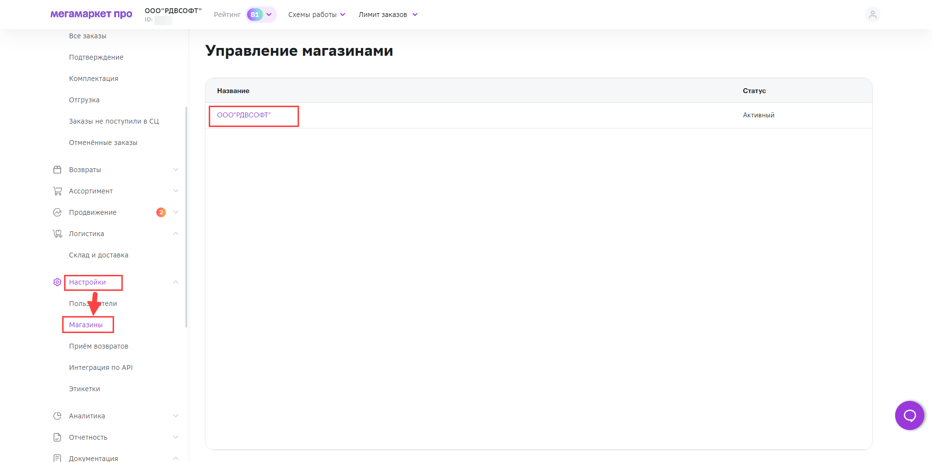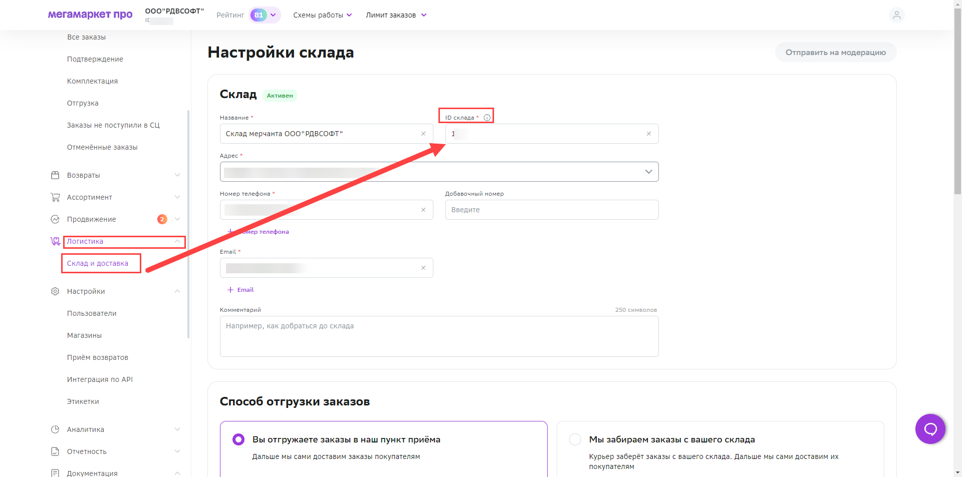 3. Идентификатор склада в личном кабинете - Указываем идентификатор склада в Маркетплейсе. Его можно найти в личном кабинете МегаМаркет, в разделе «Логистика» - «Склад и доставка»- «ID склада».