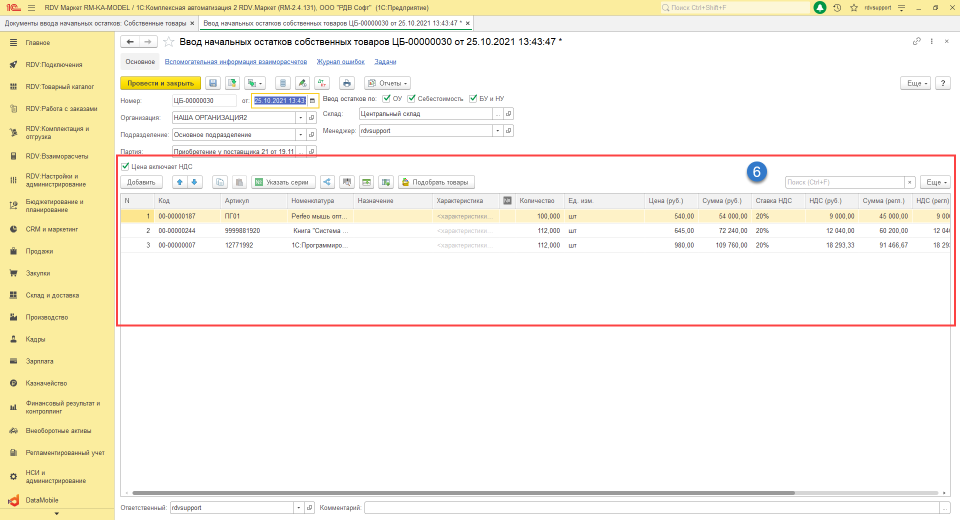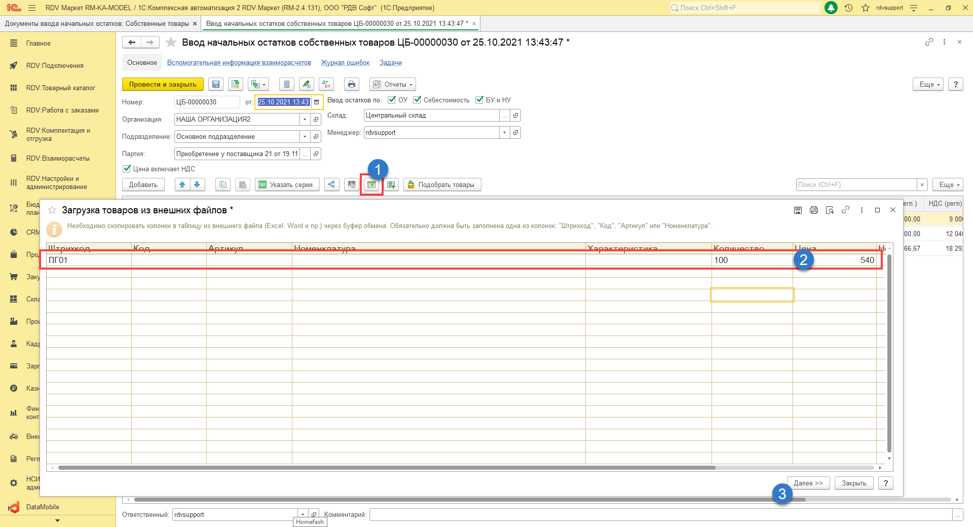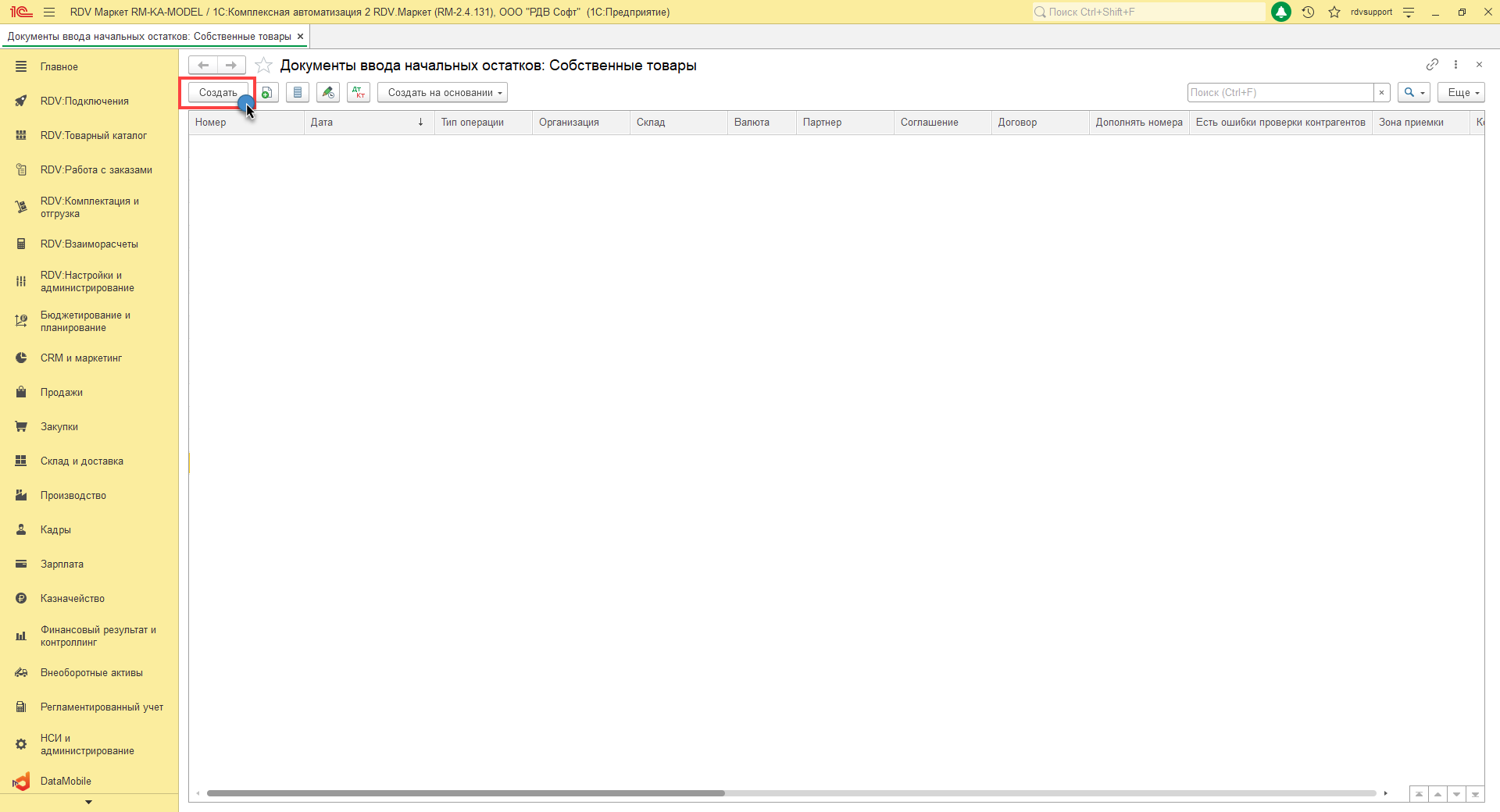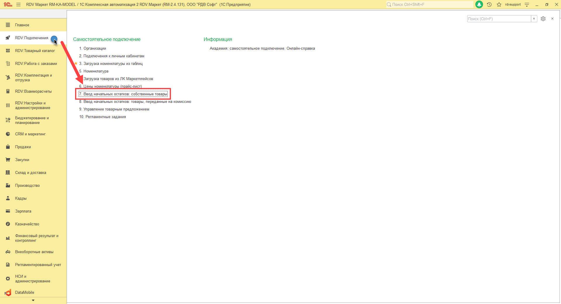 Для ввода начальных остатков собственных товаров (остатки товаров, которые находятся на складе хранения организации) необходимо перейти в раздел "RDV:Подключения" - "Ввод начальных остатков: собственные товары":