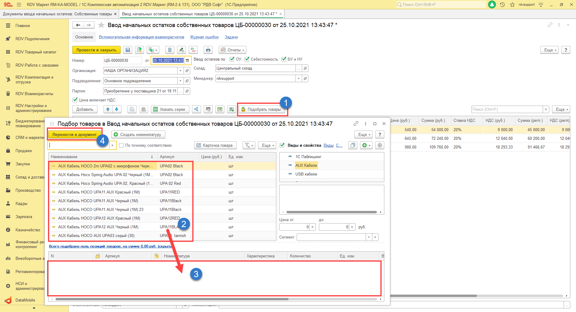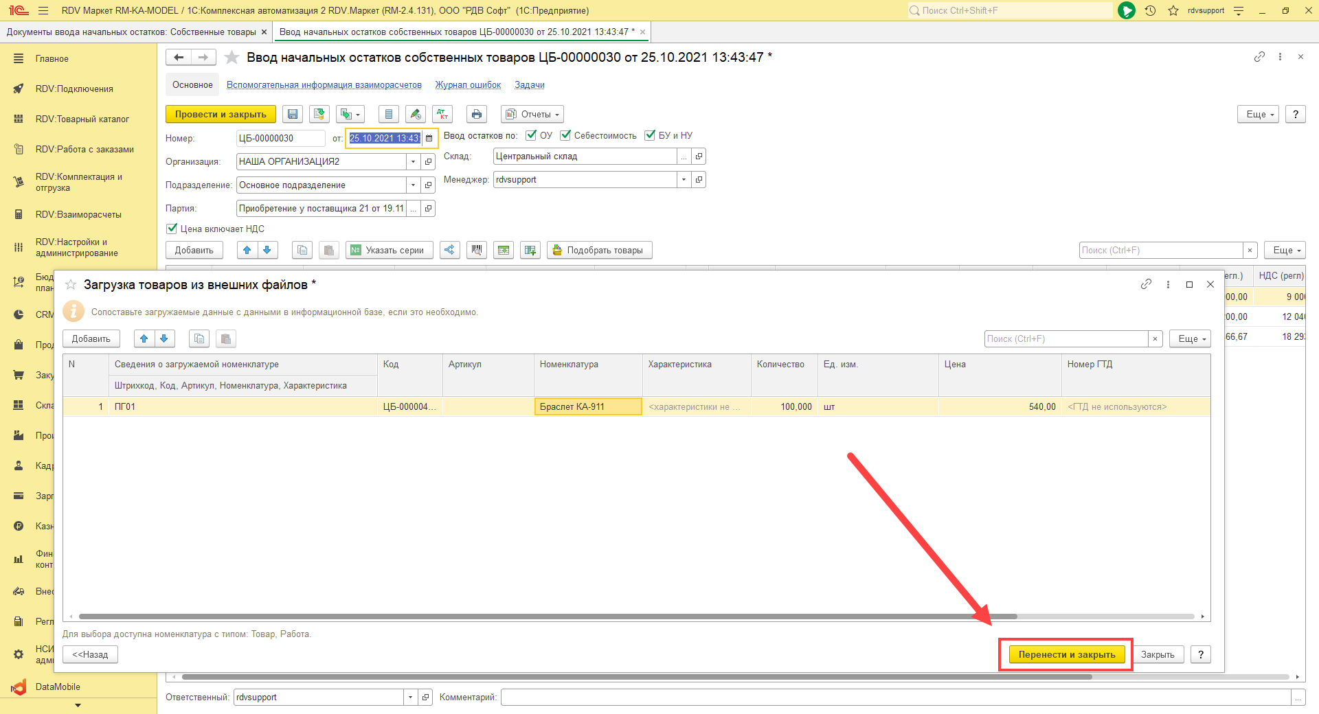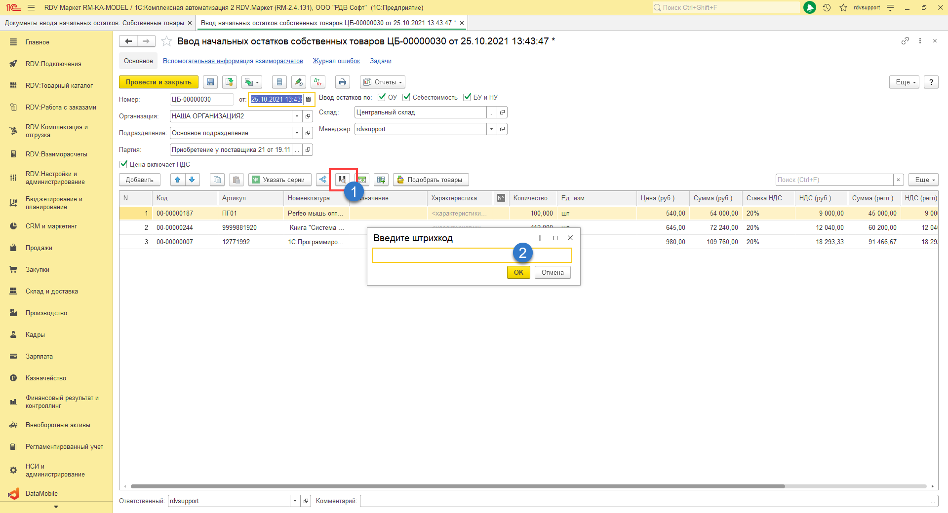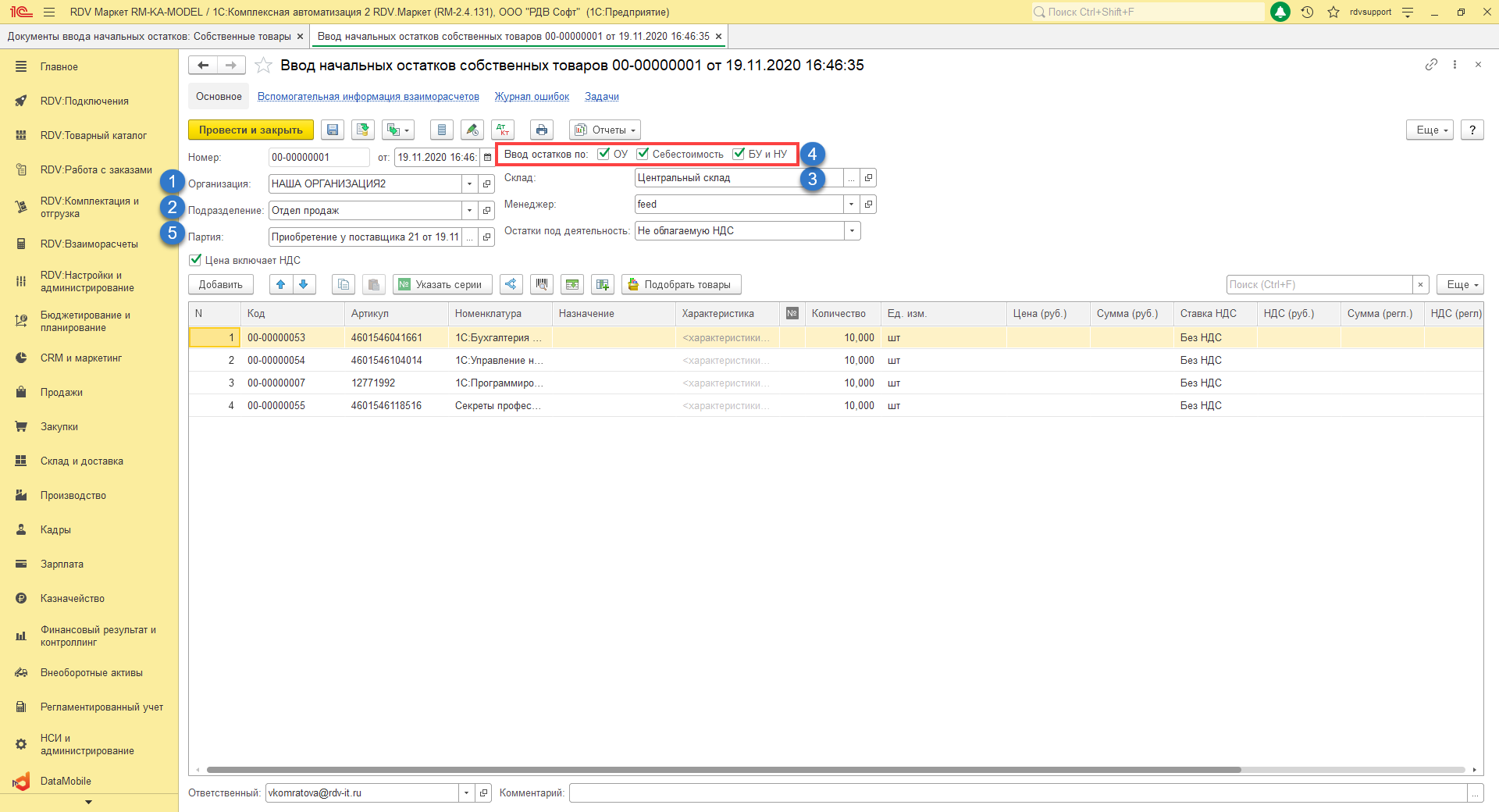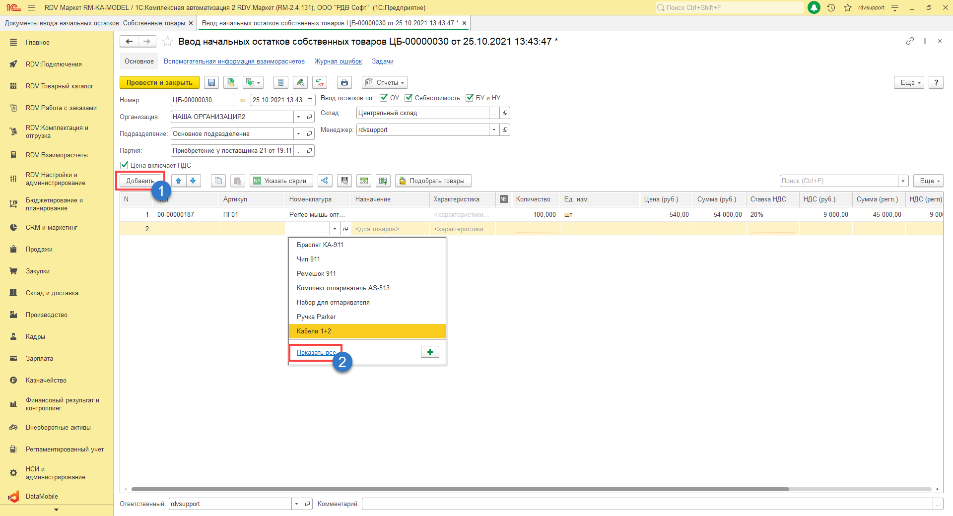 Для ввода начальных остатков собственных товаров (остатки товаров, которые находятся на складе хранения организации) необходимо перейти в раздел "RDV:Подключения" - "Ввод начальных остатков: собственные товары":