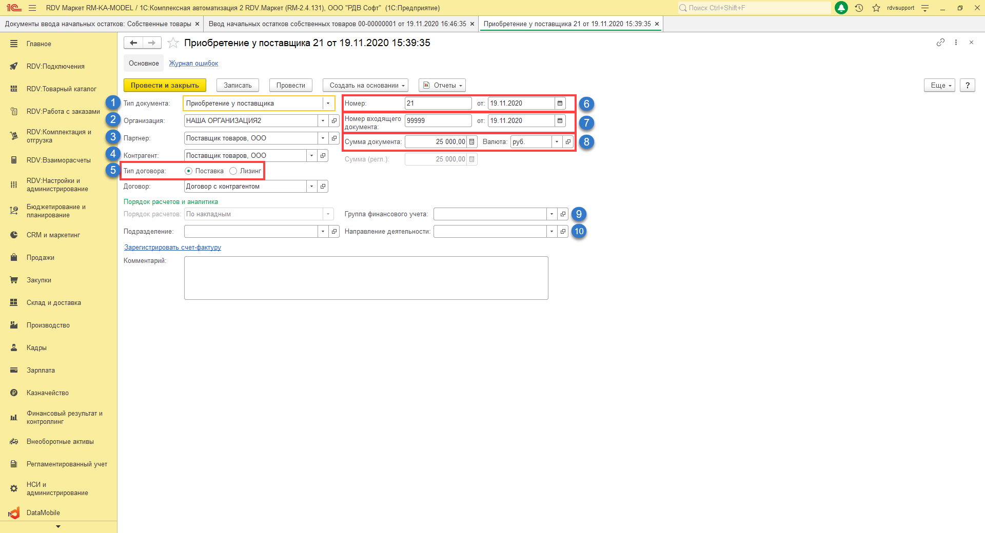 Необходимо создать новый документ. Документ, указанный в качестве партии при вводе остатков является документом возникновения расходов для целей упрощенной системы налогообложения (УСН) для организаций, ведущих учет по УСН и в качестве объекта налогообложения применяющих вариант расчетов "Доходы минус расходы", а так же используется для целей раздельного учета НДС. В качестве партии может быть выбран Первичный документ с типом "Приобретение у поставщика" или "Внутренняя накладная". В документе "Партия" с типом документа "Приобретение у поставщика" необходимо заполнить поля: