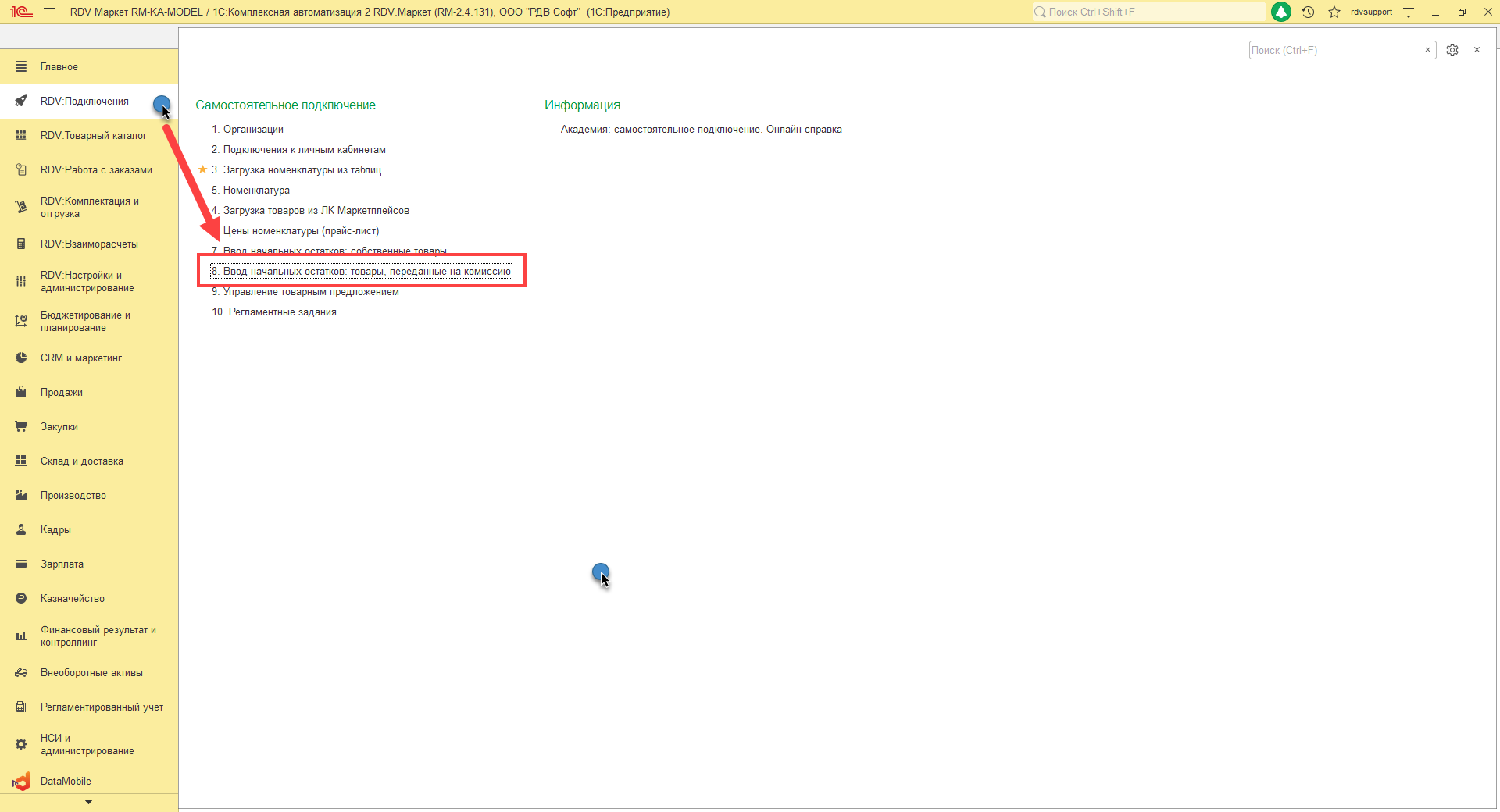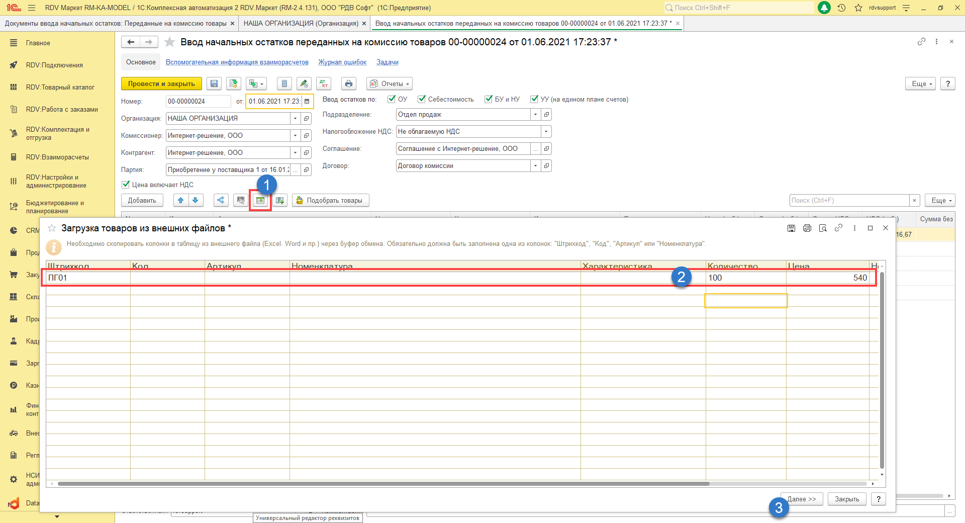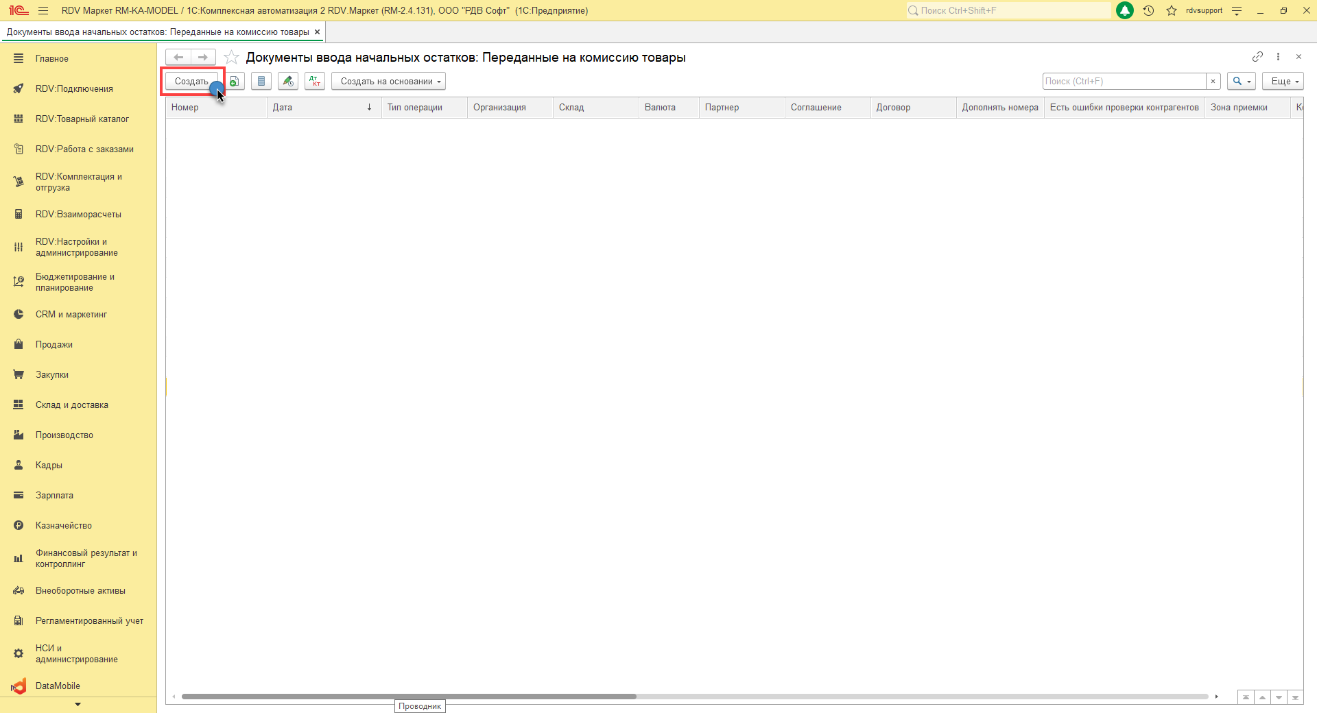 Для ввода начальных остатков товаров, переданных на комиссию (остатки товаров, которые находятся на складах маркетплейса, на момент начало ведения учета в системе) необходимо перейти в раздел "RDV:Подключения" - "Ввод начальных остатков: товары, переданные на комиссию":