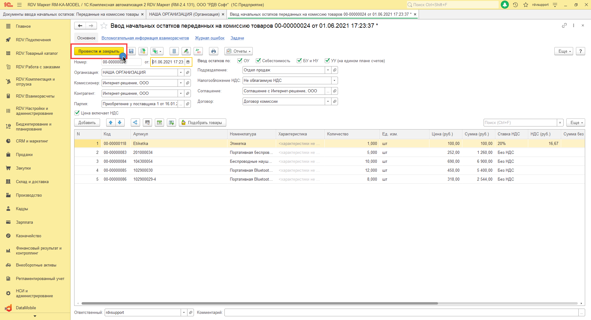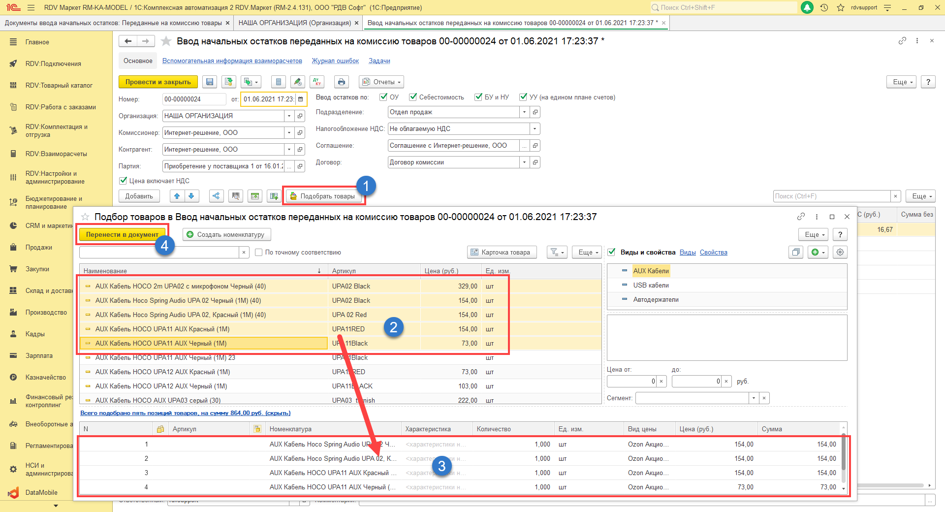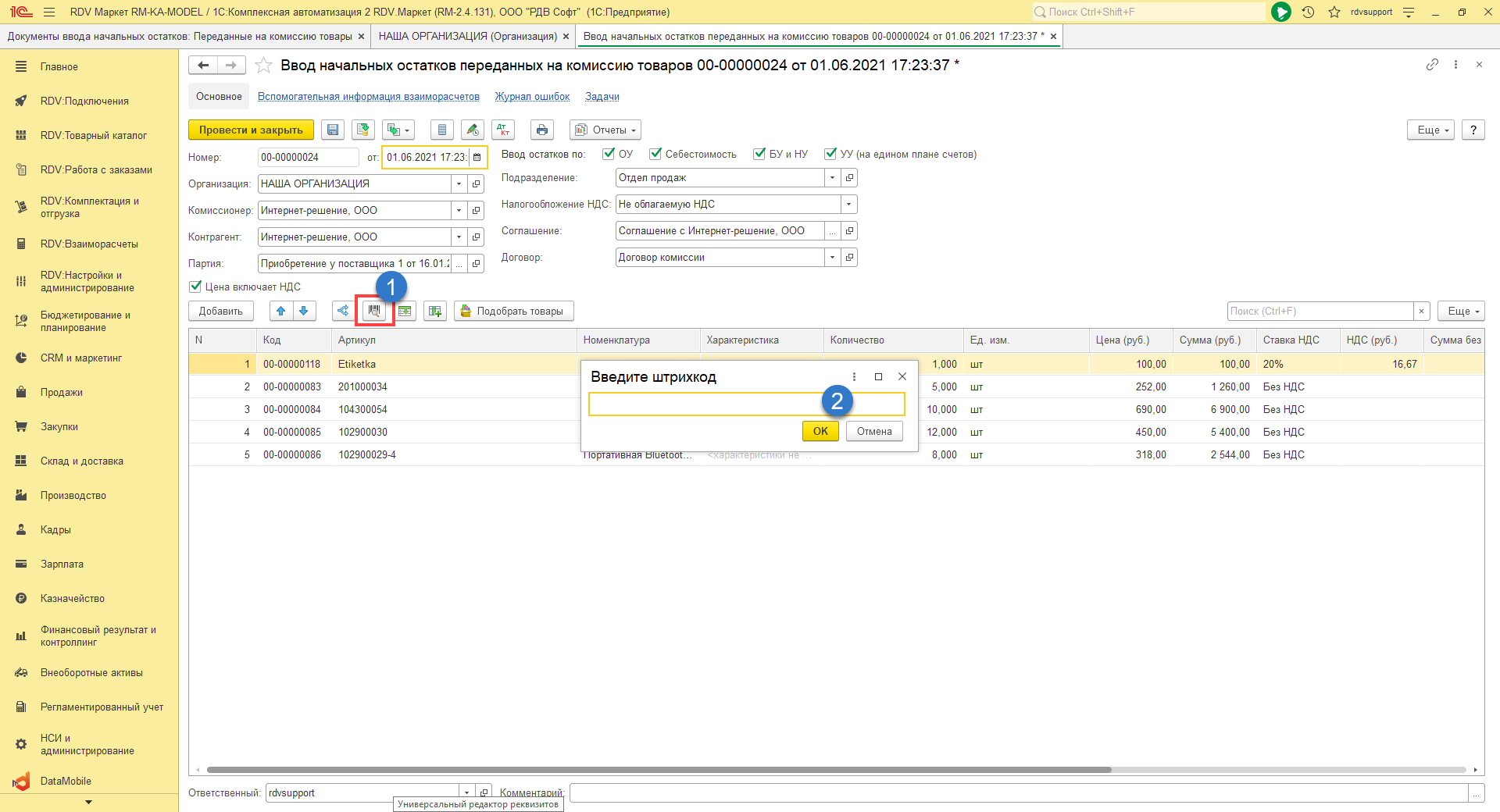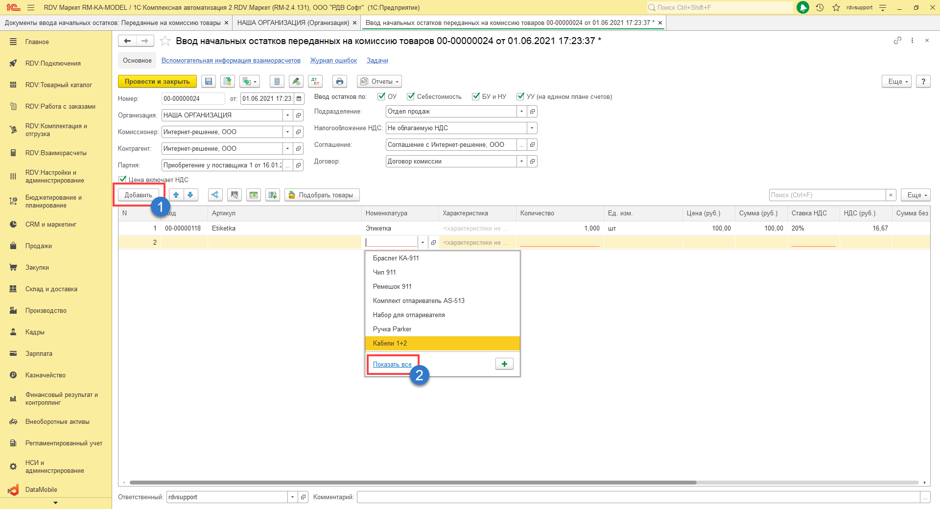 Для ввода начальных остатков товаров, переданных на комиссию (остатки товаров, которые находятся на складах маркетплейса, на момент начало ведения учета в системе) необходимо перейти в раздел "RDV:Подключения" - "Ввод начальных остатков: товары, переданные на комиссию":
