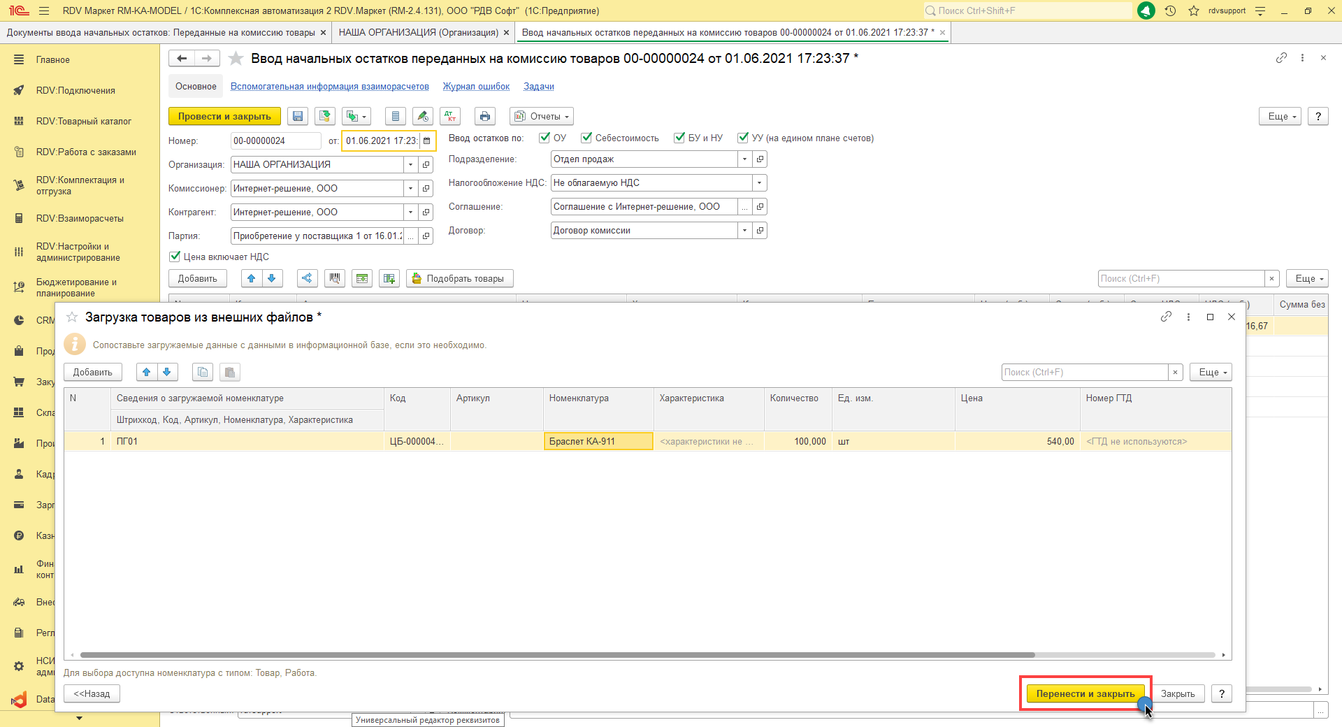 После заполнения таблицы "Загрузка товаров из внешних файлов" необходимо нажать кнопку "Далее", система отобразит сопоставленные товары. По команде "Перенести и закрыть" сопоставленные товары перенесутся в табличную часть "Товары" созданного документа "Ввод начальных остатков товаров, переданных на комиссию":