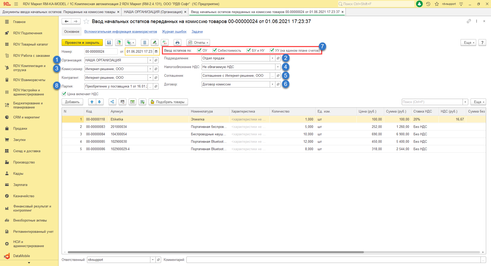В открывшемся окне создания нового документа "Ввод начальных остатков переданных на комиссию товаров" необходимо заполнить поля: