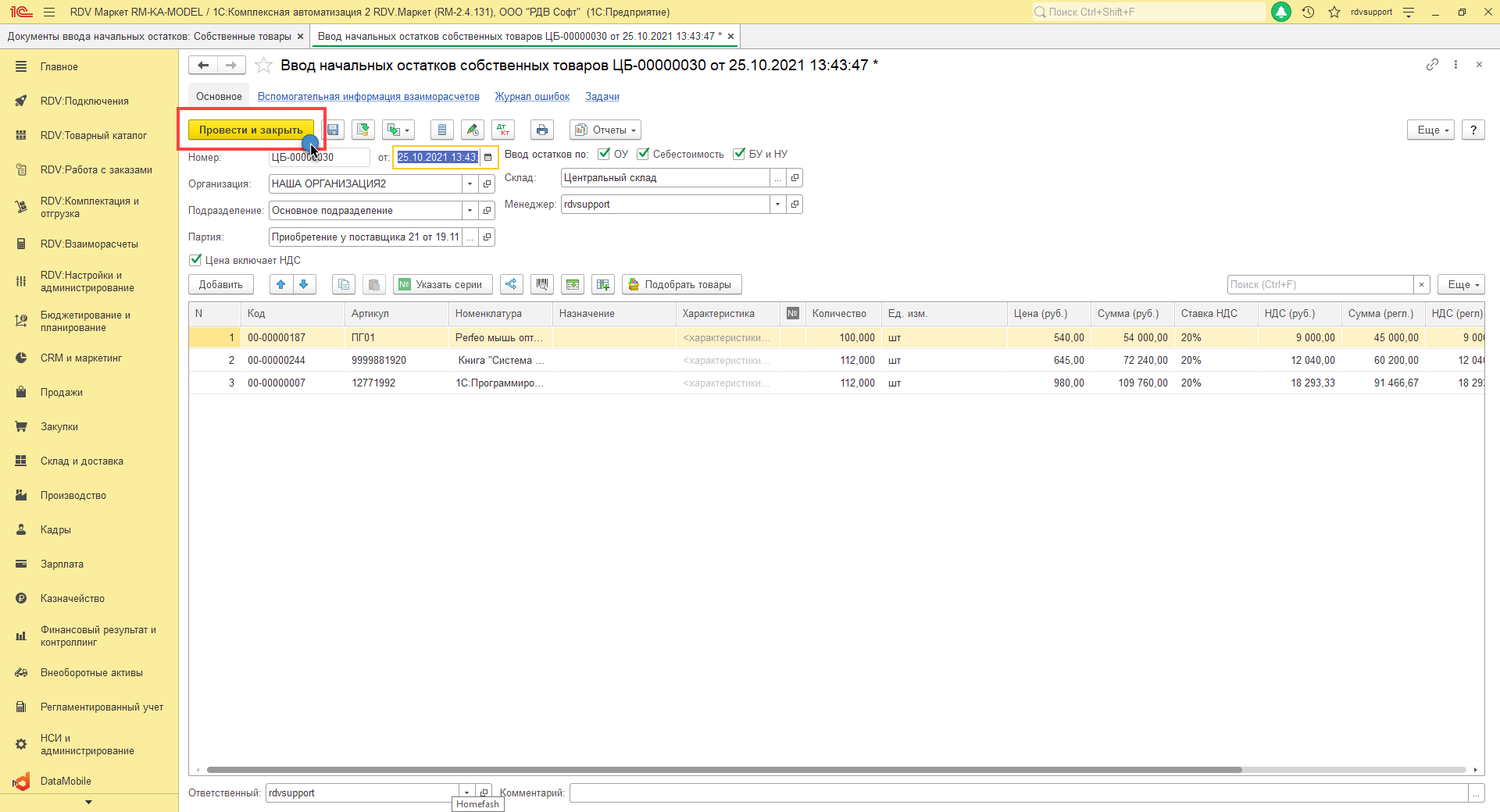 После заполнения табличной части "товары" для завершения ввода начальных остатков необходимо нажать кнопку "Провести и закрыть":