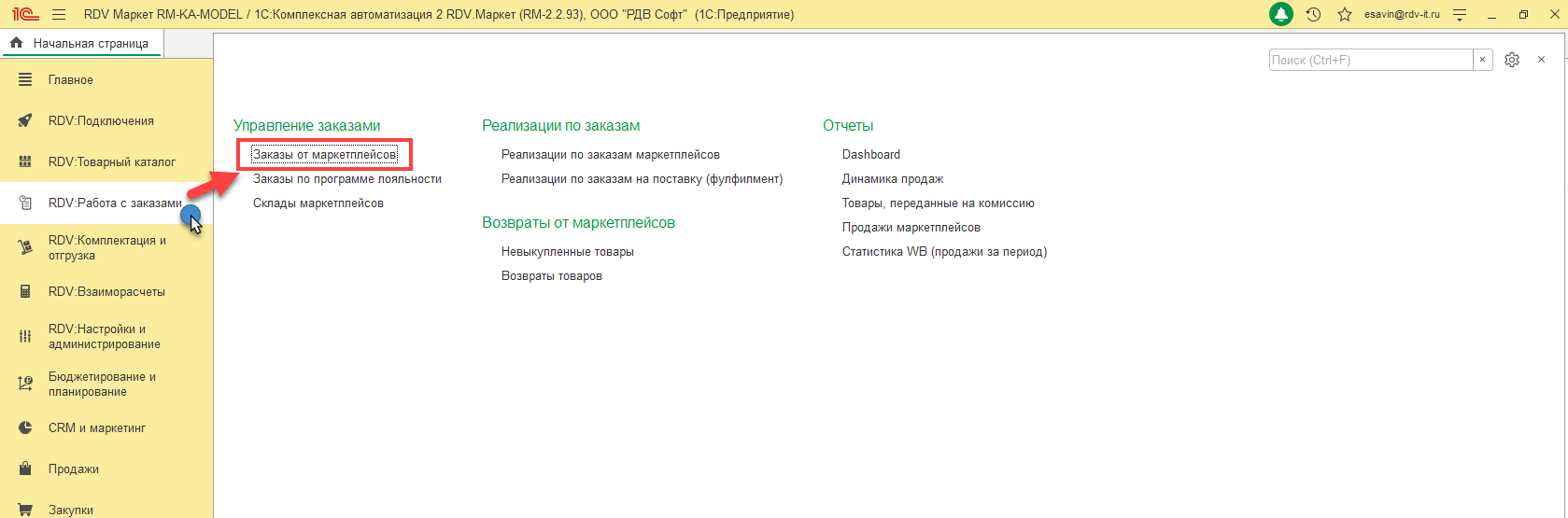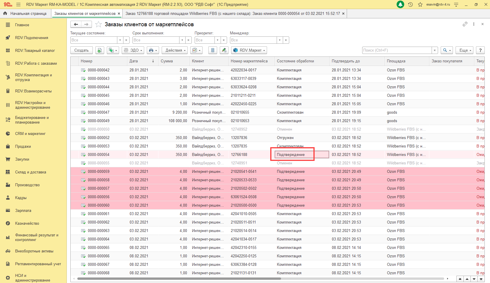 Если данный параметр настройки не установлен в подключении к личному кабинету, то заказы маркетплейсов необходимо подтверждать вручную. Для этого перейдите в раздел "RDV: Работа с заказами" - "Заказы от маркетплейсов":