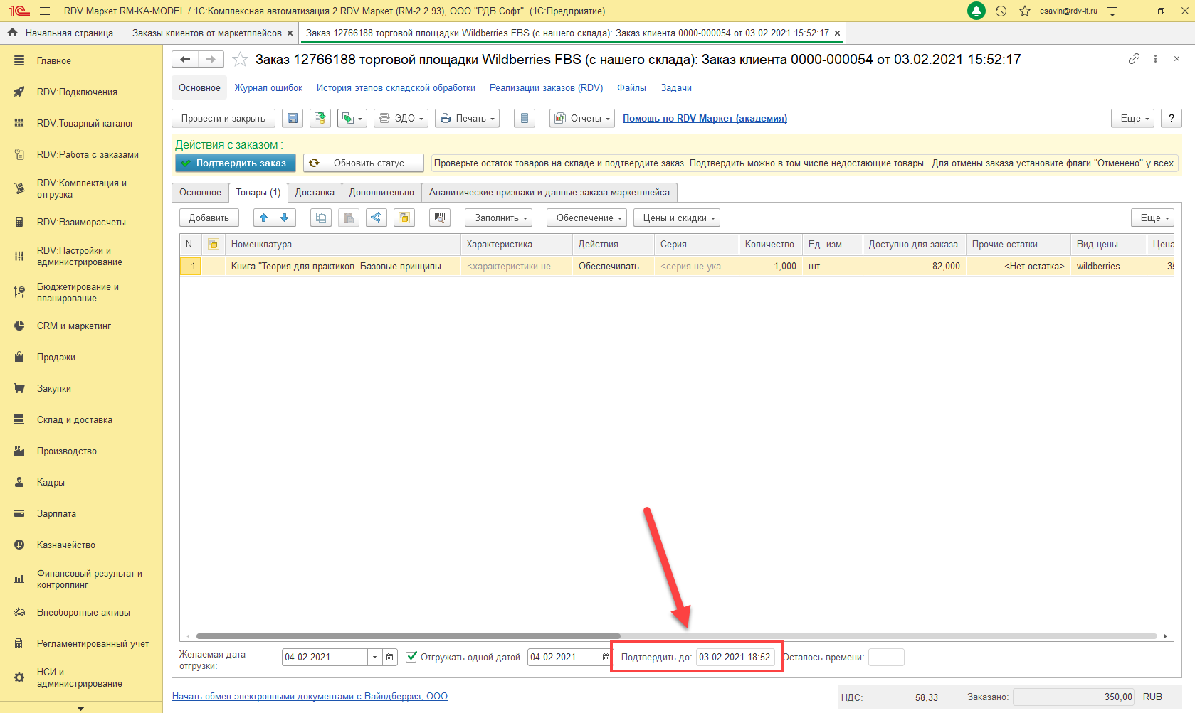 Прежде чем подтвердить заказ необходимо убедиться в том, что на складе есть необходимый остаток товара для данного заказа (1). Если вы планируете заказать недостающий товар под заказ, вы можете подтвердить заказ с товаром, даже если его нет на складе.