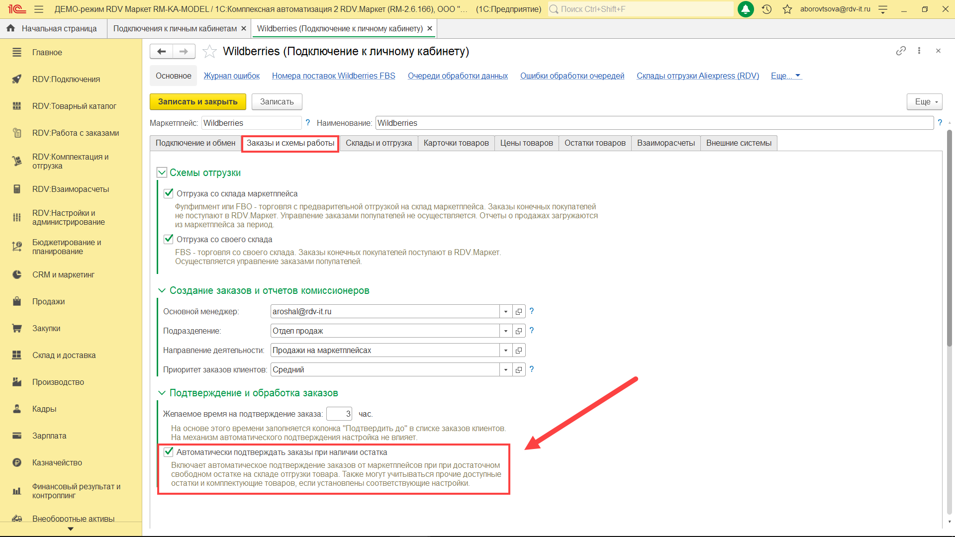 Для настройки автоматического подтверждения заказов необходимо перейти в Подключение к личному кабинету и на вкладке "Заказы и схемы работы" установить флаг "Автоматически подтверждать заказы при наличии остатка".