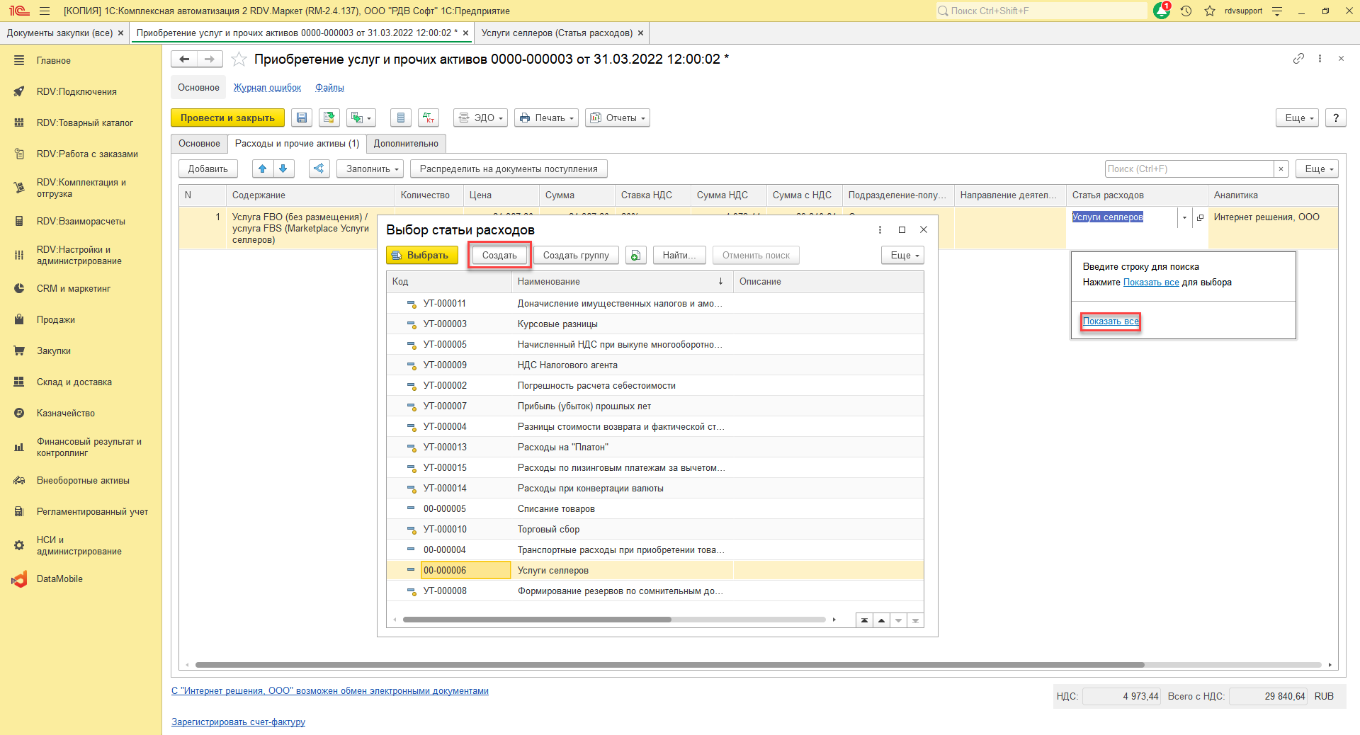 Дополнительные расходы на услуги Ozon в учете отражаются документом Приобретение услуг и прочих активов: Закупки – Закупки – Документы закупки (все). Создать – Приобретение услуг и прочих активов.