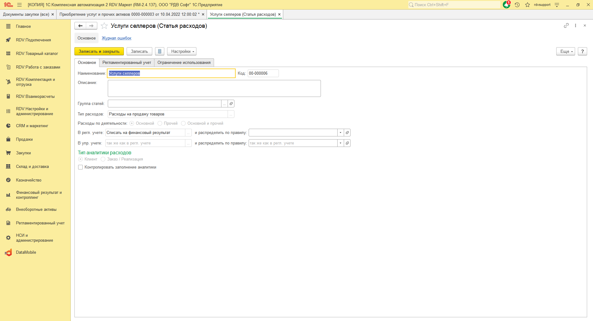 В статьях расходов необходимо настроить Тип расходов, Порядок распределения расходов, Тип аналитики расходов, порядок отражения в регламентированном учете, в том числе признание расходов и счета учета для отражения в регл. учете.