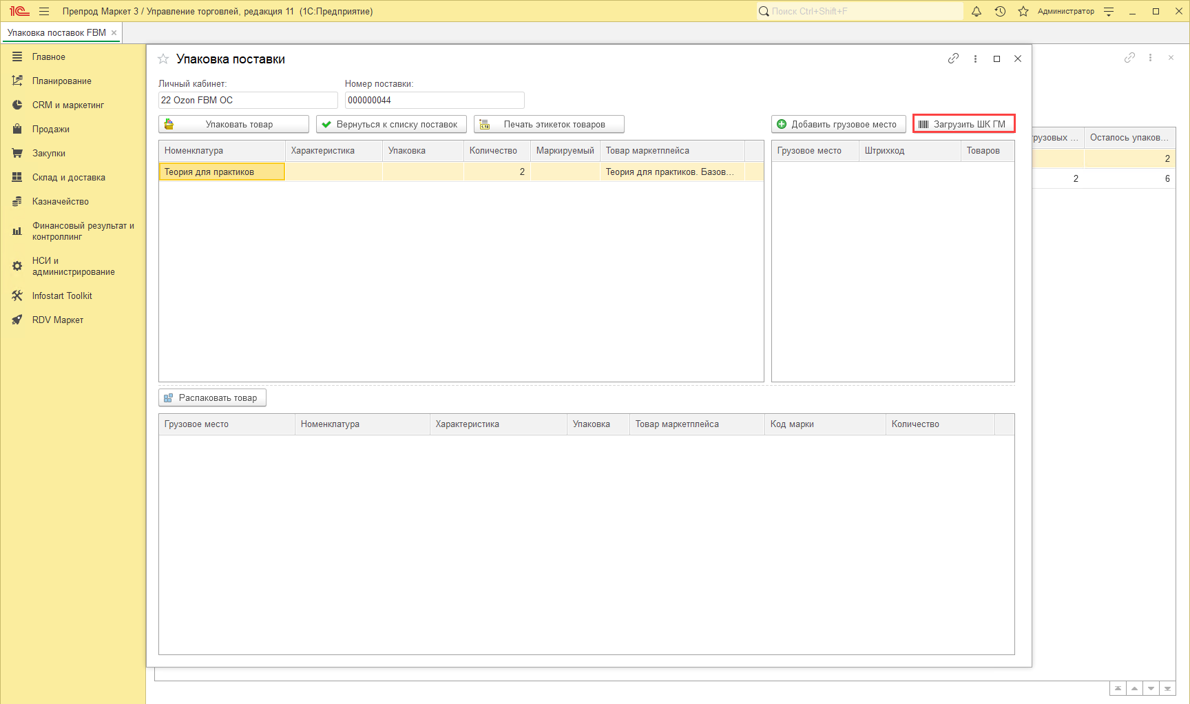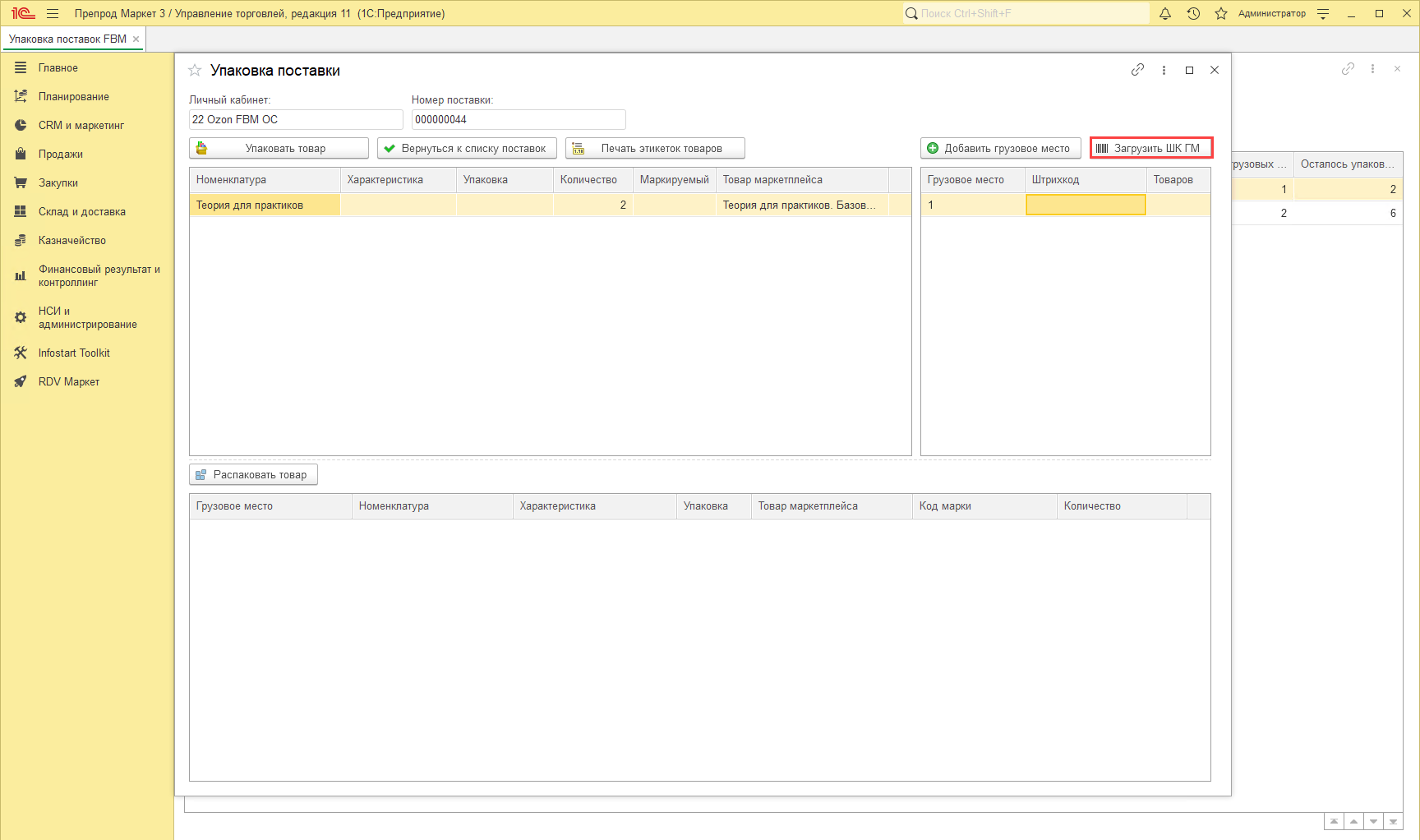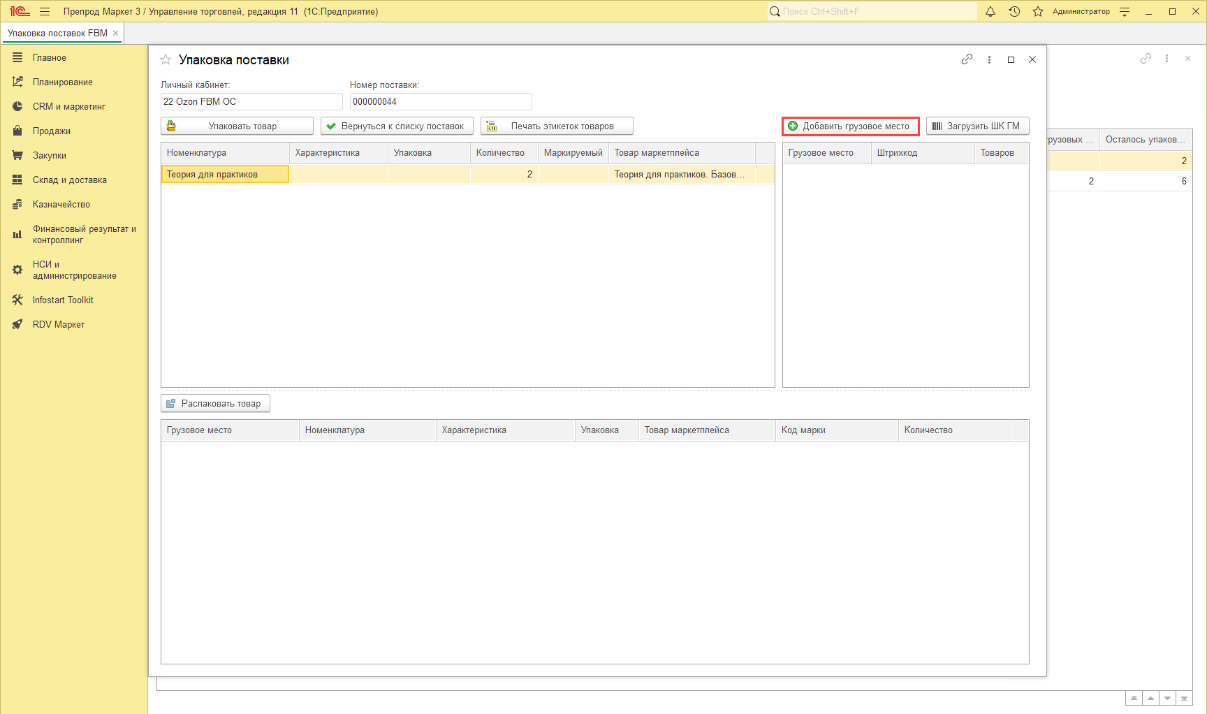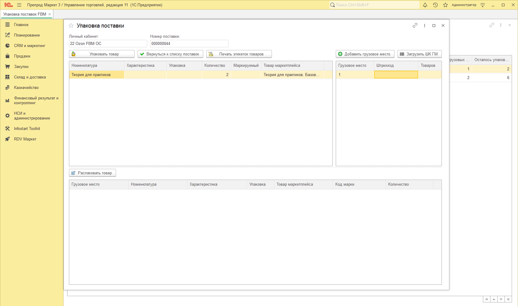 После того, как в разделе "RDV Маркет"-"Управление поставками FBM" создана поставка и передана на сборку, она появится в разделе "RDV Маркет"-"Упаковка поставок FBM":