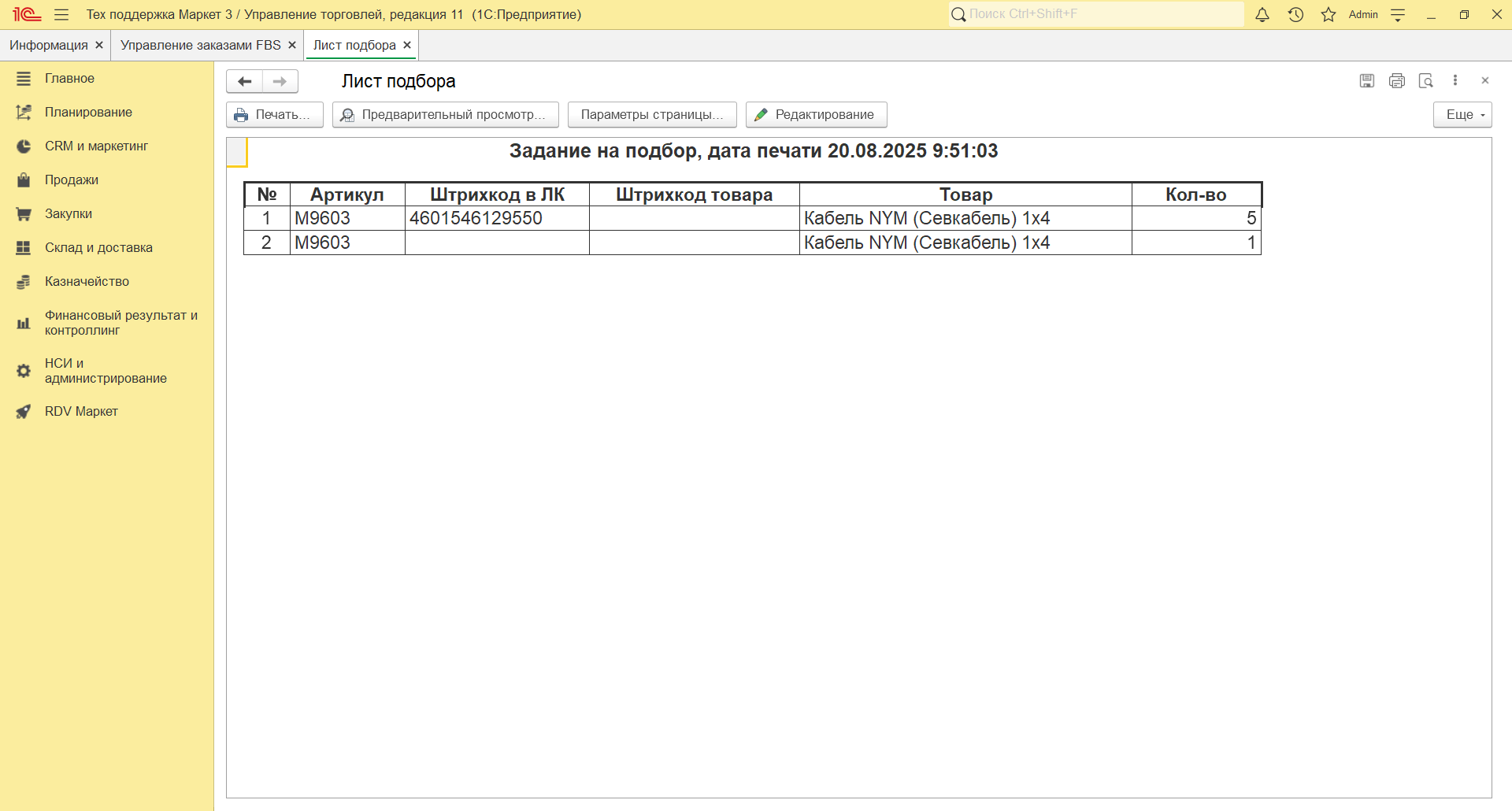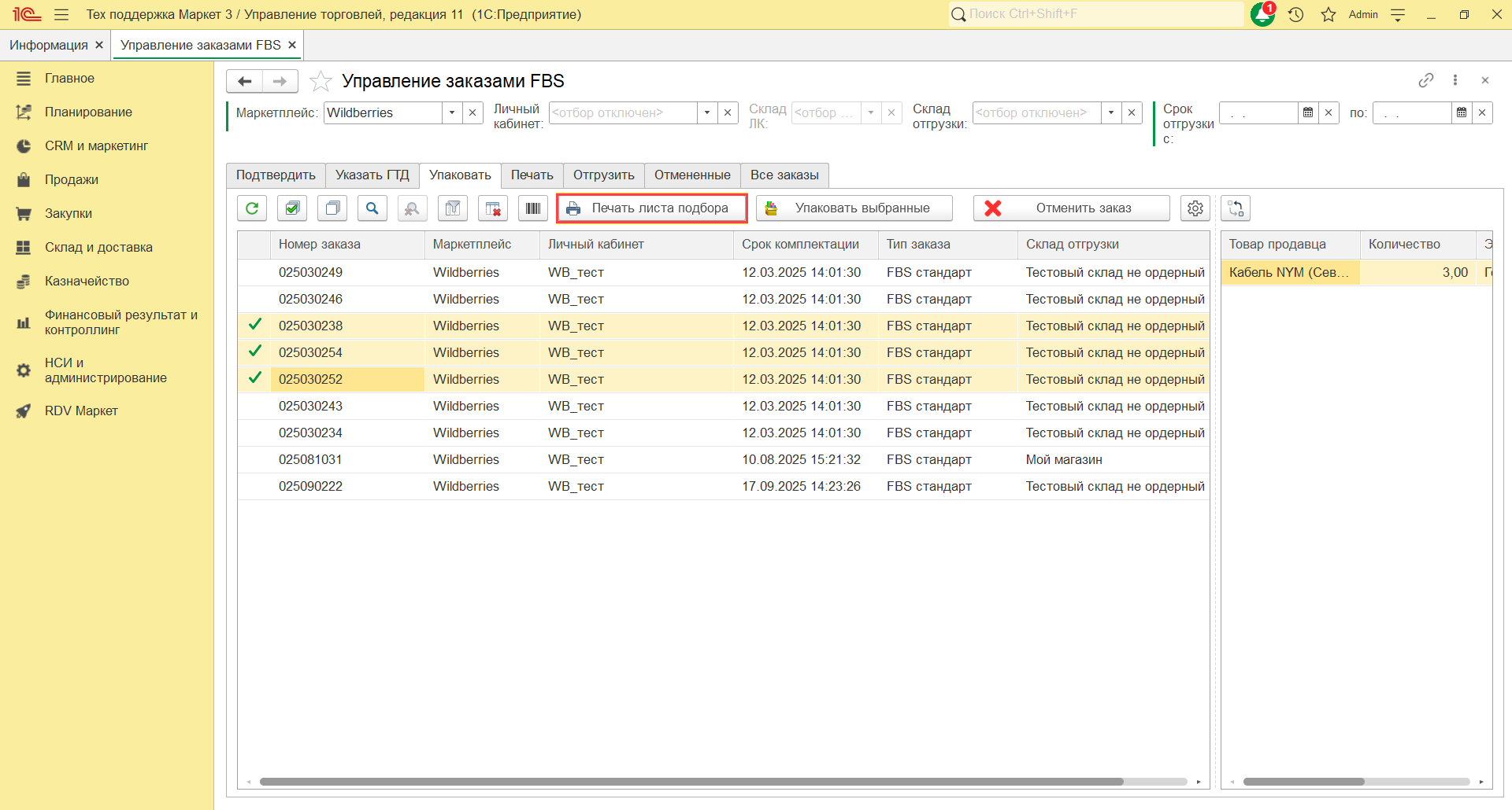На вкладке "Упаковать" можно распечатать "Лист подбора" и упаковать заказы.