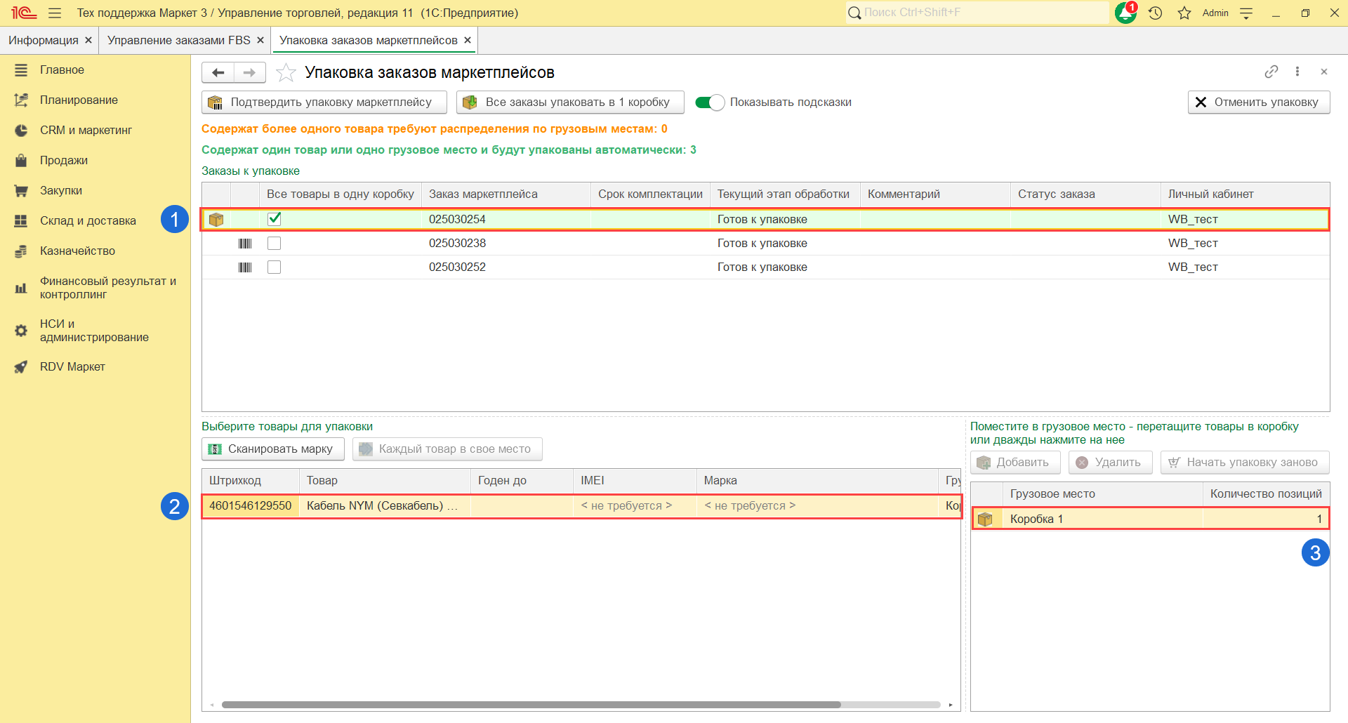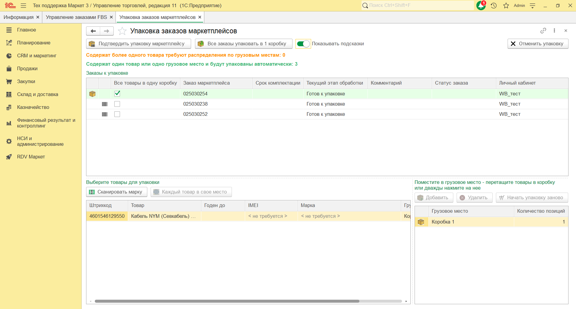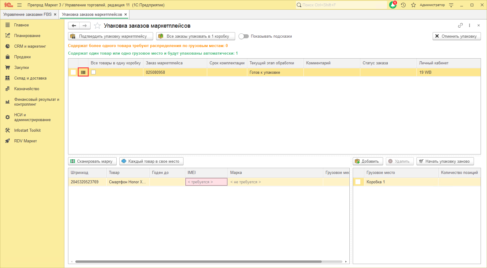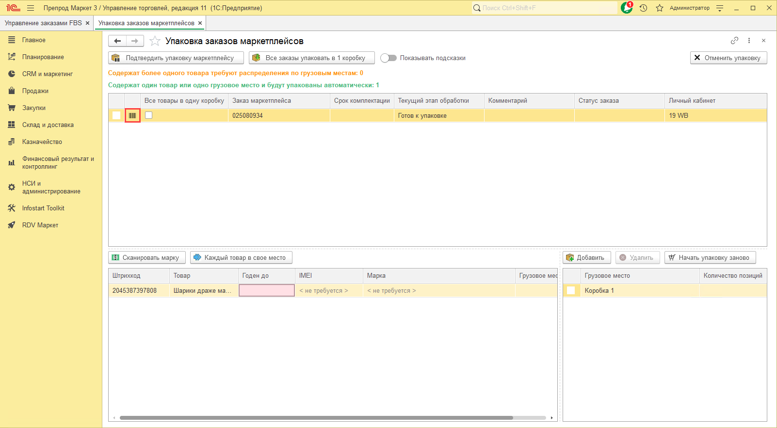 После указания маркировки, можно вернуться к упаковке заказа и упаковать все товары заказа в одну коробку, установив соответствующую галочку: