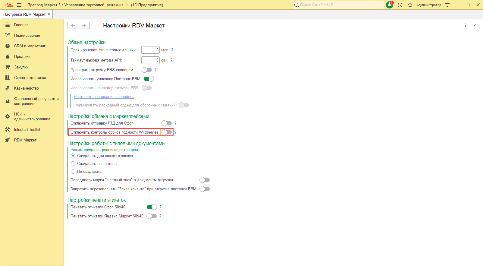 Отключить контроль срока годности можно в разделе "RDV Маркет" - "Настройки RDV Маркет":