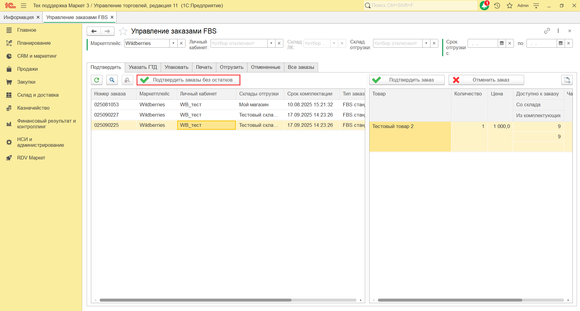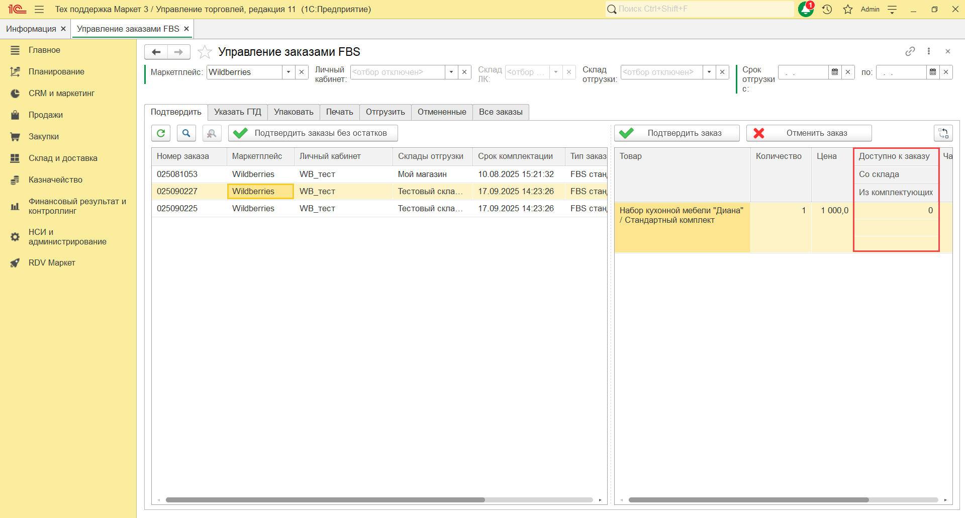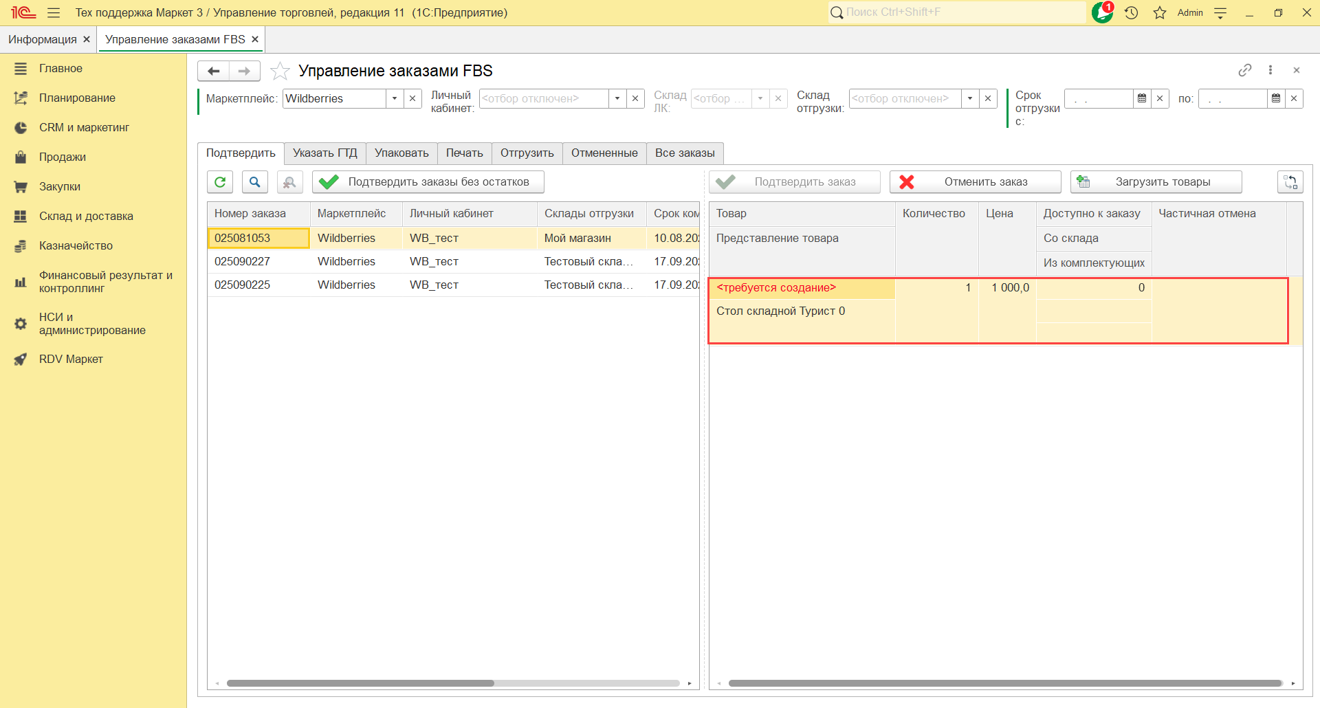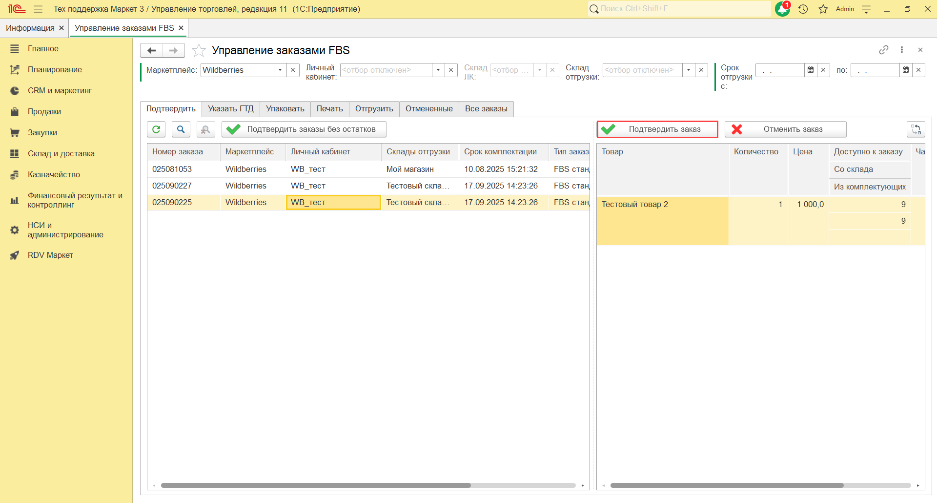 Поступающие заказы маркетплейса Wildberries необходимо обрабатывать в разделе "RDV Маркет" - в рабочем месте "Управление заказами FBS":