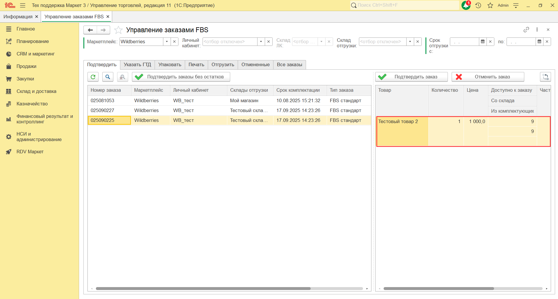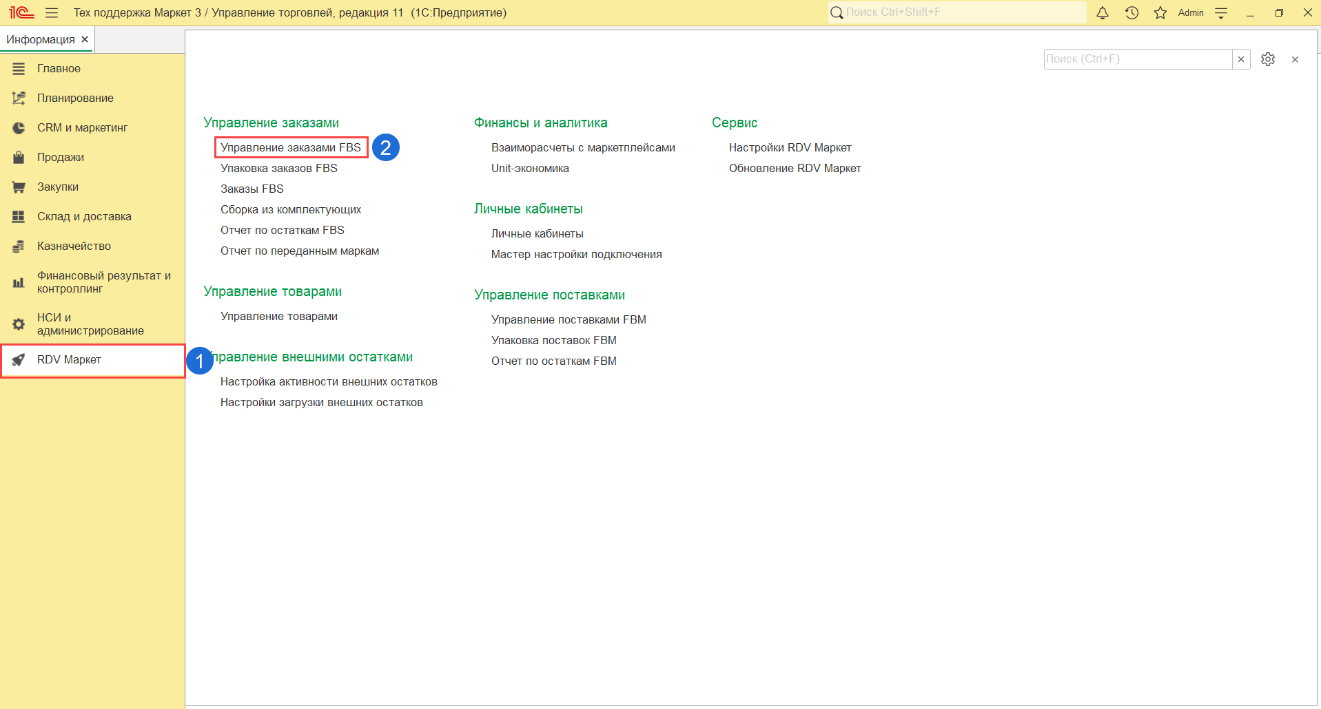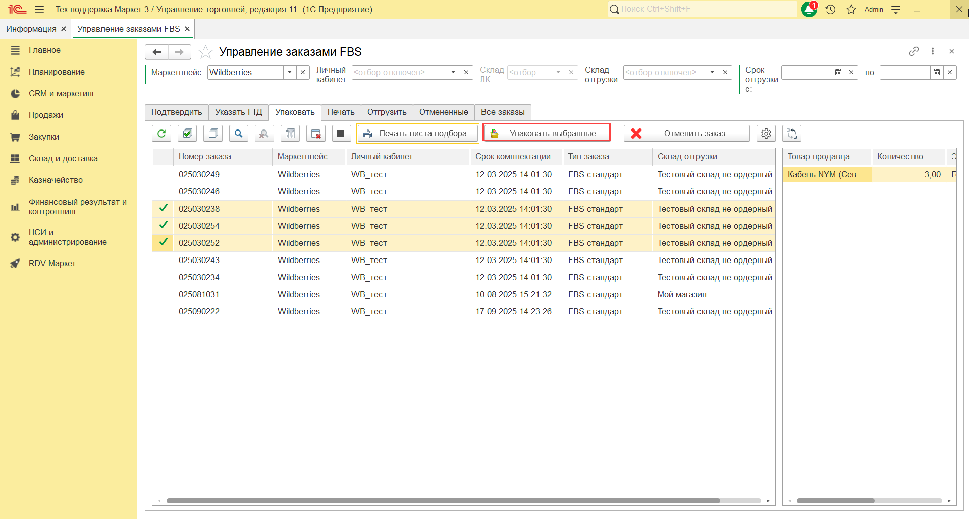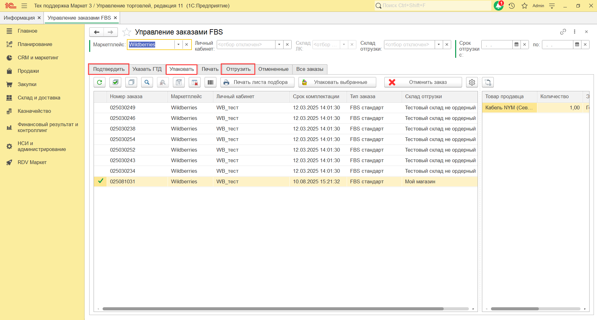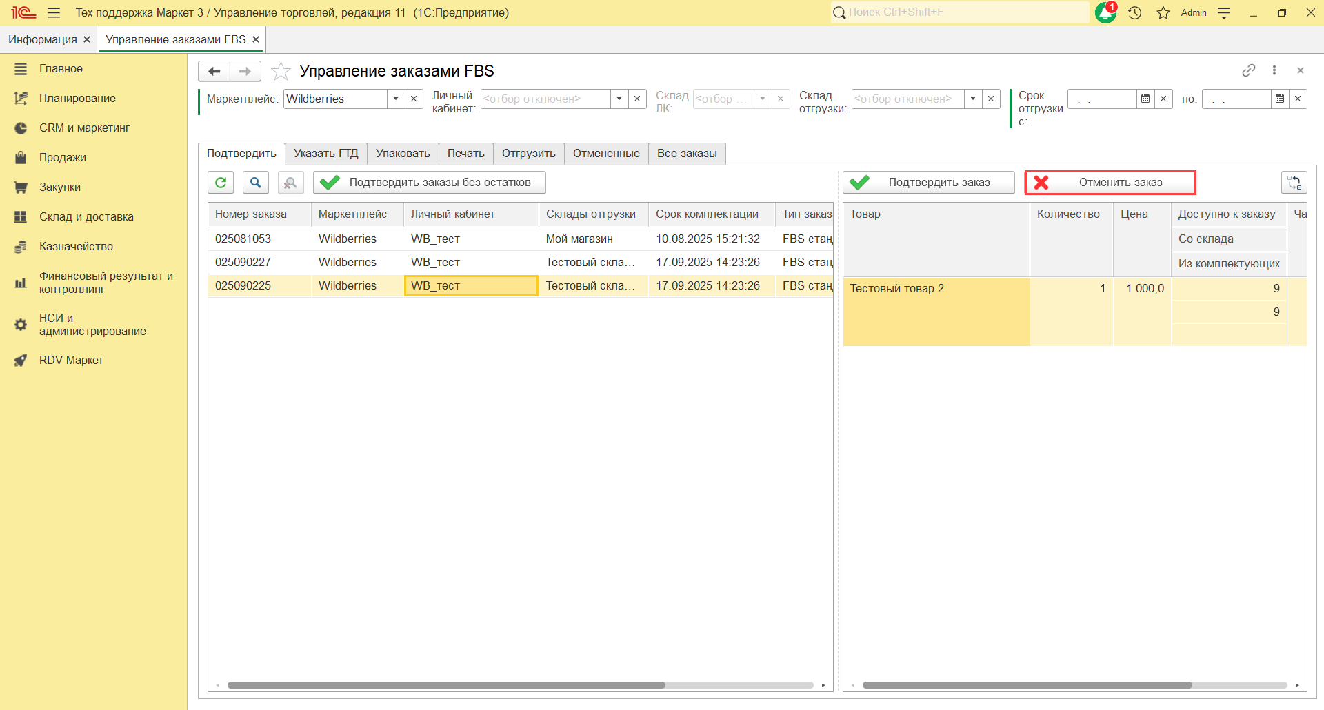 Поступающие заказы маркетплейса Wildberries необходимо обрабатывать в разделе "RDV Маркет" - в рабочем месте "Управление заказами FBS":
