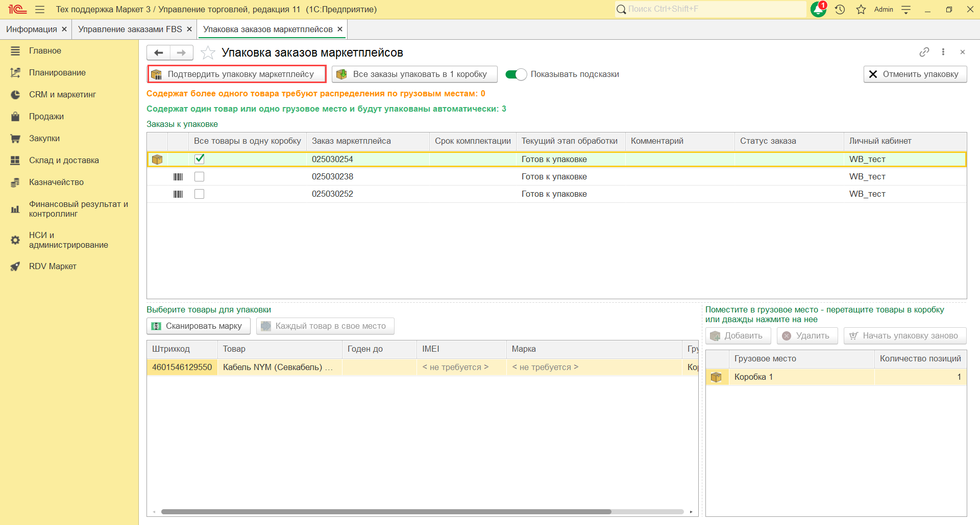 Для завершения упаковки, нажмите на кнопку "Подтвердить упаковку маркетплейсу":