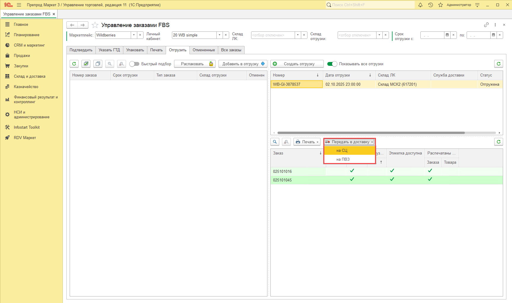 При выборе отгрузки на СЦ будет выполнена стандартная отгрузка:
