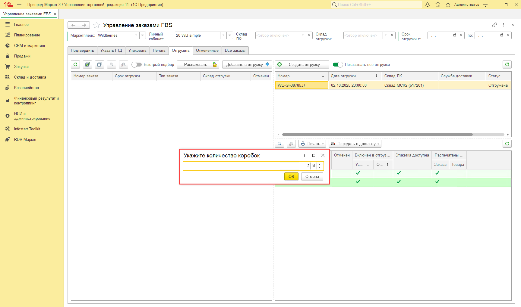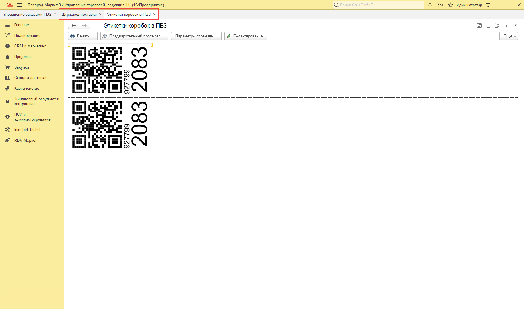 Распечатайте появившийся штрихкод поставки и этикетки коробок: