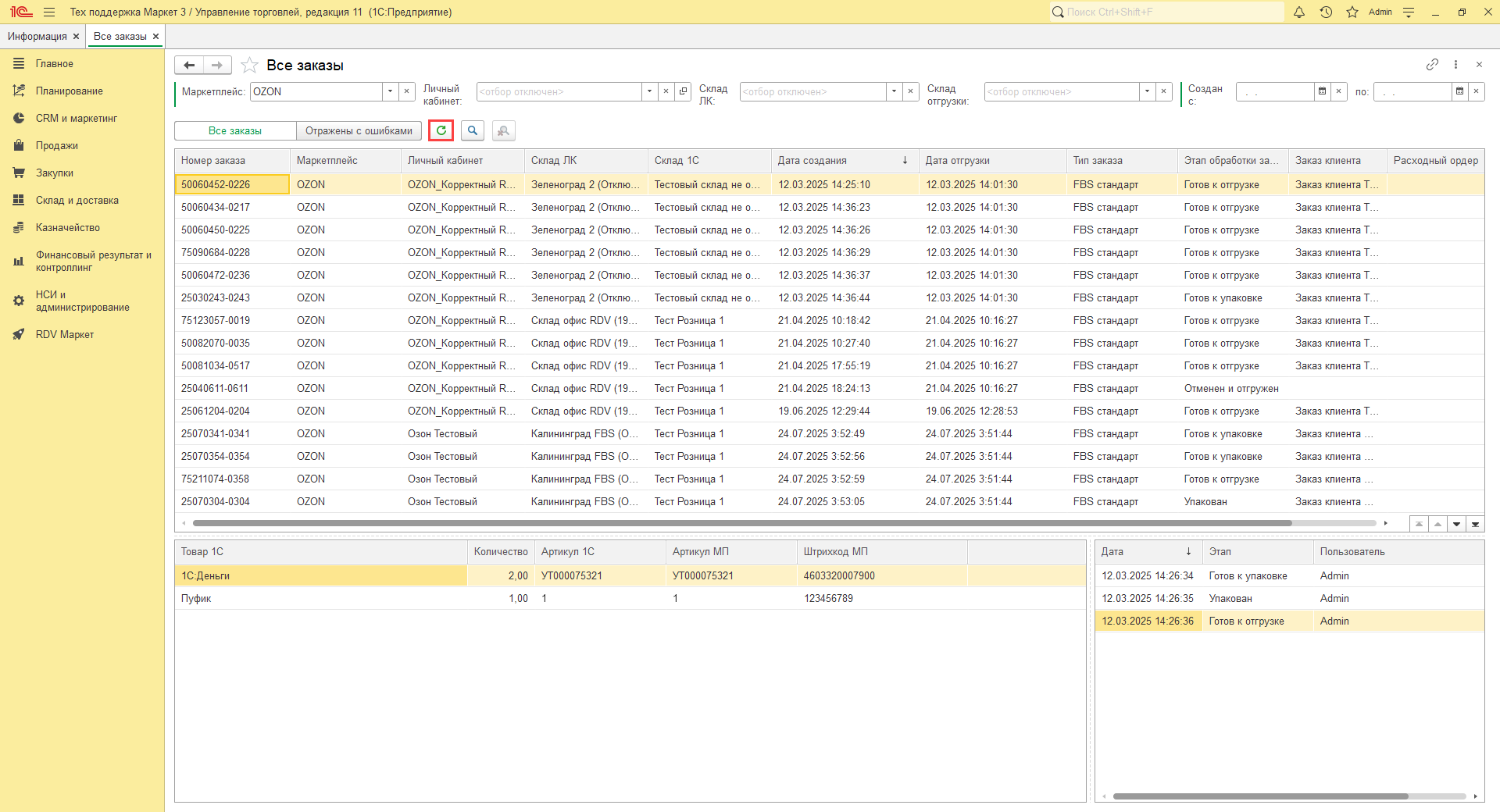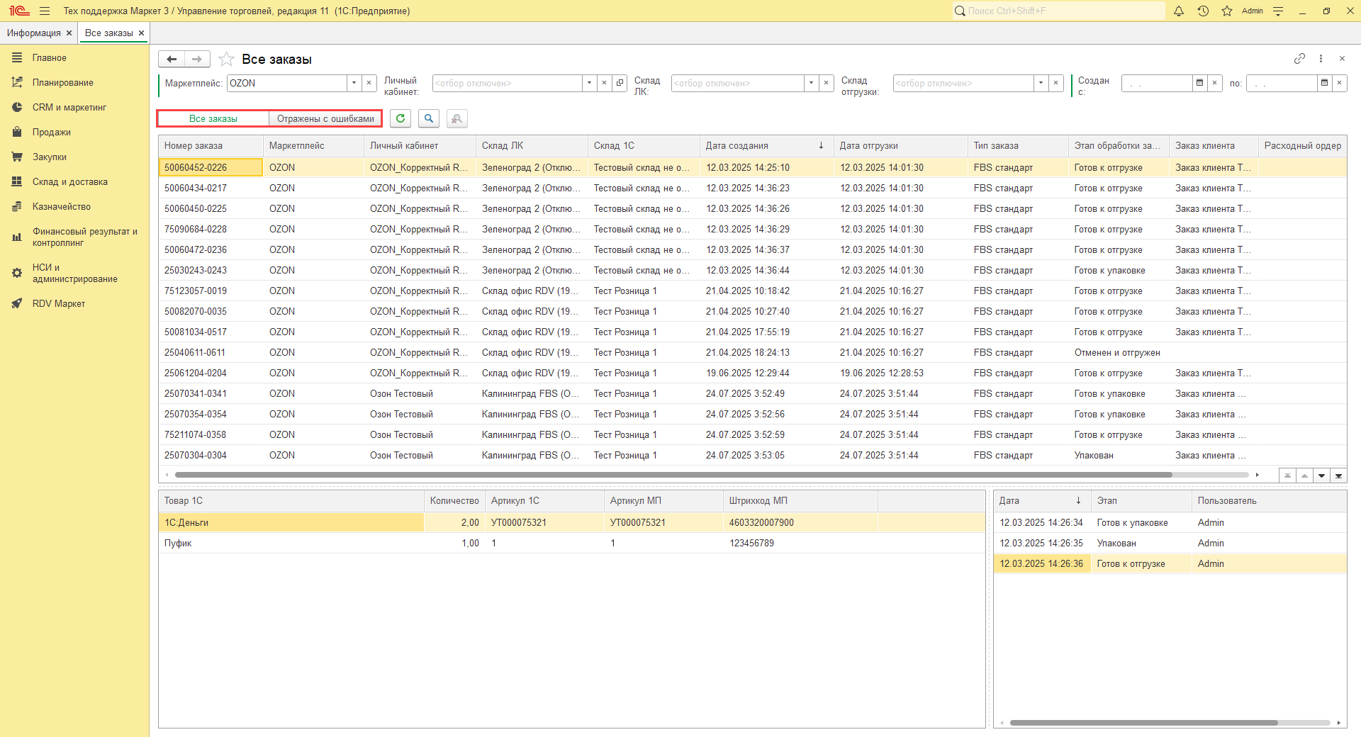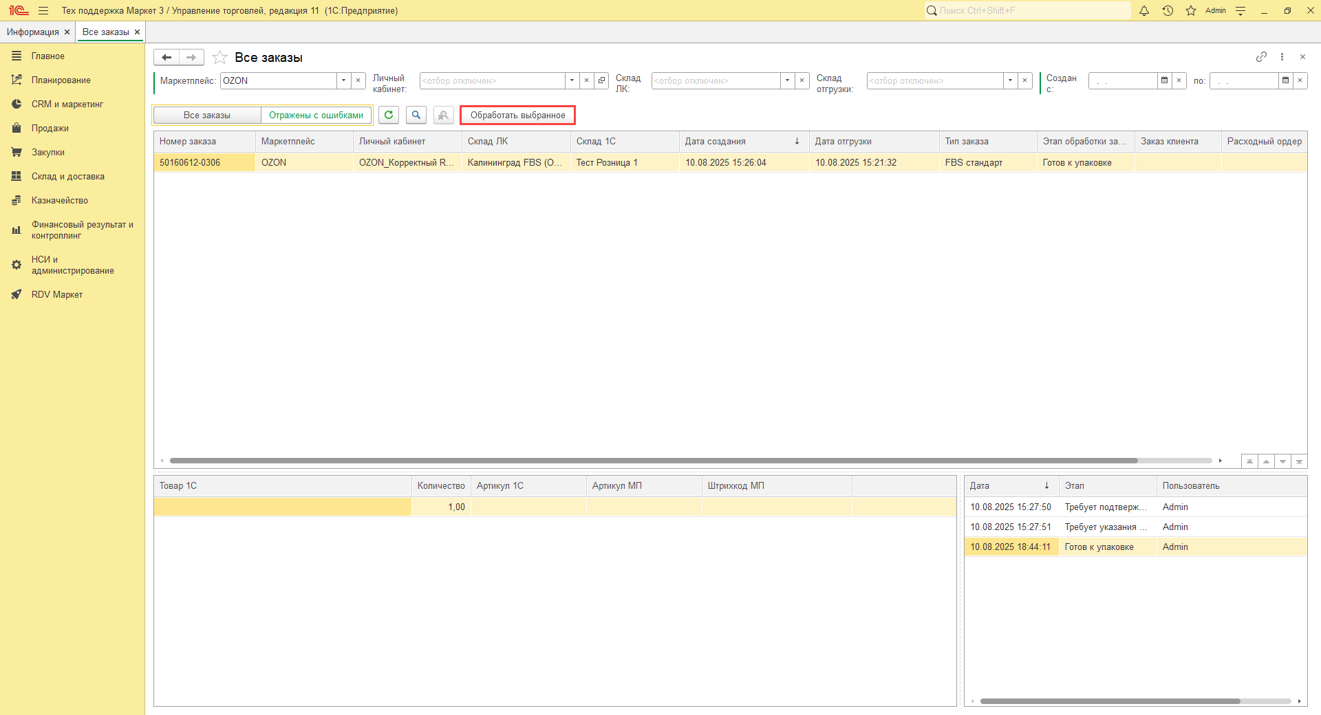 Если документы по заказам не отражаются и самостоятельно ошибку исправить не удалось (текст ошибки будет выводится при обработке в форме оповещения), создайте обращение на почту поддержки RDV Маркета: support@rdv-it.ru.