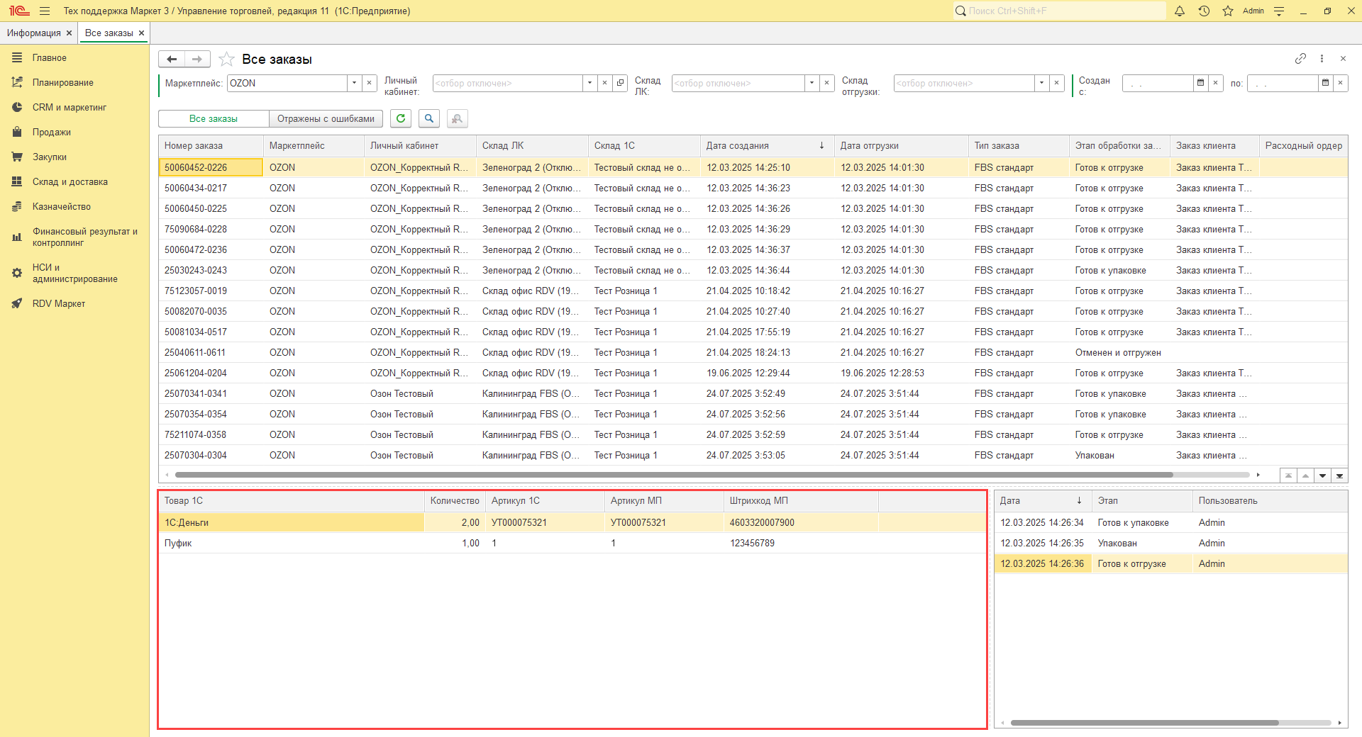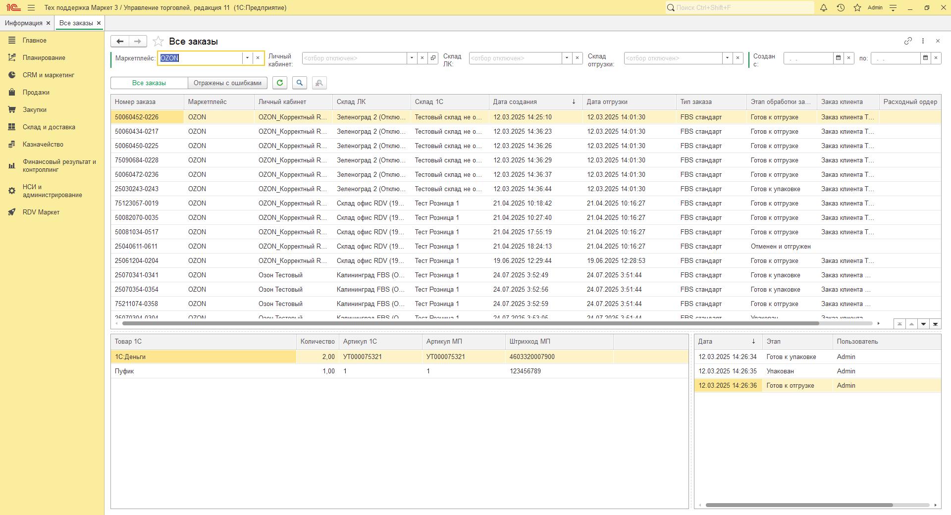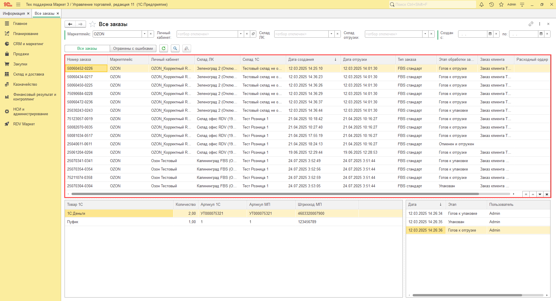 Если документы по заказам не отражаются и самостоятельно ошибку исправить не удалось (текст ошибки будет выводится при обработке в форме оповещения), создайте обращение на почту поддержки RDV Маркета: support@rdv-it.ru.