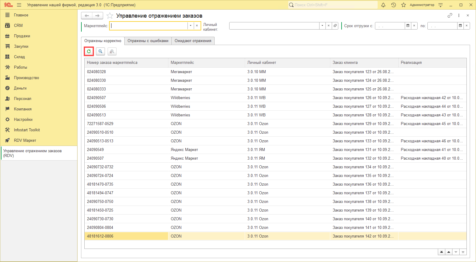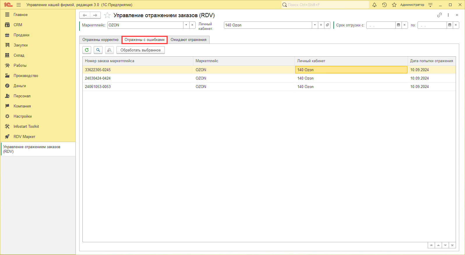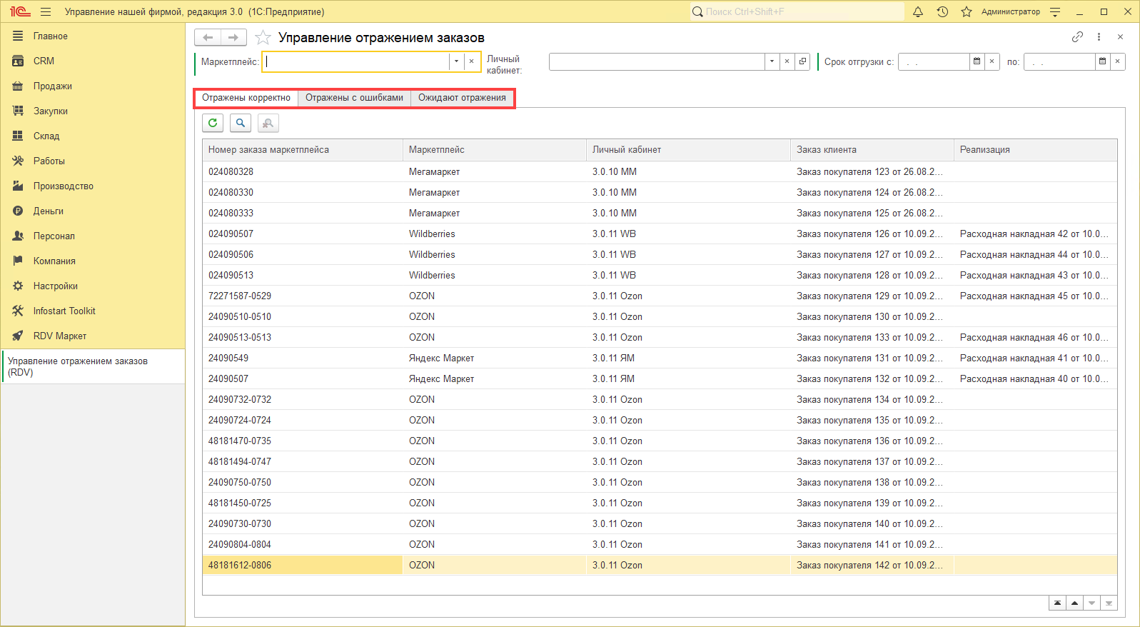 В разделе "RDV Маркет" - "Сервис" в рабочем месте "Управление отражением заказов" можно проверить: какие типовые документы 1С создались или не создались по заказам маркетплейсов: