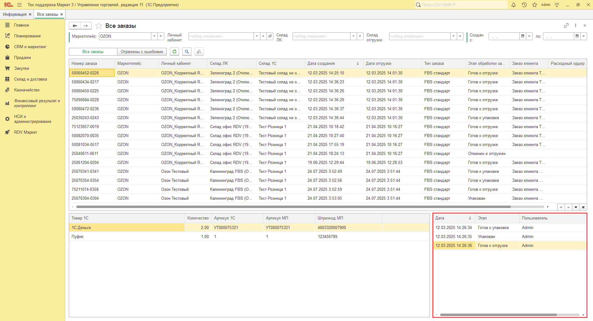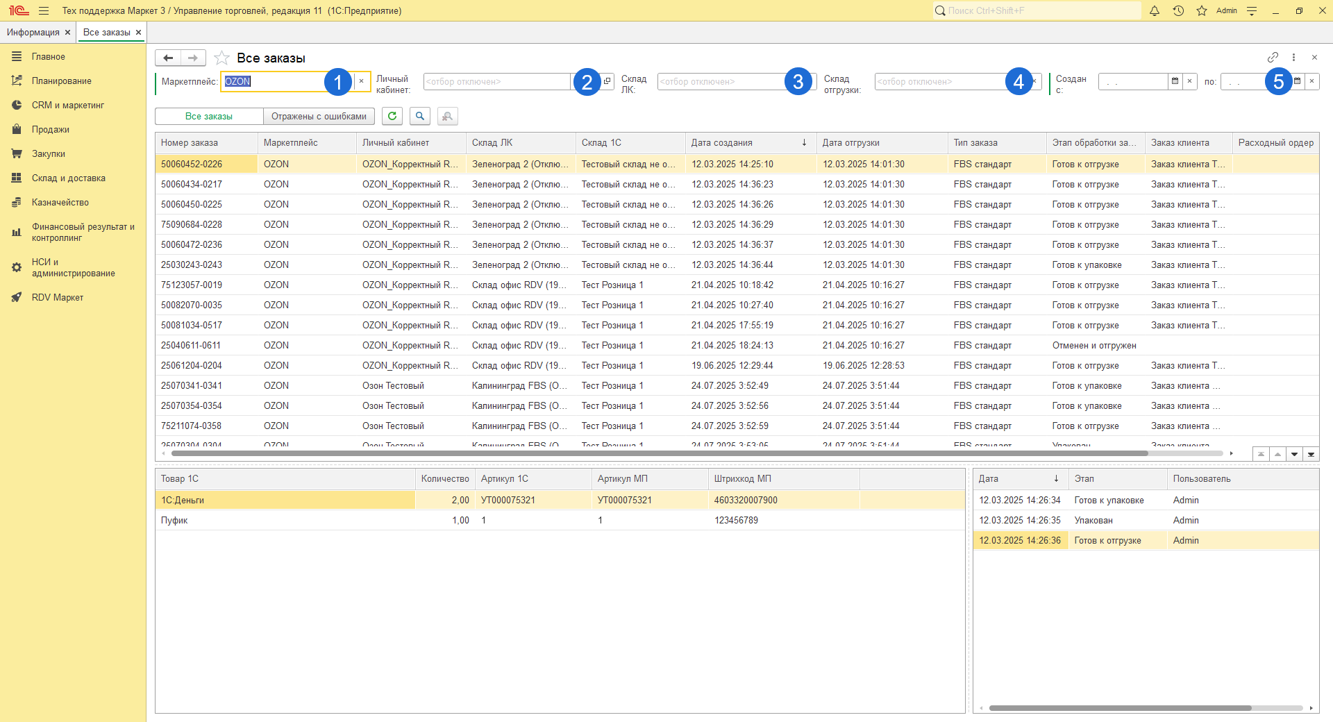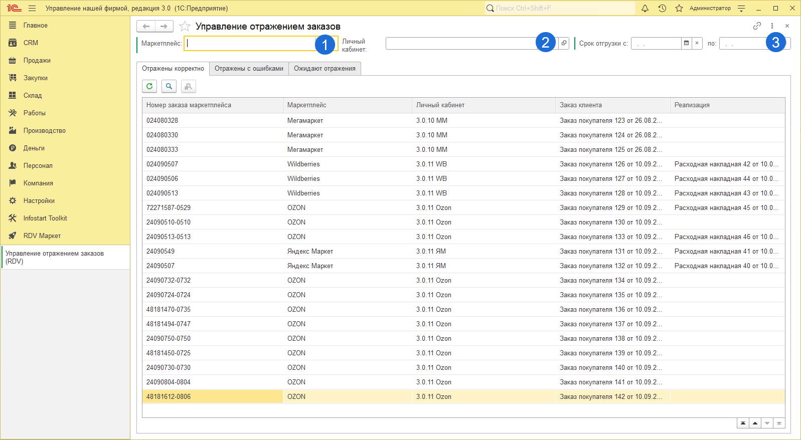 В разделе "RDV Маркет" - "Сервис" в рабочем месте "Управление отражением заказов" можно проверить: какие типовые документы 1С создались или не создались по заказам маркетплейсов: