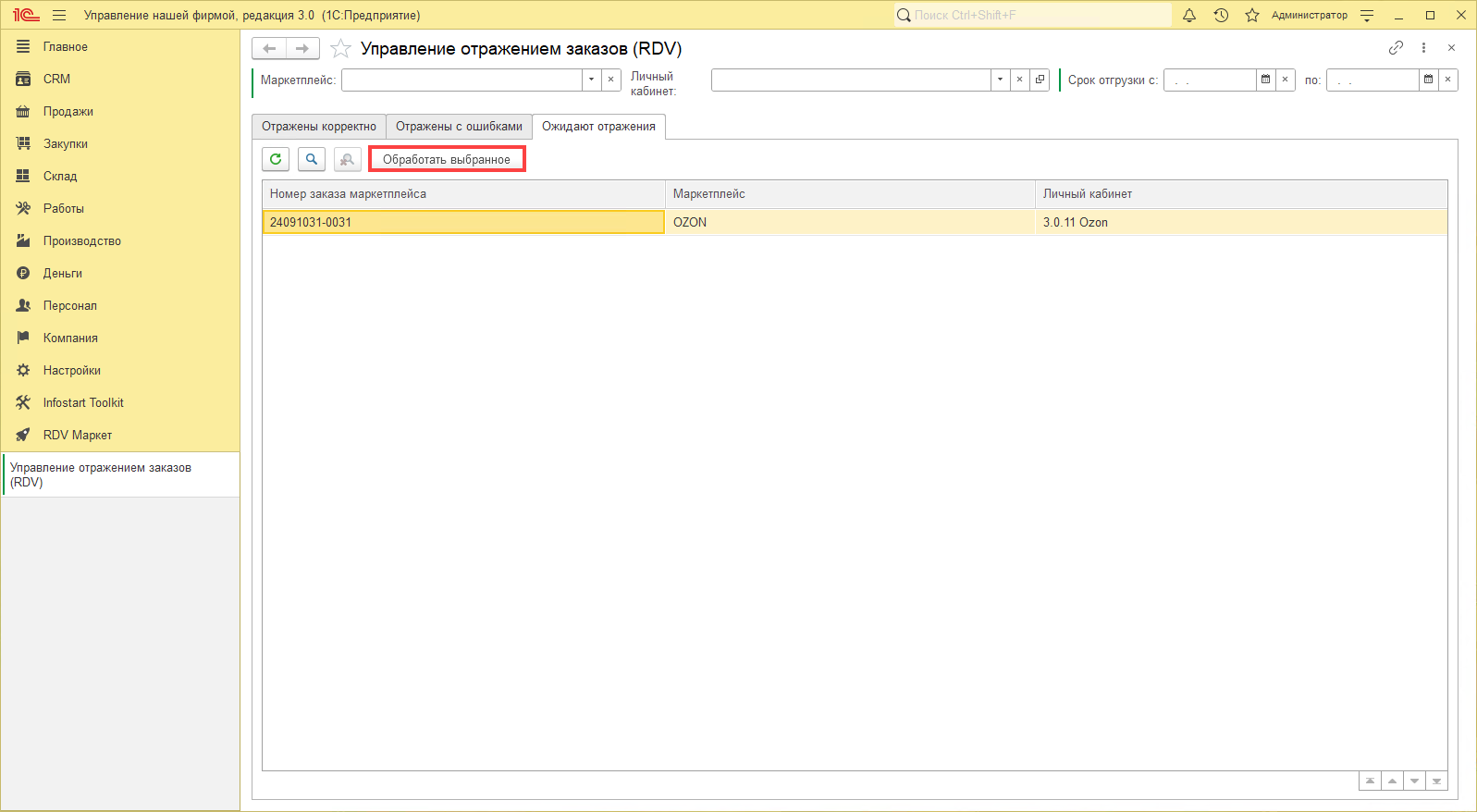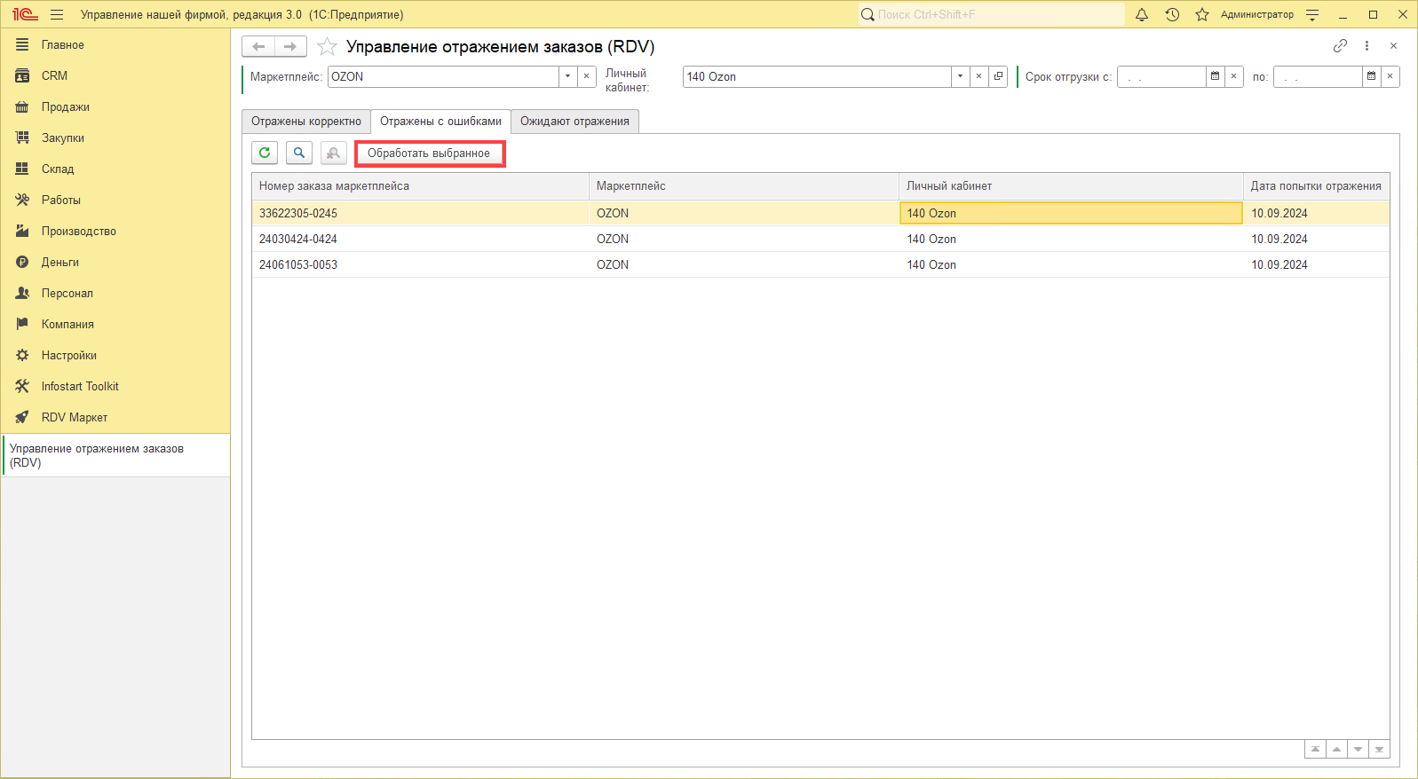 Выделив необходимый заказ и нажав на кнопку "Обработать выбранное", можно попробовать переотразить документы:
