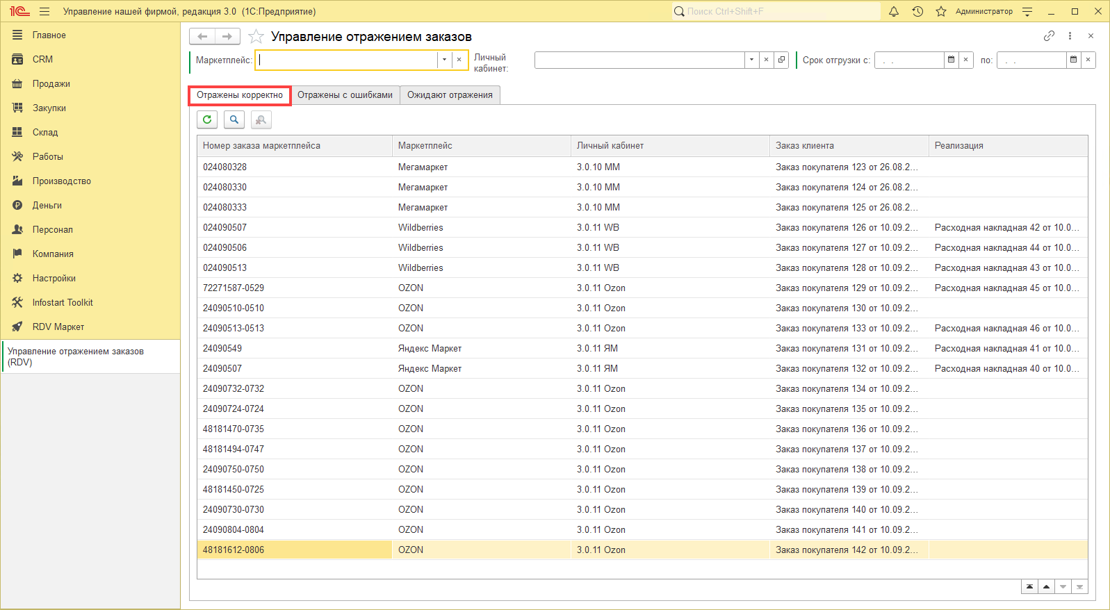 Если по заказам маркетплейса не созданы документы "Реализации", но заказ находится на вкладке "Отражены корректно", это означает, что на текущий момент заказ не отгружен и по нему не требуется создавать "Реализацию".