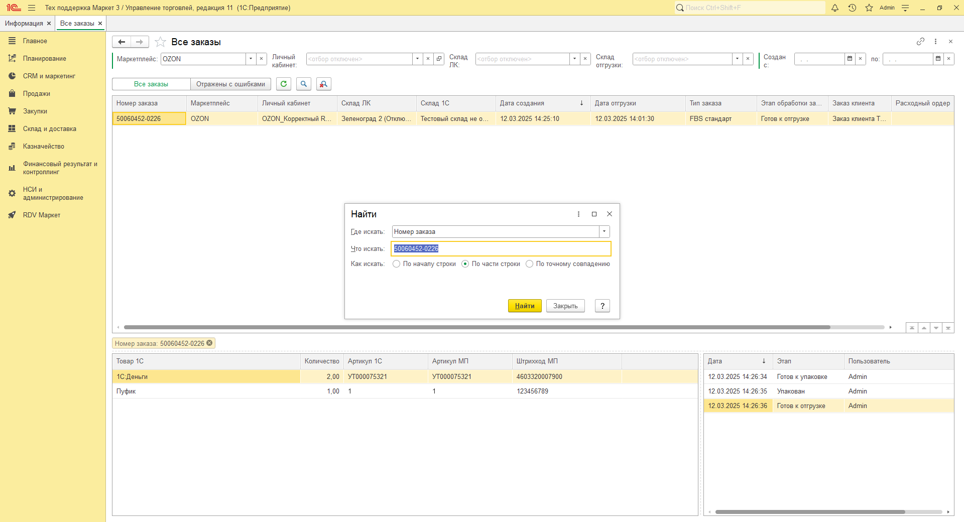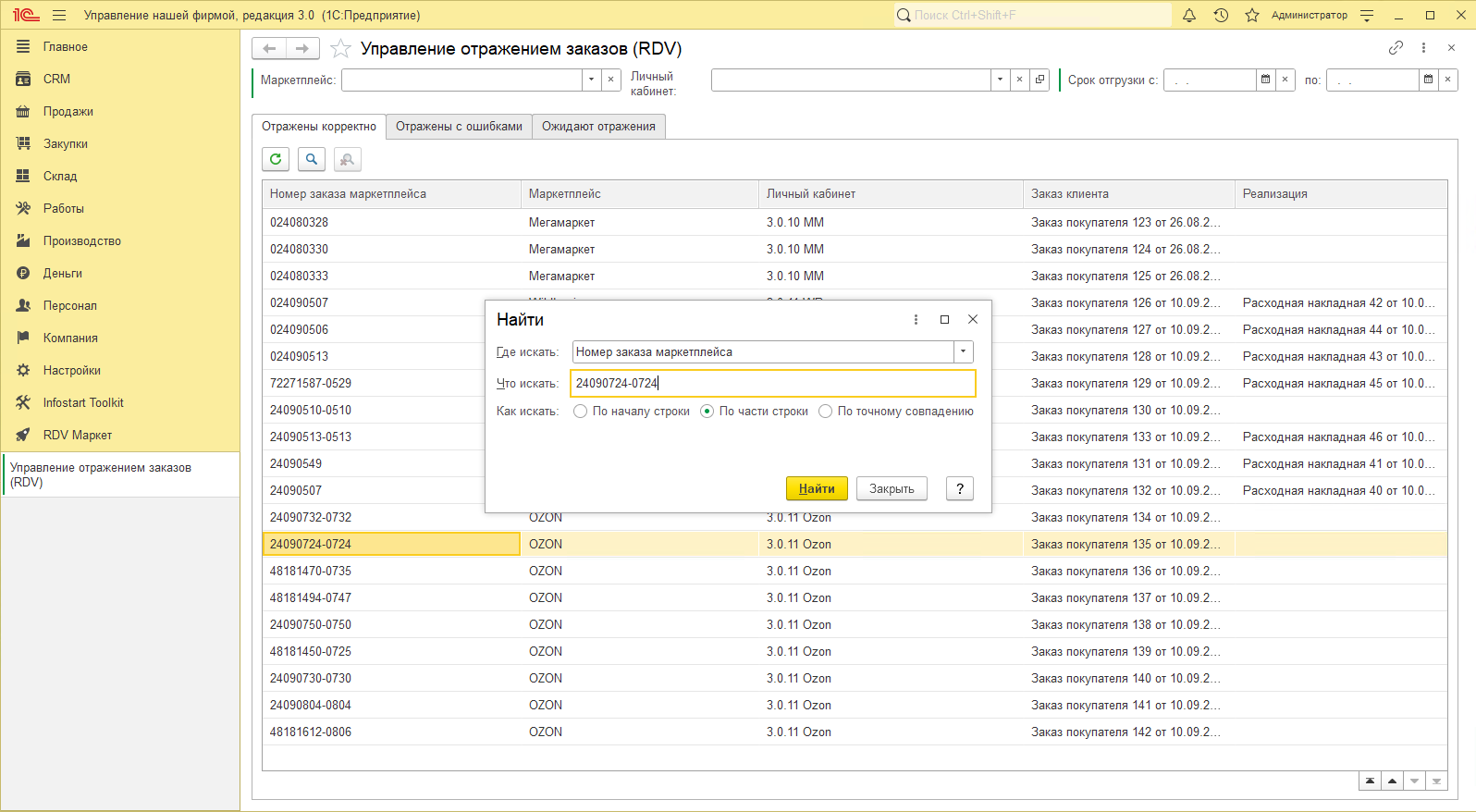 С помощью сочетания клавиш "Ctrl" + "F" можно выполнить поиск по конкретному Заказу маркетплейса или документам "Заказ клиента" и "Реализация":