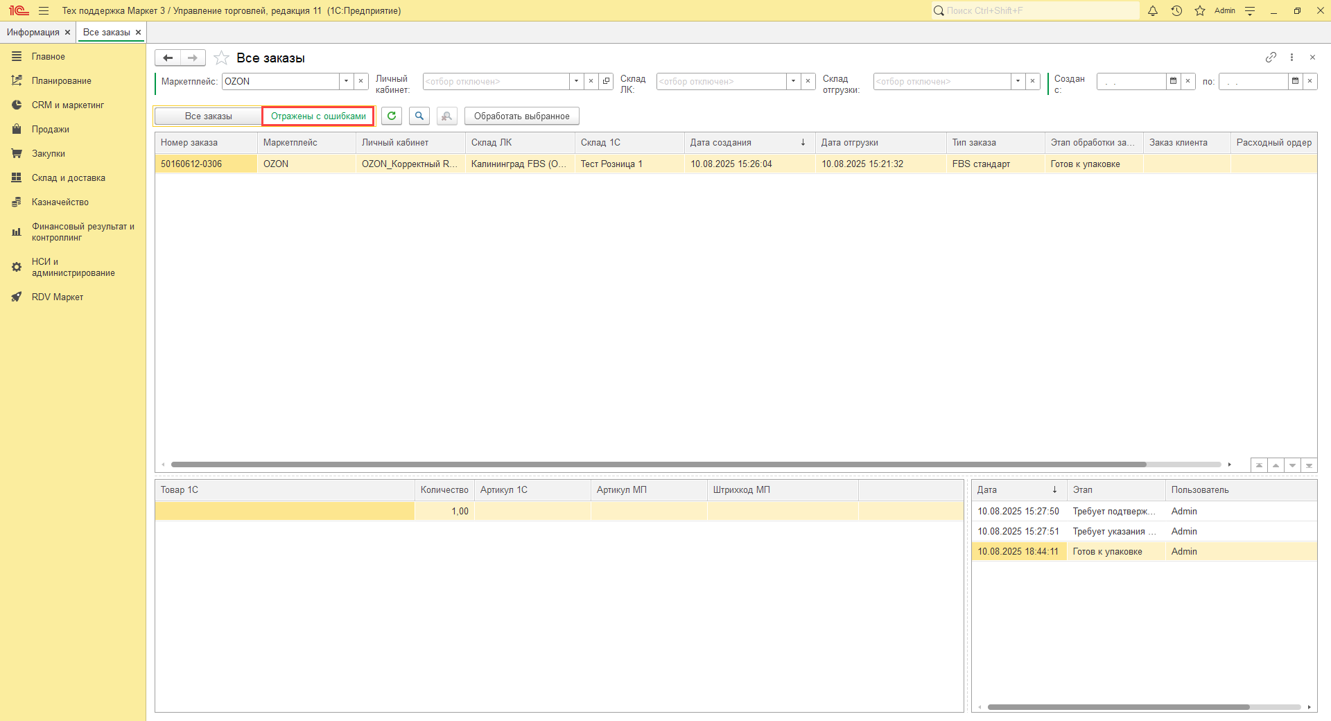 На данной вкладке можно проверить: по каким заказам маркетплейса не удалось отразить типовые документы 1С: