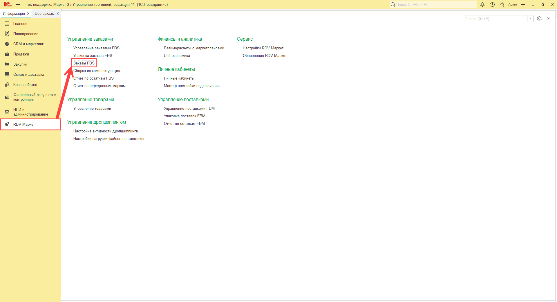 В релизе RDV Маркет 3.0.19 появилось новое рабочее место "Заказы FBS".