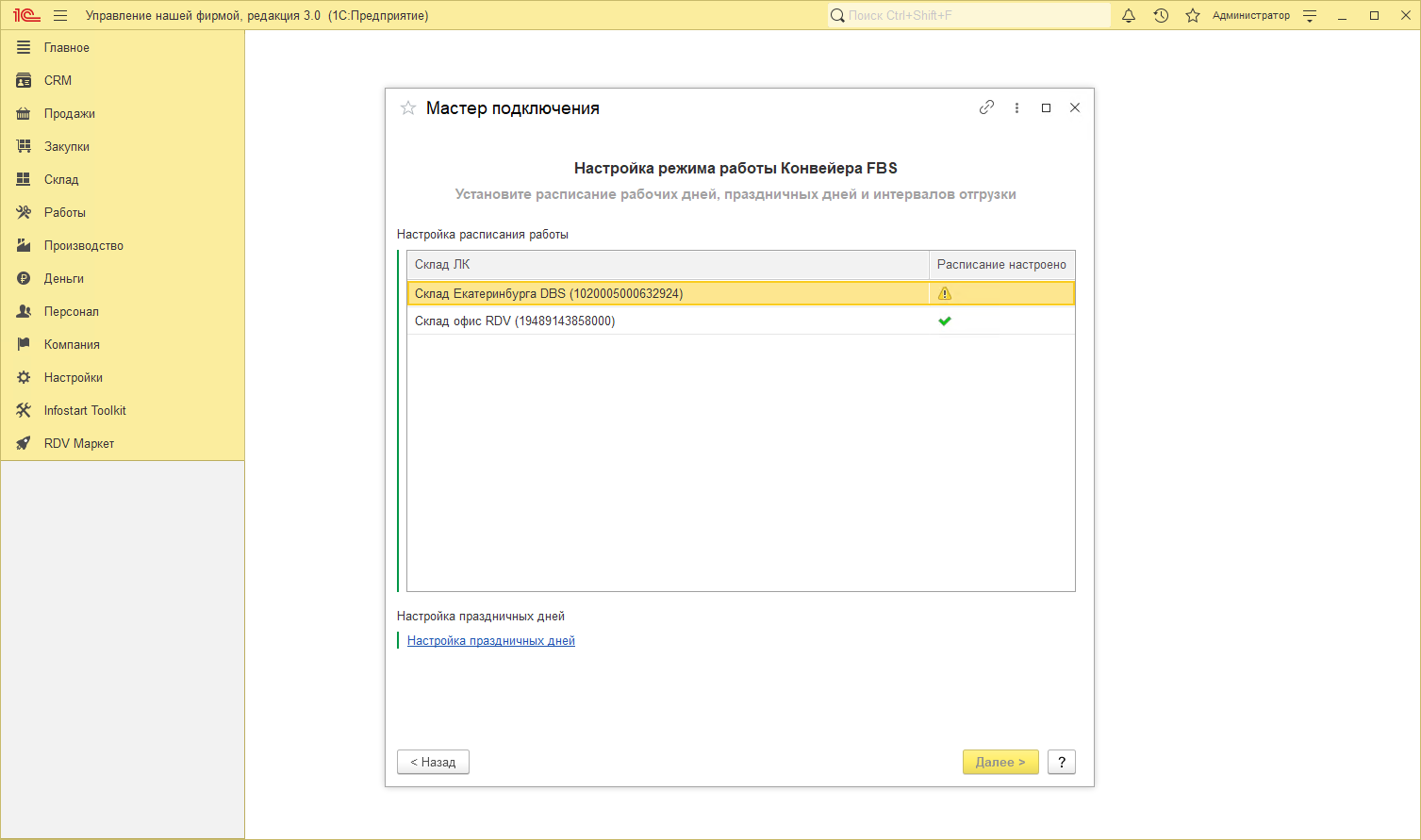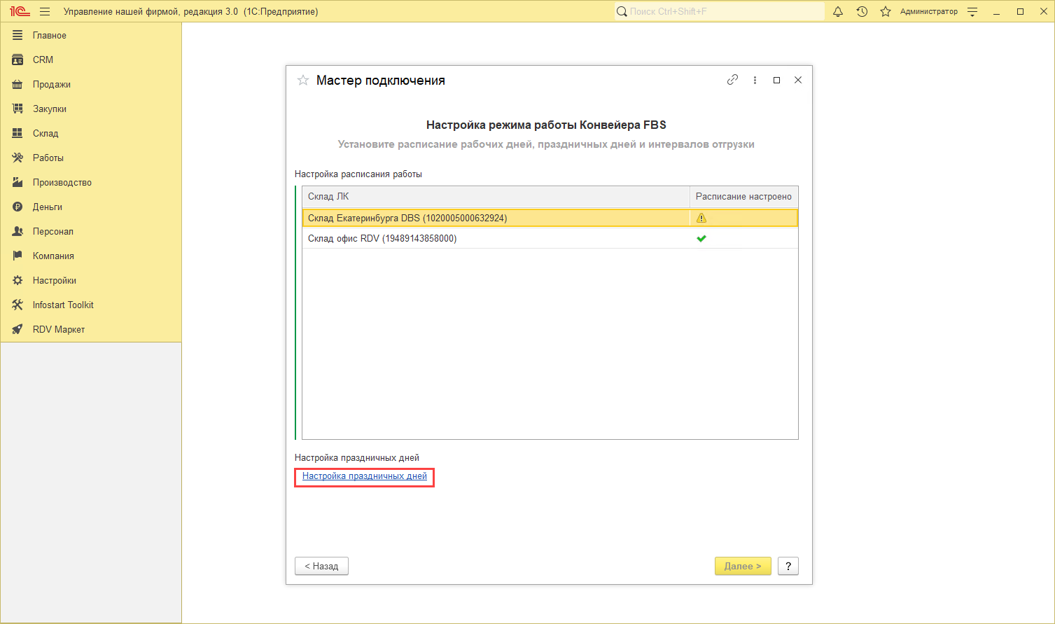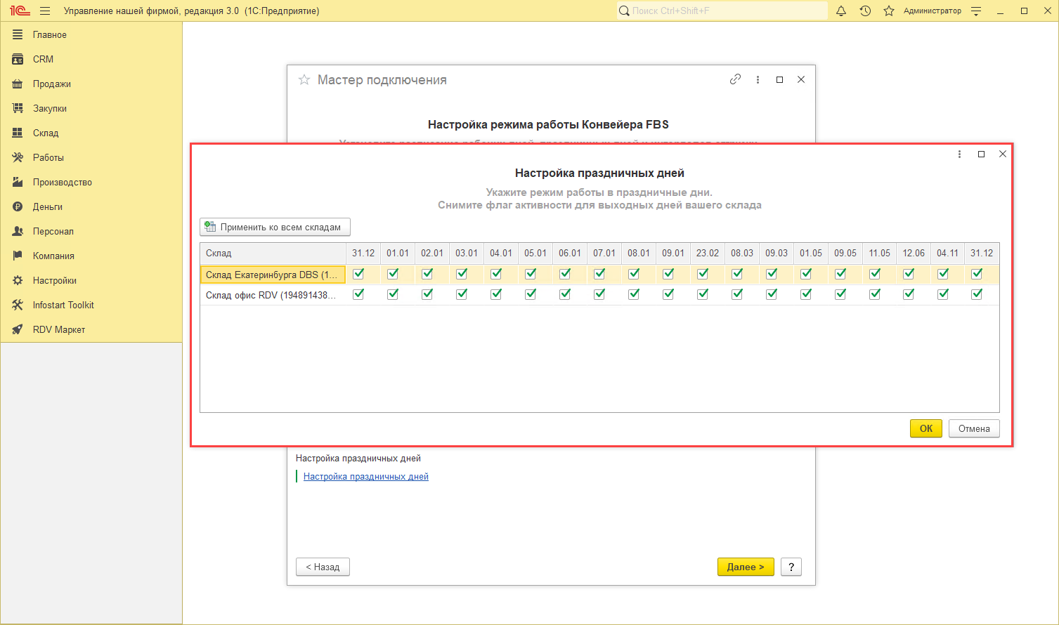 В открывшемся окне для каждого склада необходимо снять галочки с праздничных дней, в которые не должны создаваться отгрузки: