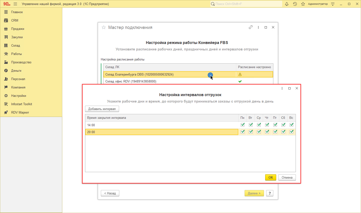 Выбрать склад, для которого выполняется настройка, указать интервал закрытия отгрузки и выбрать рабочие дни недели: