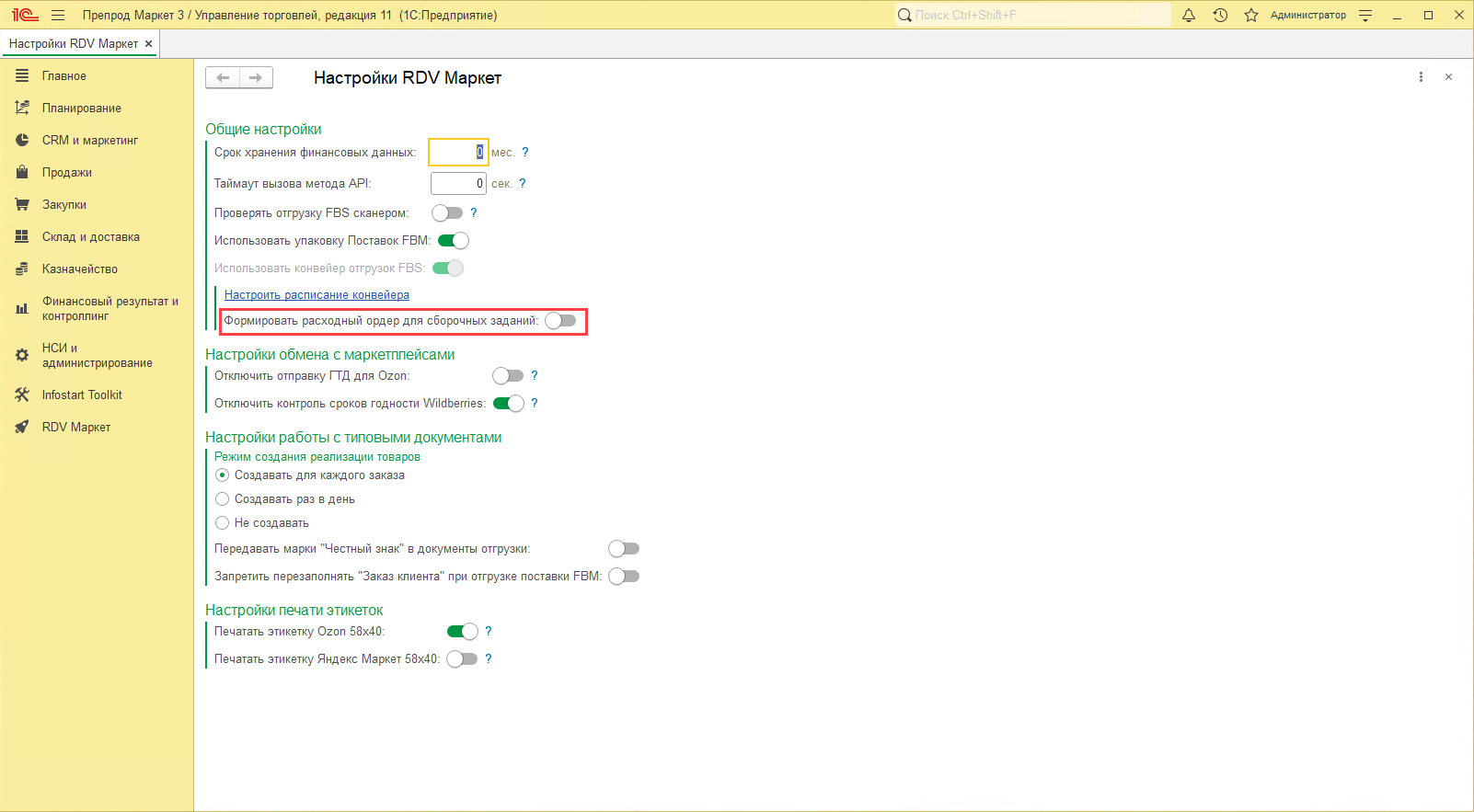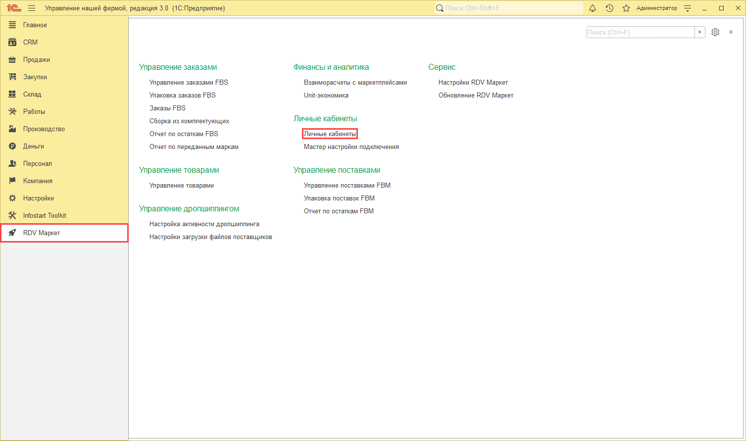 Настройка выполняется при создании личного кабинета или в разделе "RDV Маркет" - "Личные кабинеты":