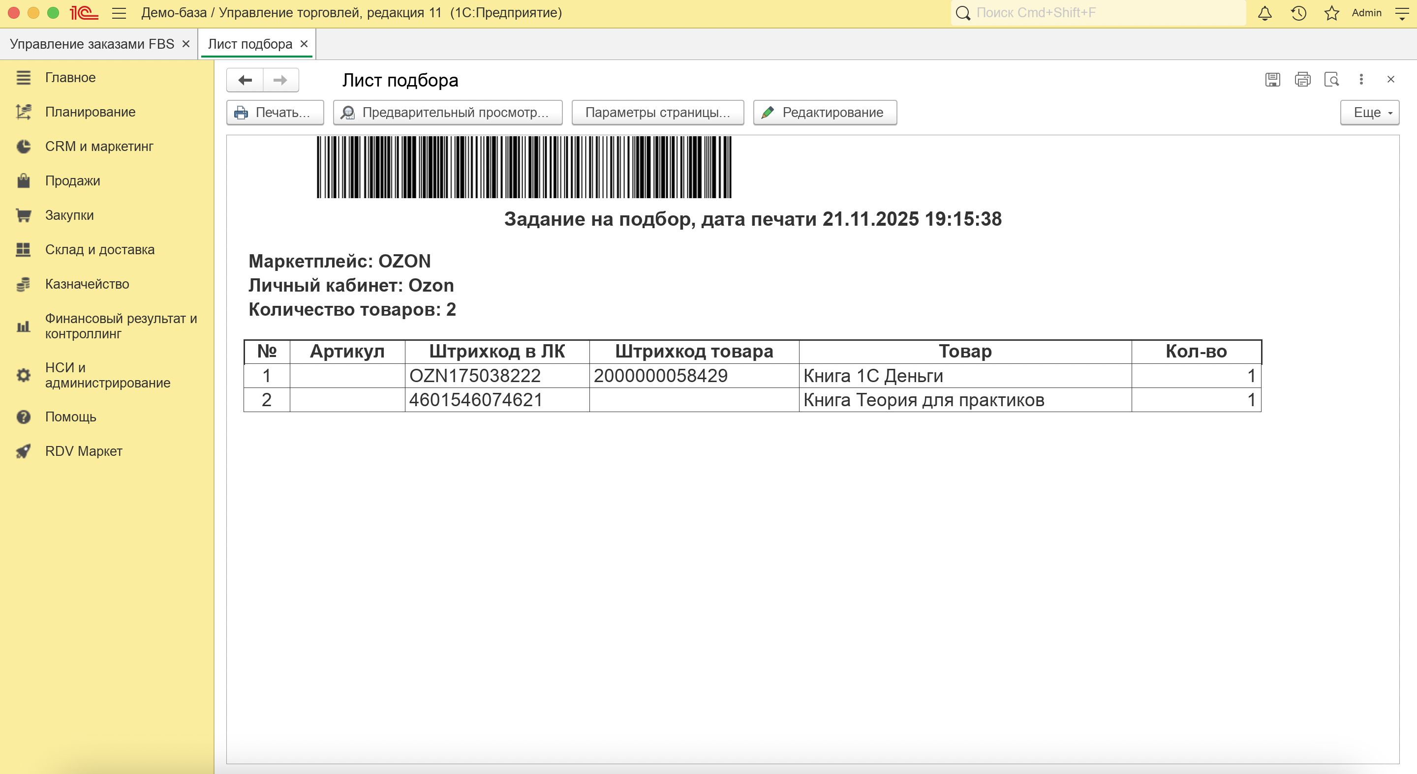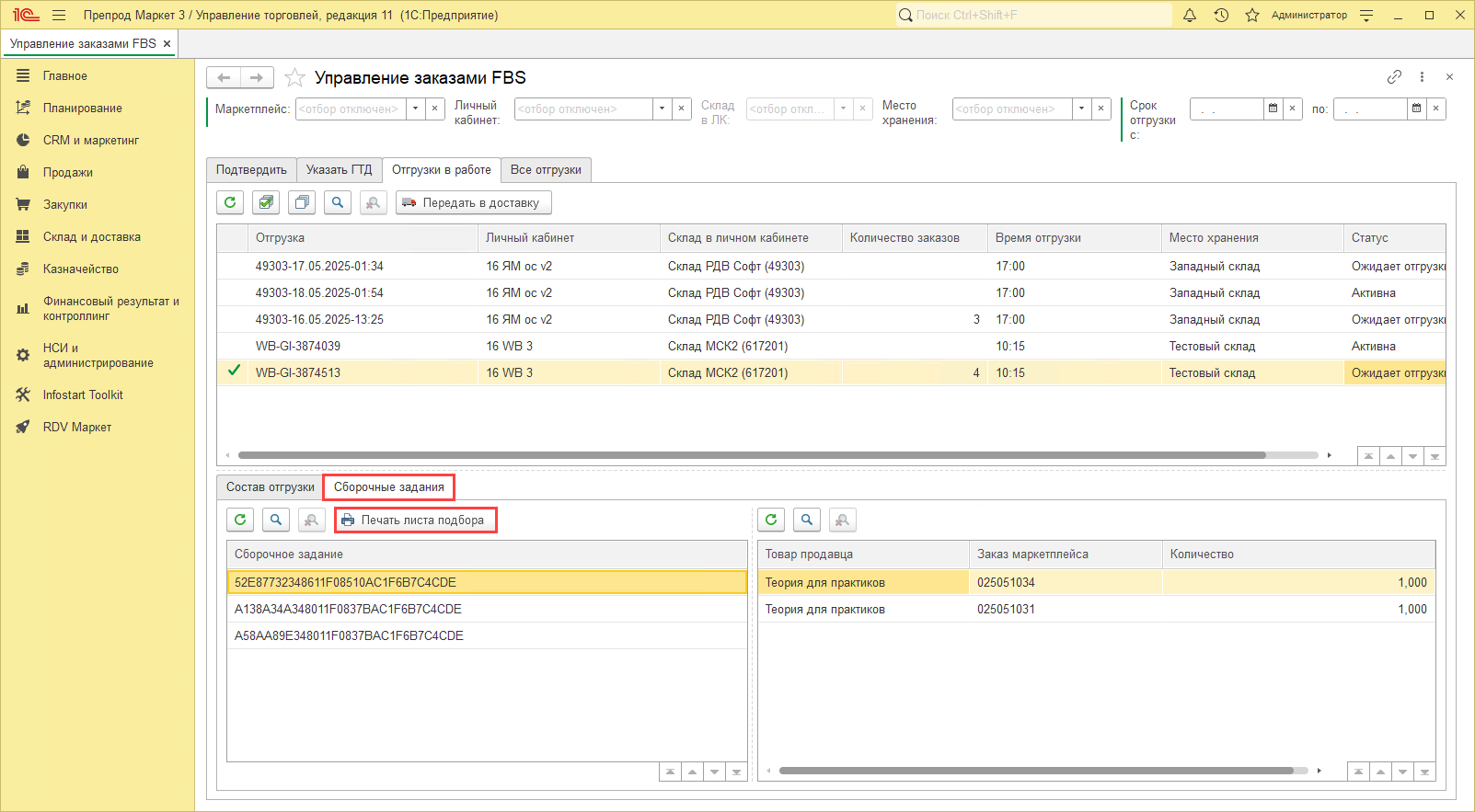 Распечатайте Лист подбора в Рабочем месте "Управление заказами FBS" со вкладки "Отгрузки в работе" - "Сборочные задания"