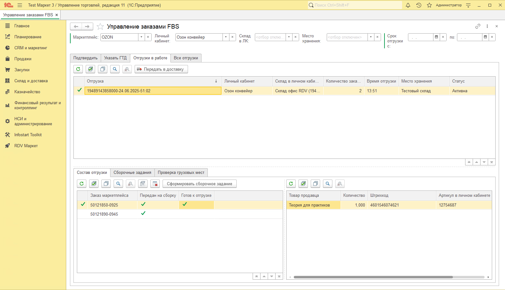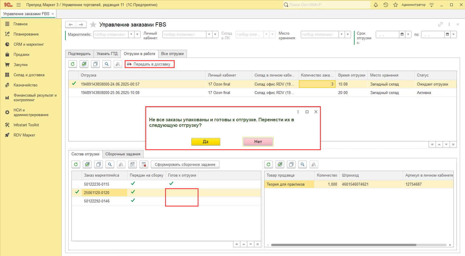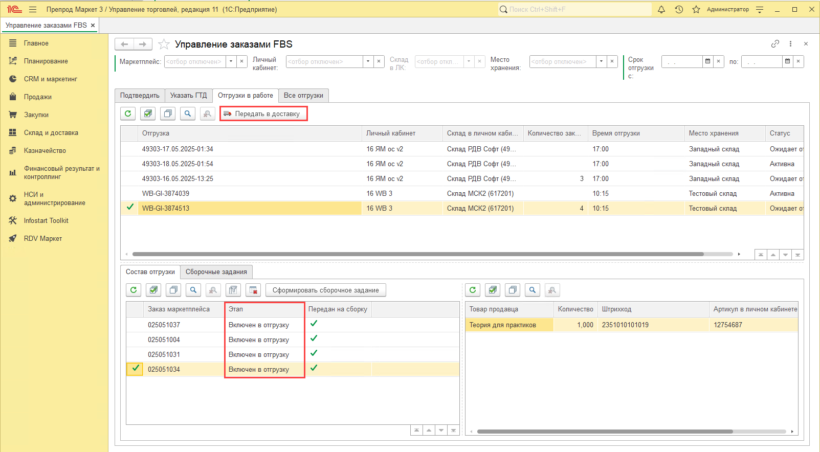 После чего можно передать в доставку текущую отгрузку.