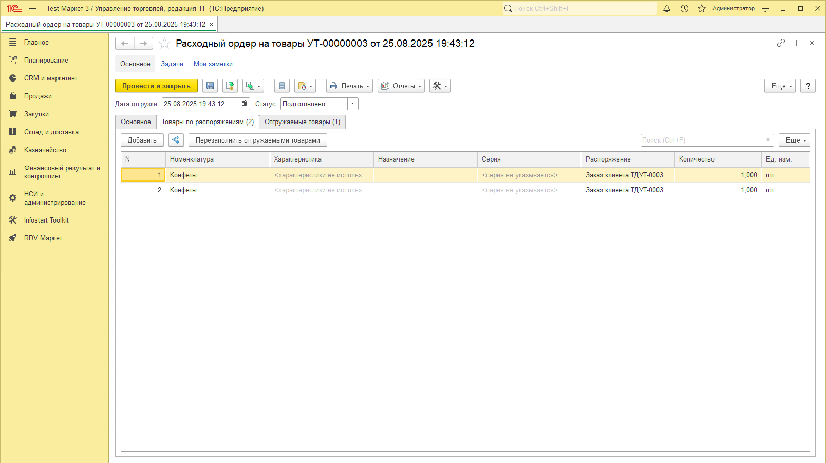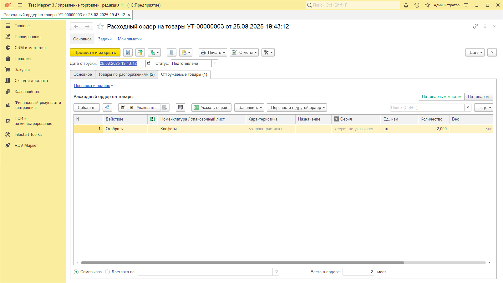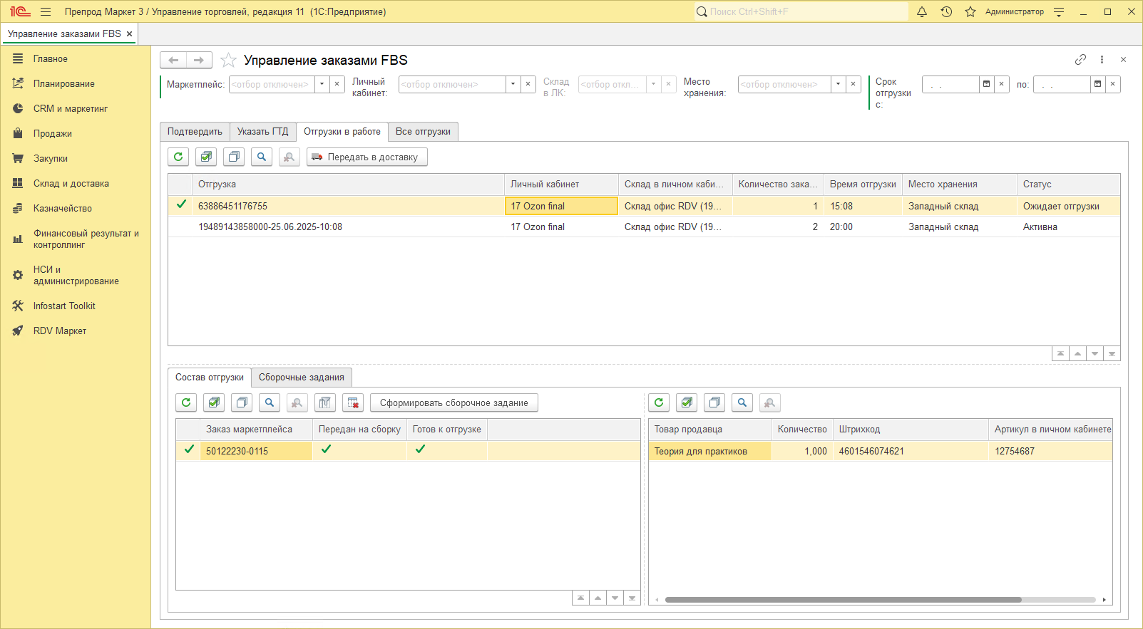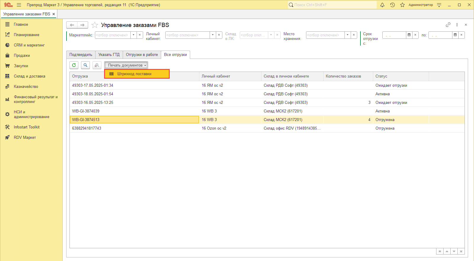 После чего можно передать в доставку текущую отгрузку.