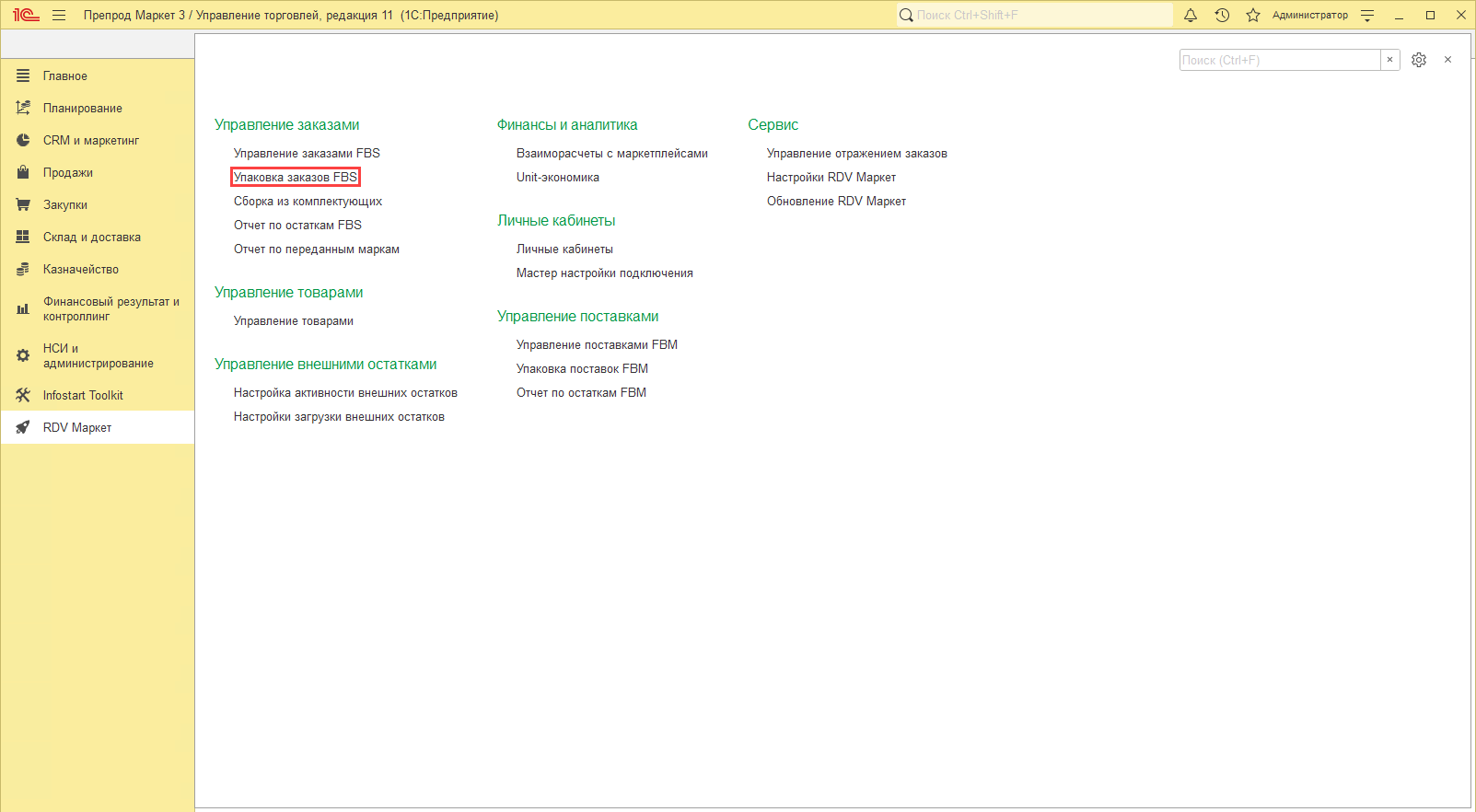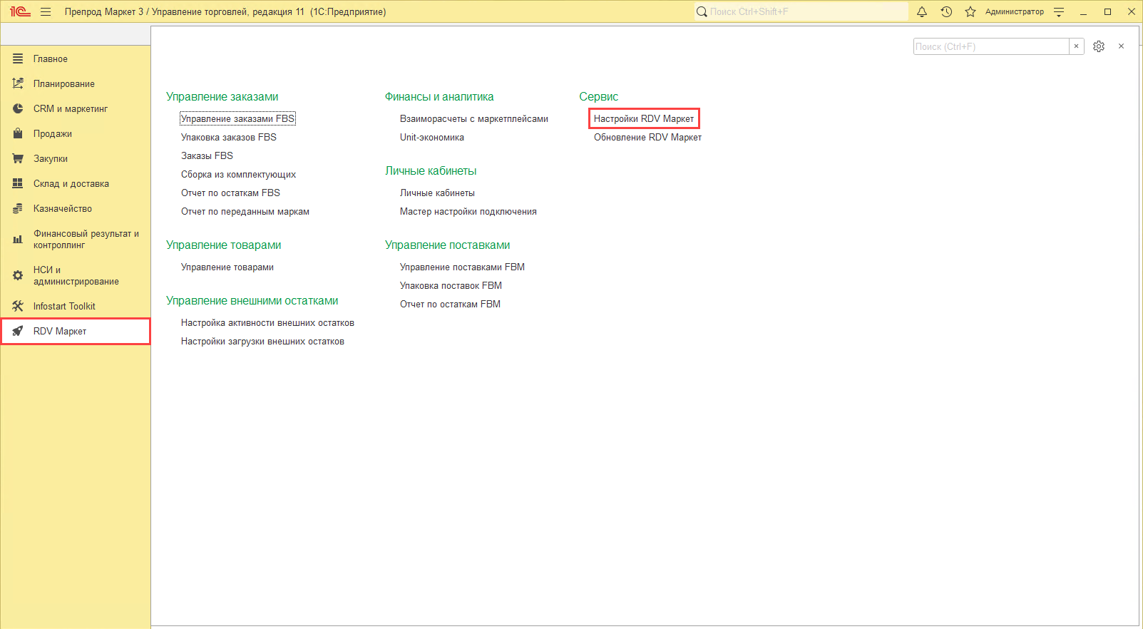 Для того чтобы включить данную настройку в разделе "RDV Маркет" откройте "Настройки RDV Маркет":