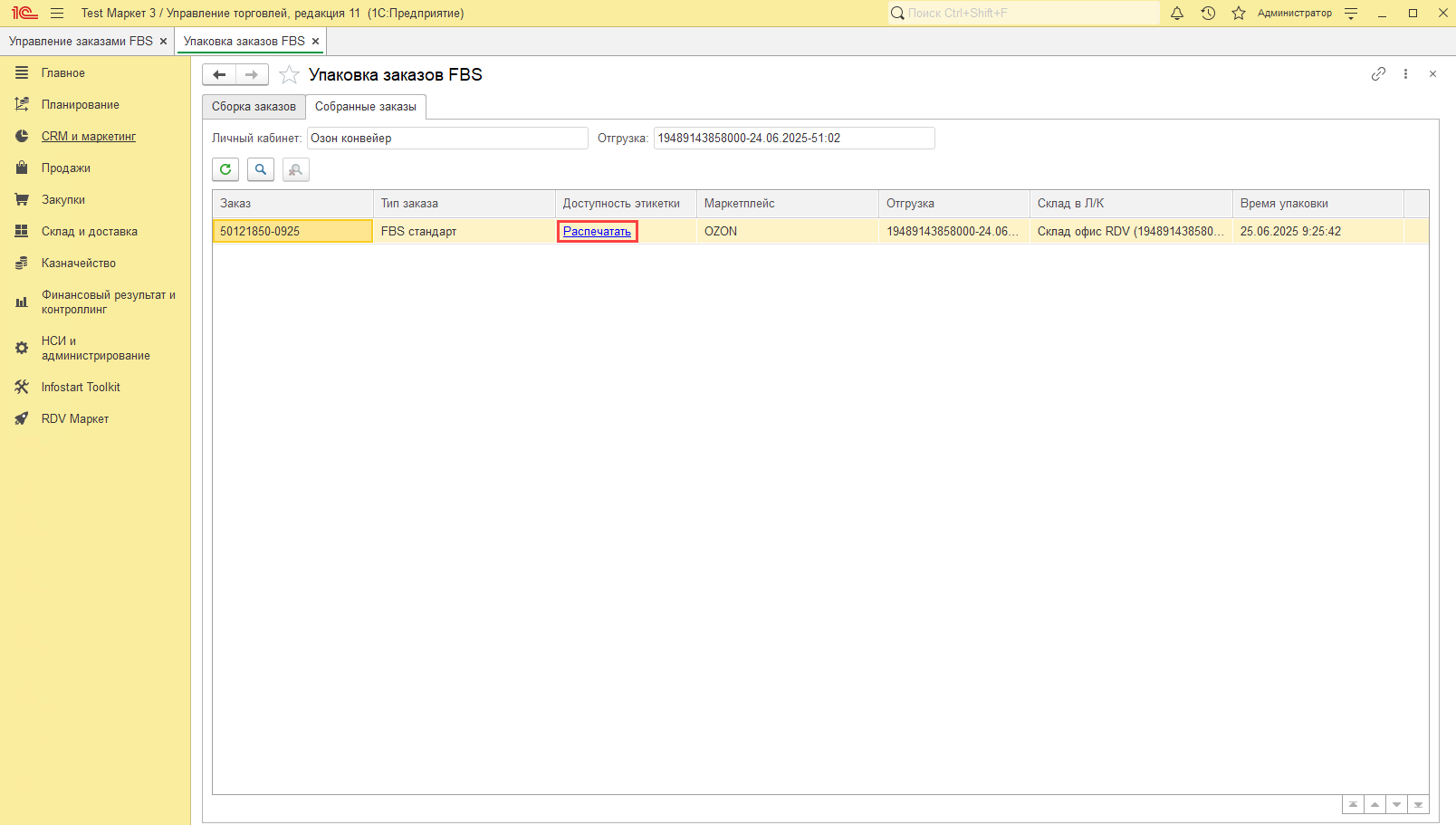 На вкладке "Собранные заказы" можно повторно распечатать этикетки и посмотреть точное время упаковки заказов: