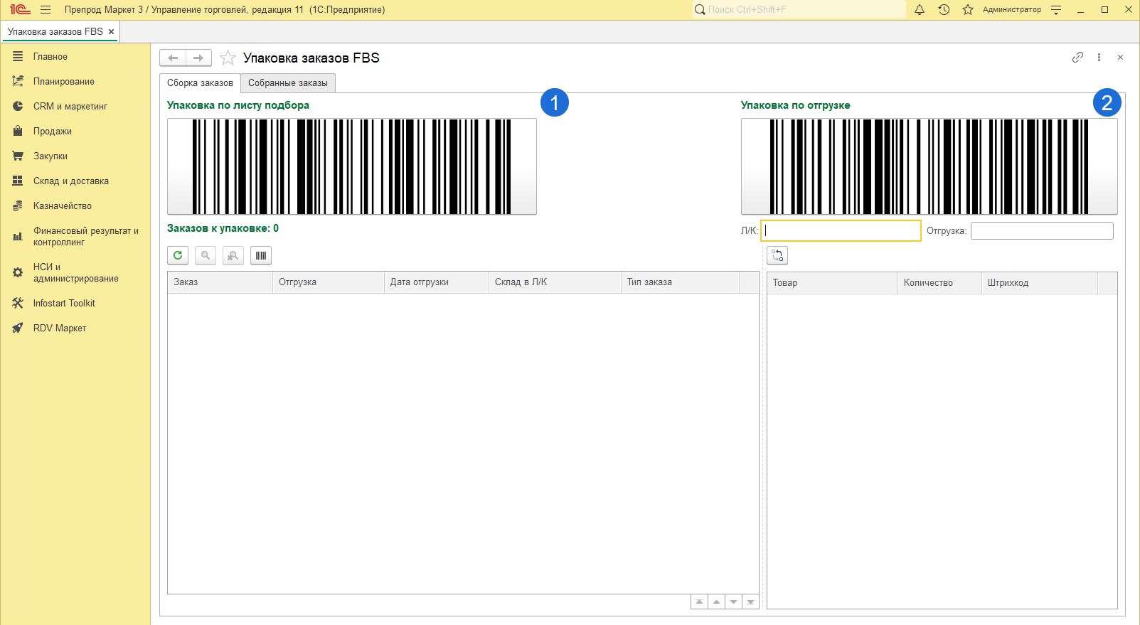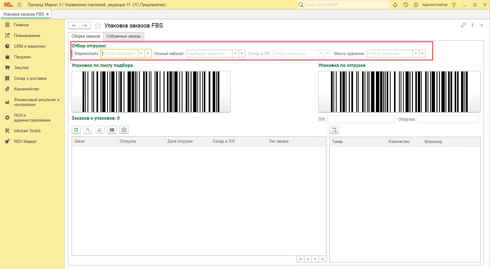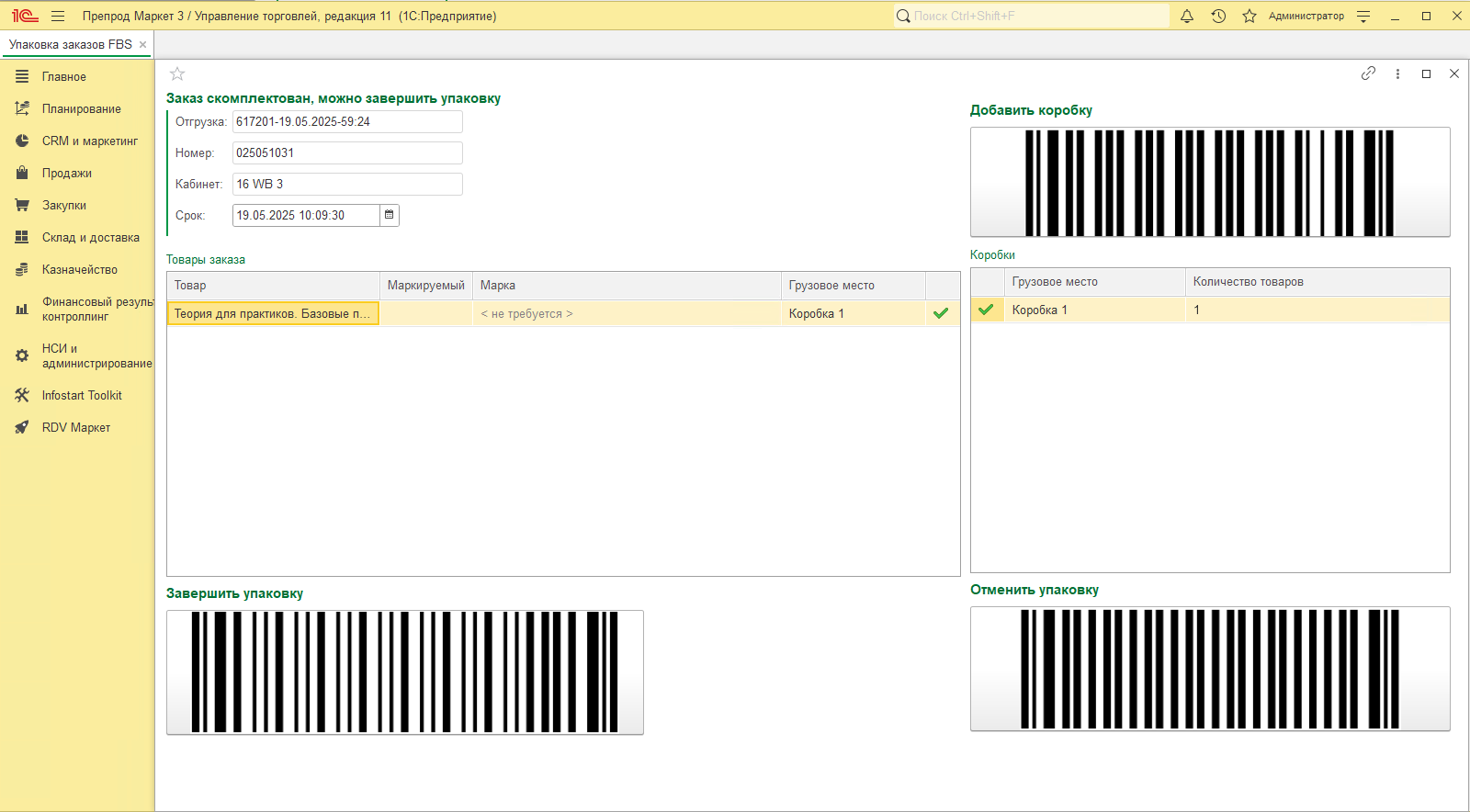 Добавлено отдельное рабочее место "Упаковка заказов FBS" для потоковой упаковки с помощью сканера: