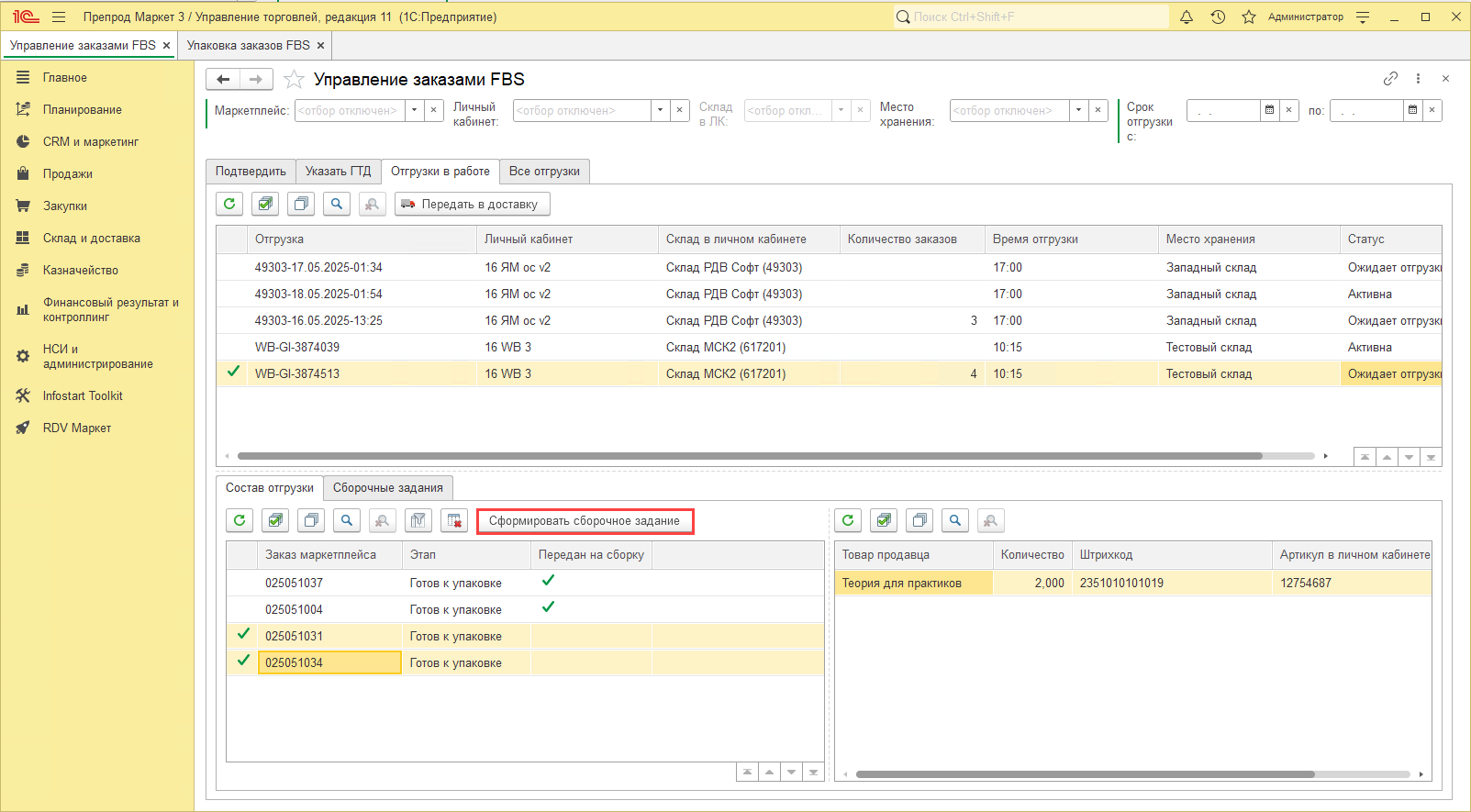 Для создания сборочного задания необходимо на вкладке "Состав отгрузки" выделить необходимые заказы и нажать на кнопку "Сформировать сборочное задание":