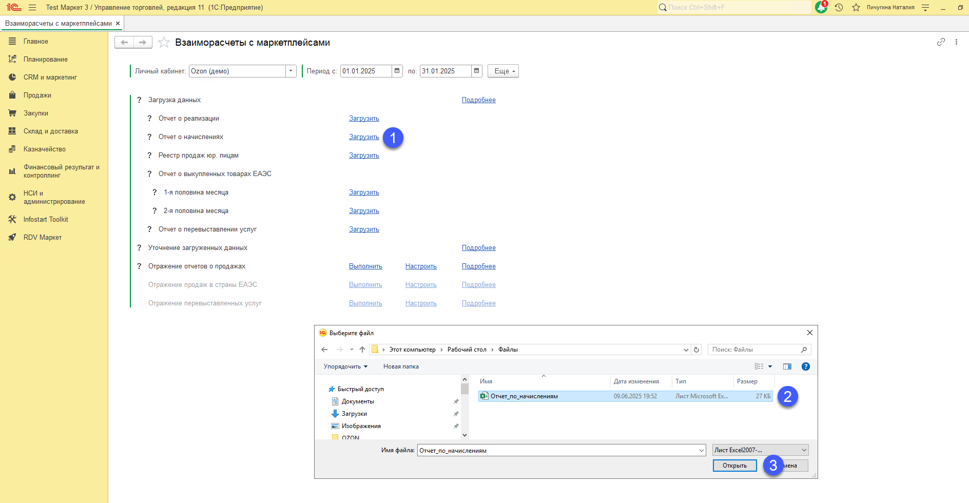 В рабочем месте "Взаиморасчеты с маркетплейсами" выберите личный кабинет и отчетный период загрузки (месяц).